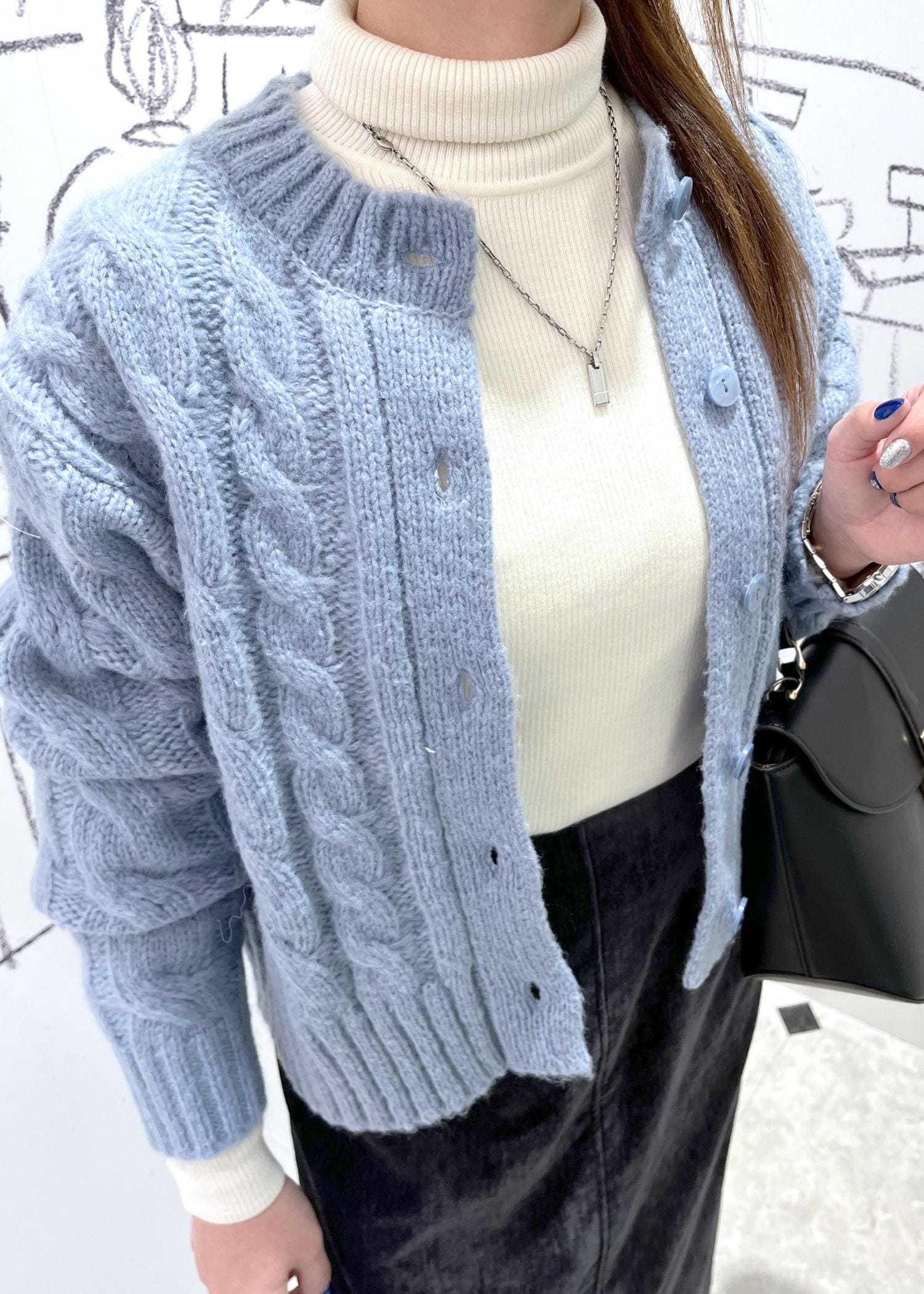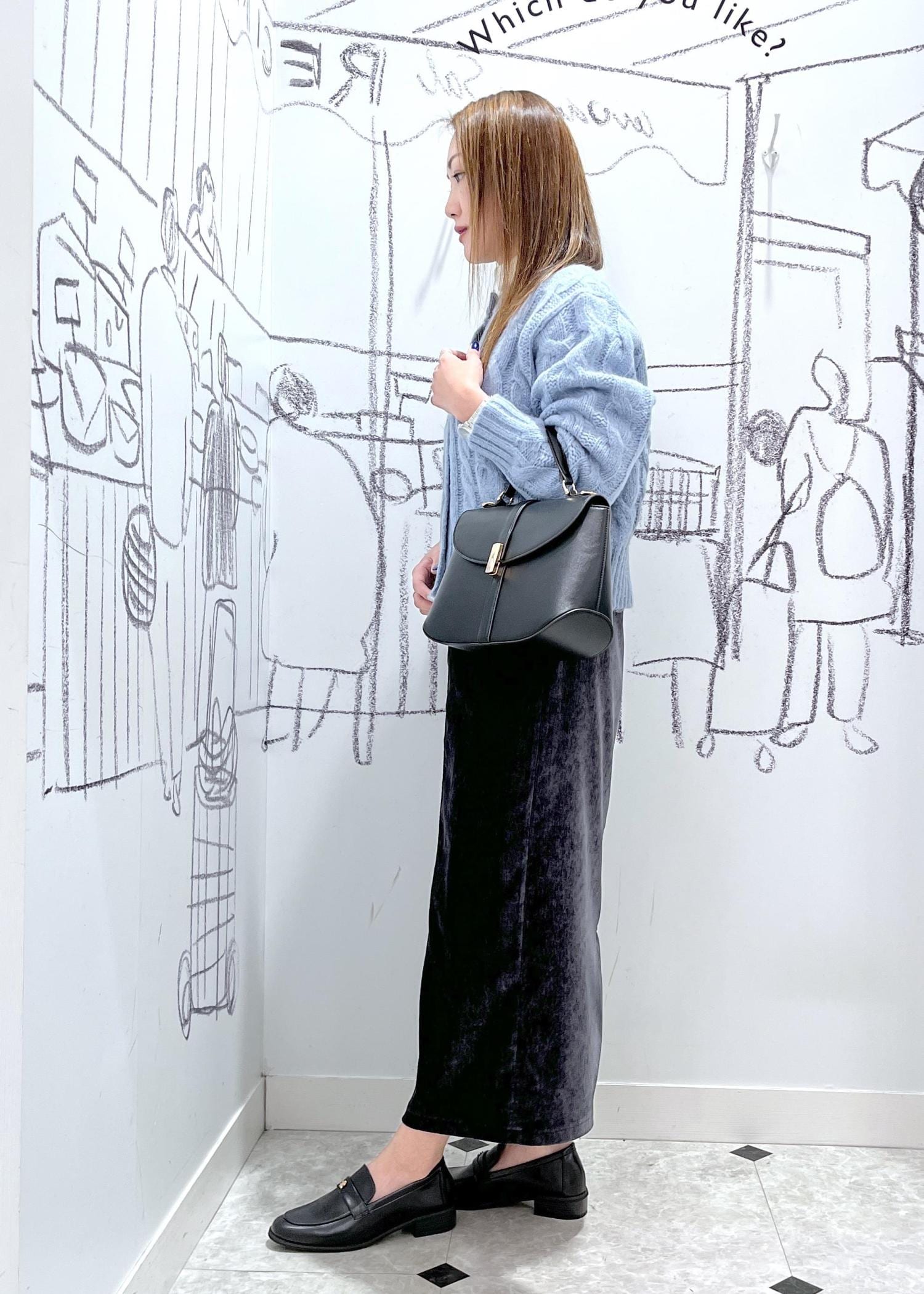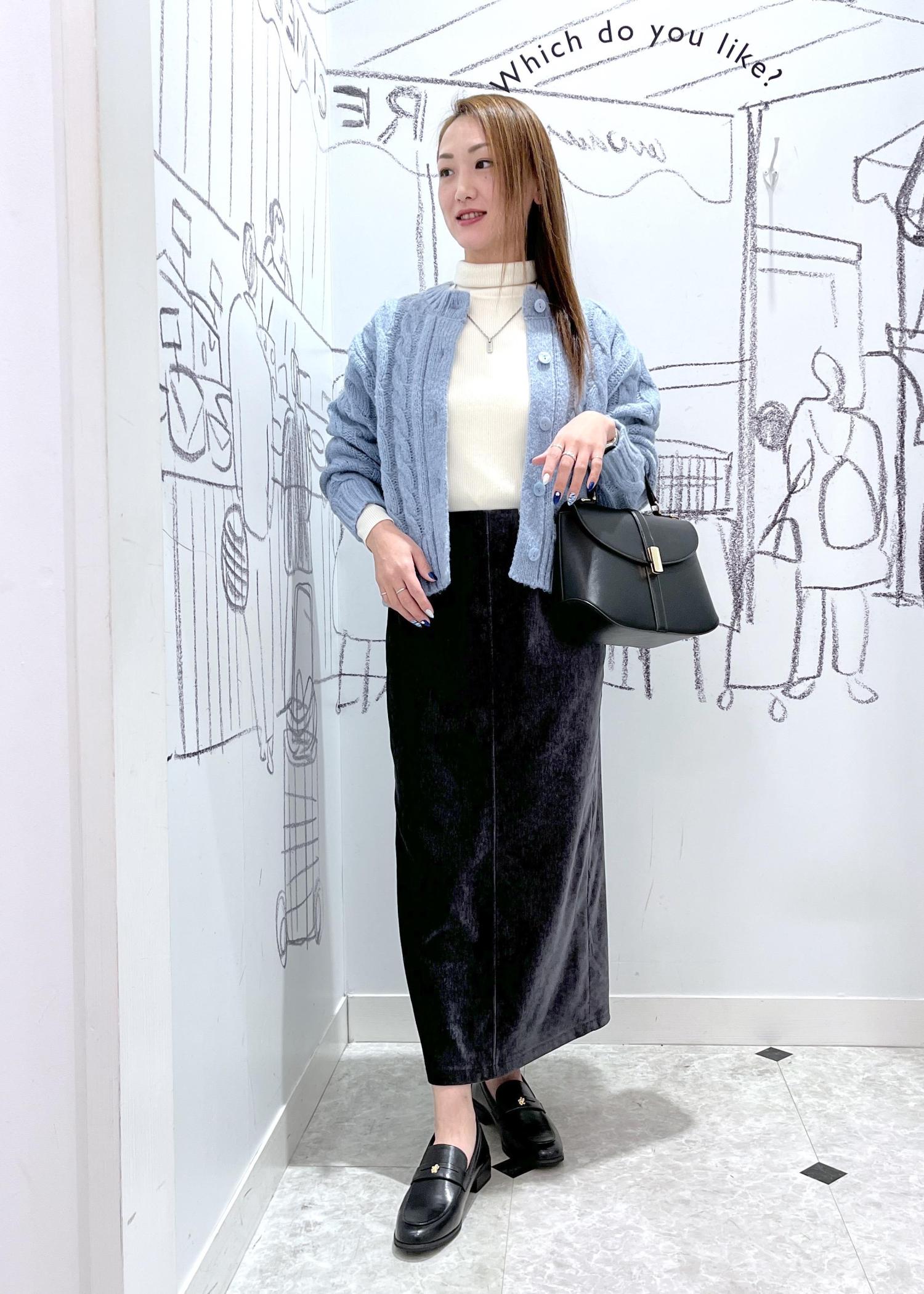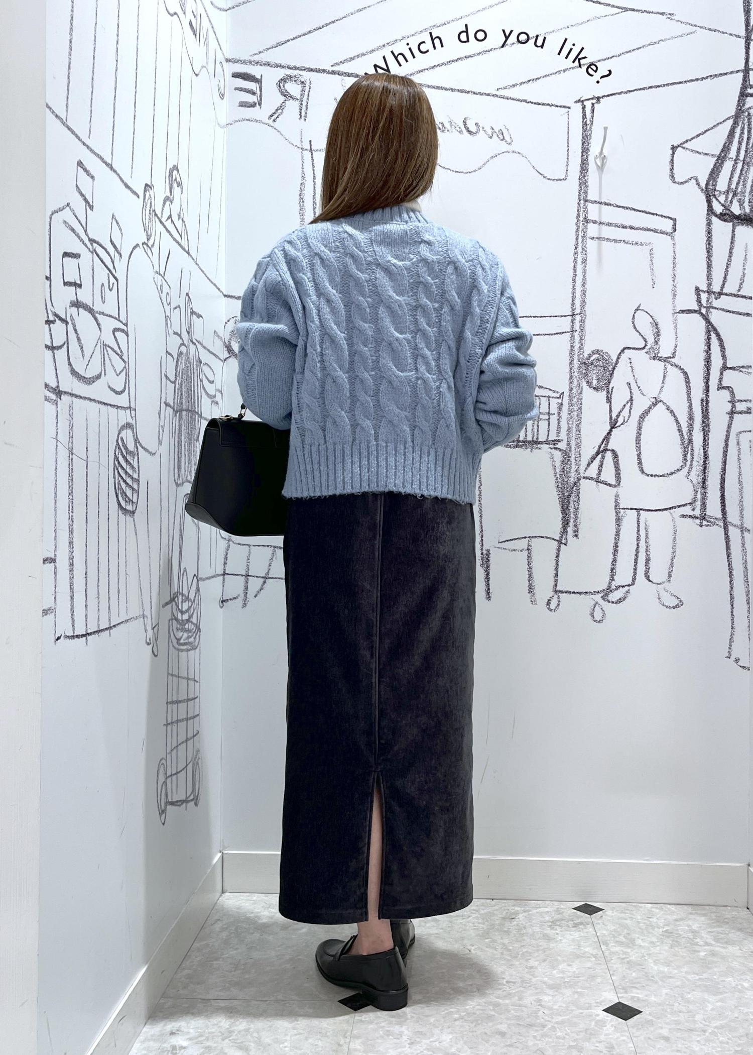 あったかくて可愛い冬のスカートコーデです。着丈短めで肉厚なカーディガンにすっきり見えするように、Iラインスカートを合わせました。素材感も暖か素材で冬らしく。可愛いケーブル編みのニットも大人っぽく見えるコーデ。
