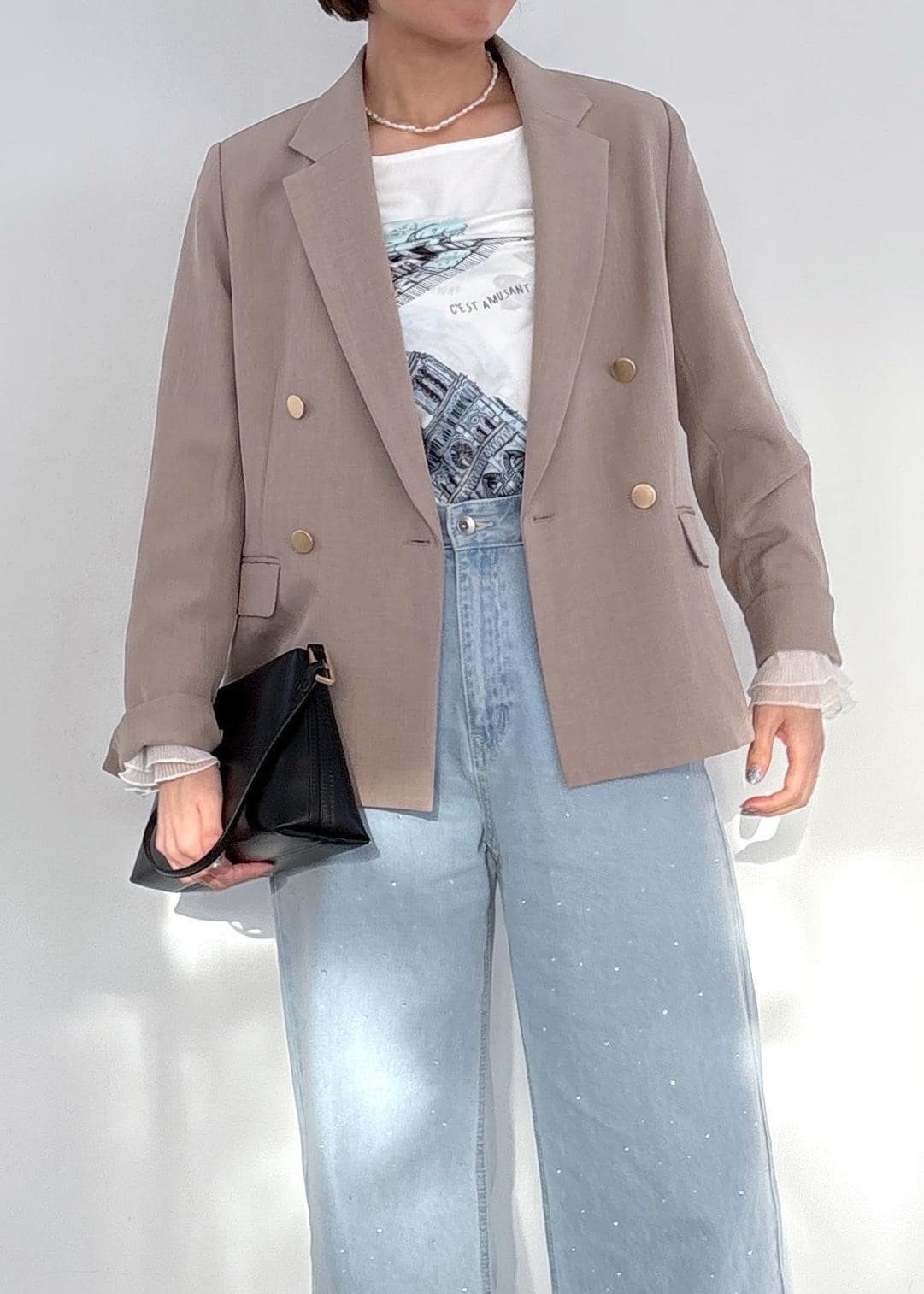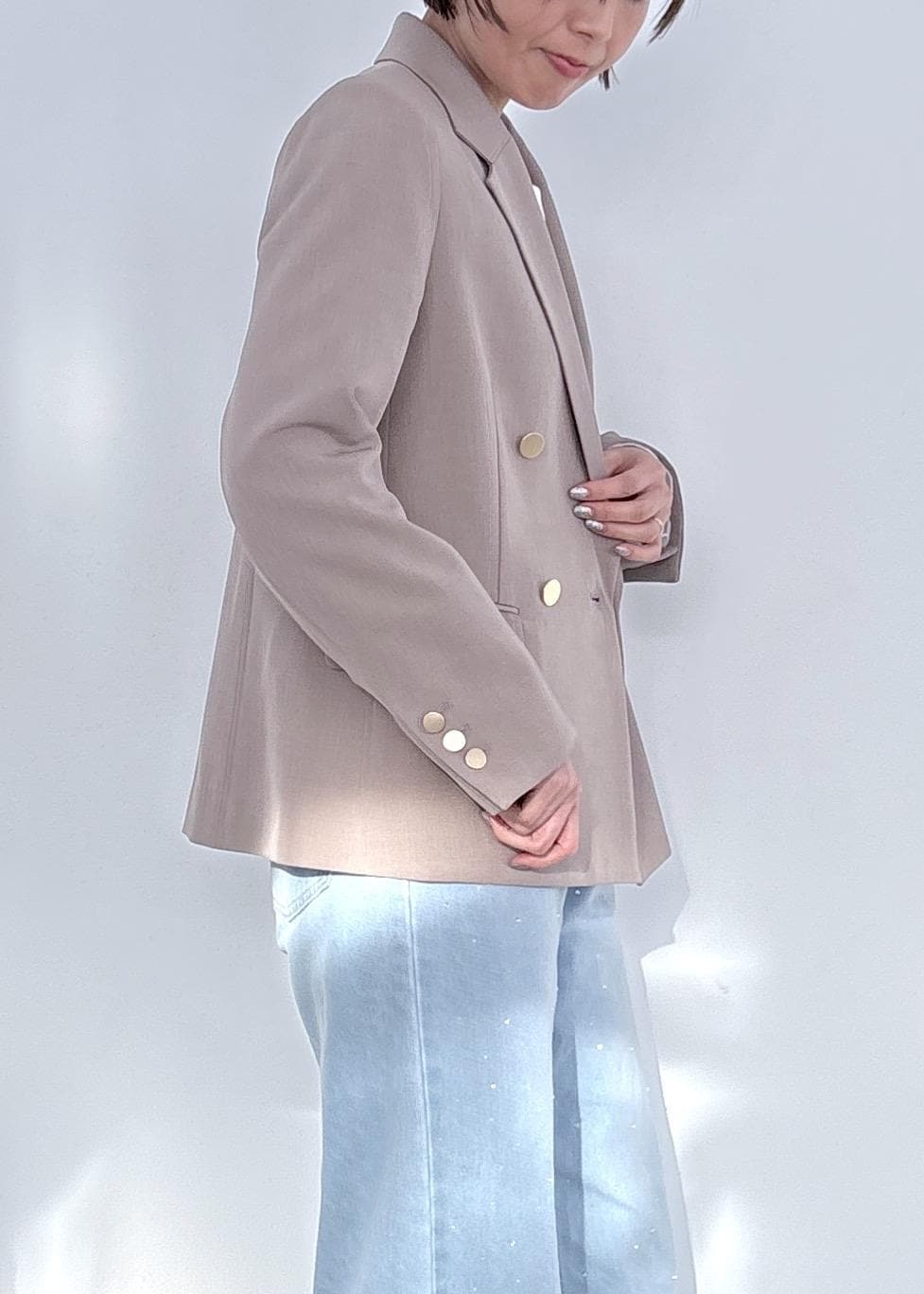 ベージュの金ボタンジャケットを