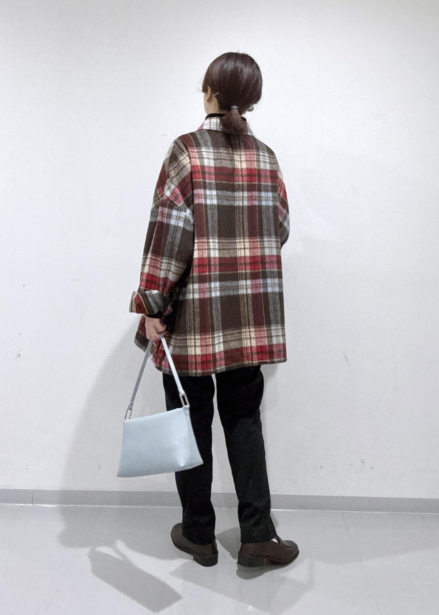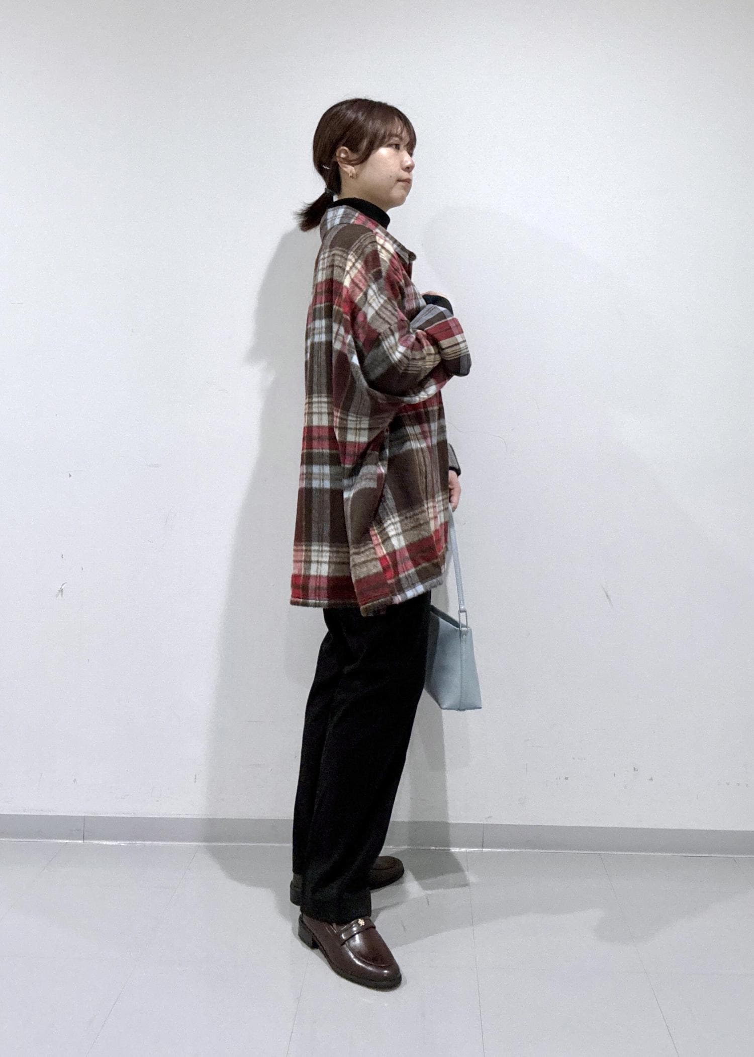 オーバーサイズのシャツにブラックのシンプルなアイテムで組み合わせたシンプルなスタイリングです。