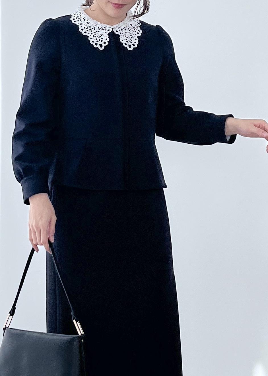襟付きトップスとレイヤードしたフェミニン系のセレモニースタイル。