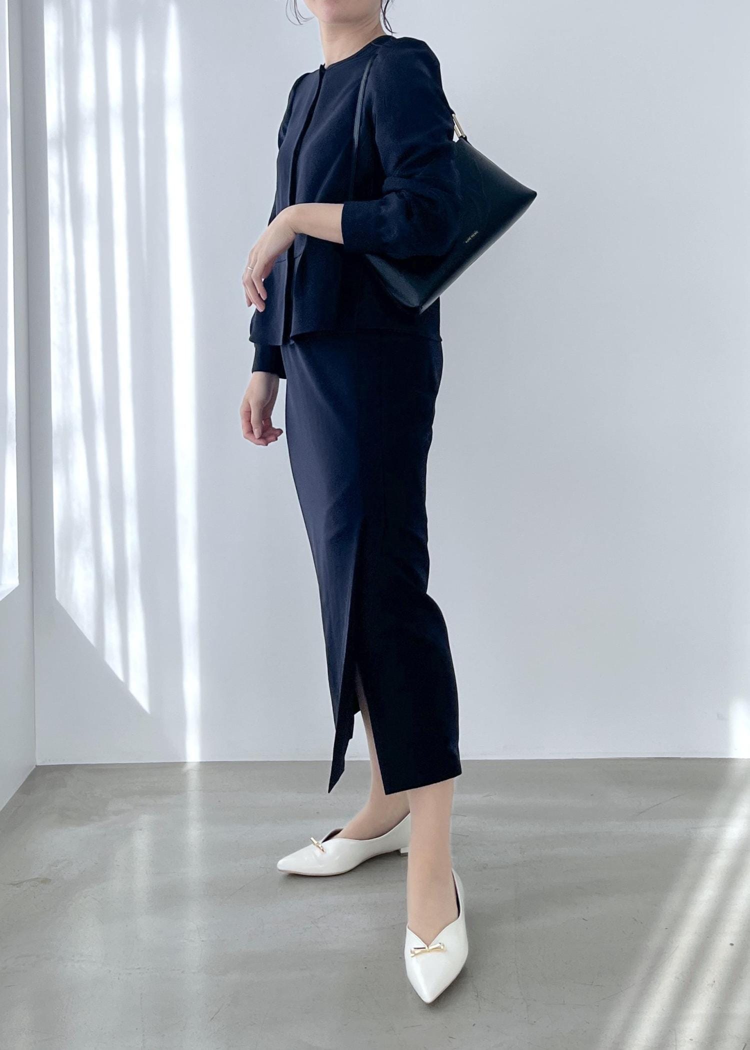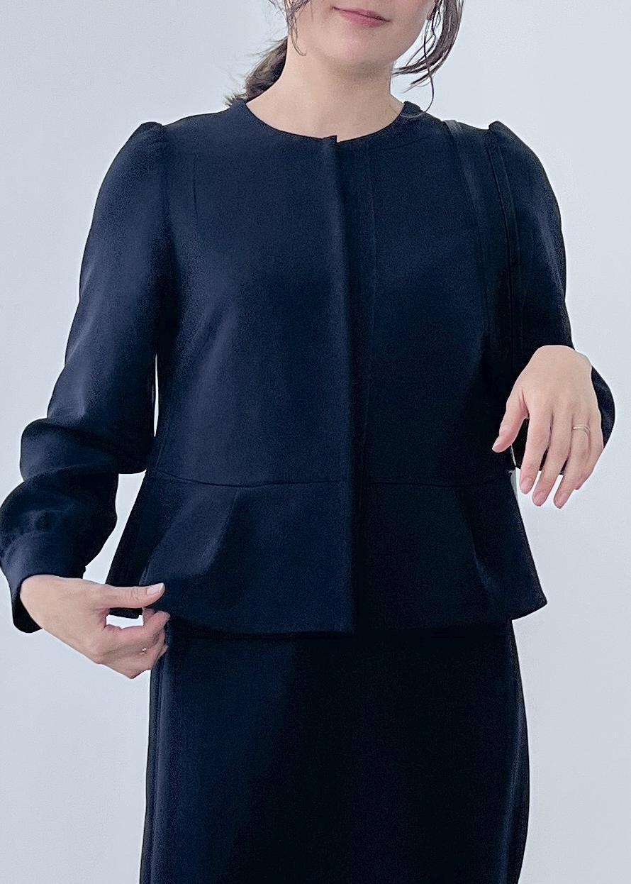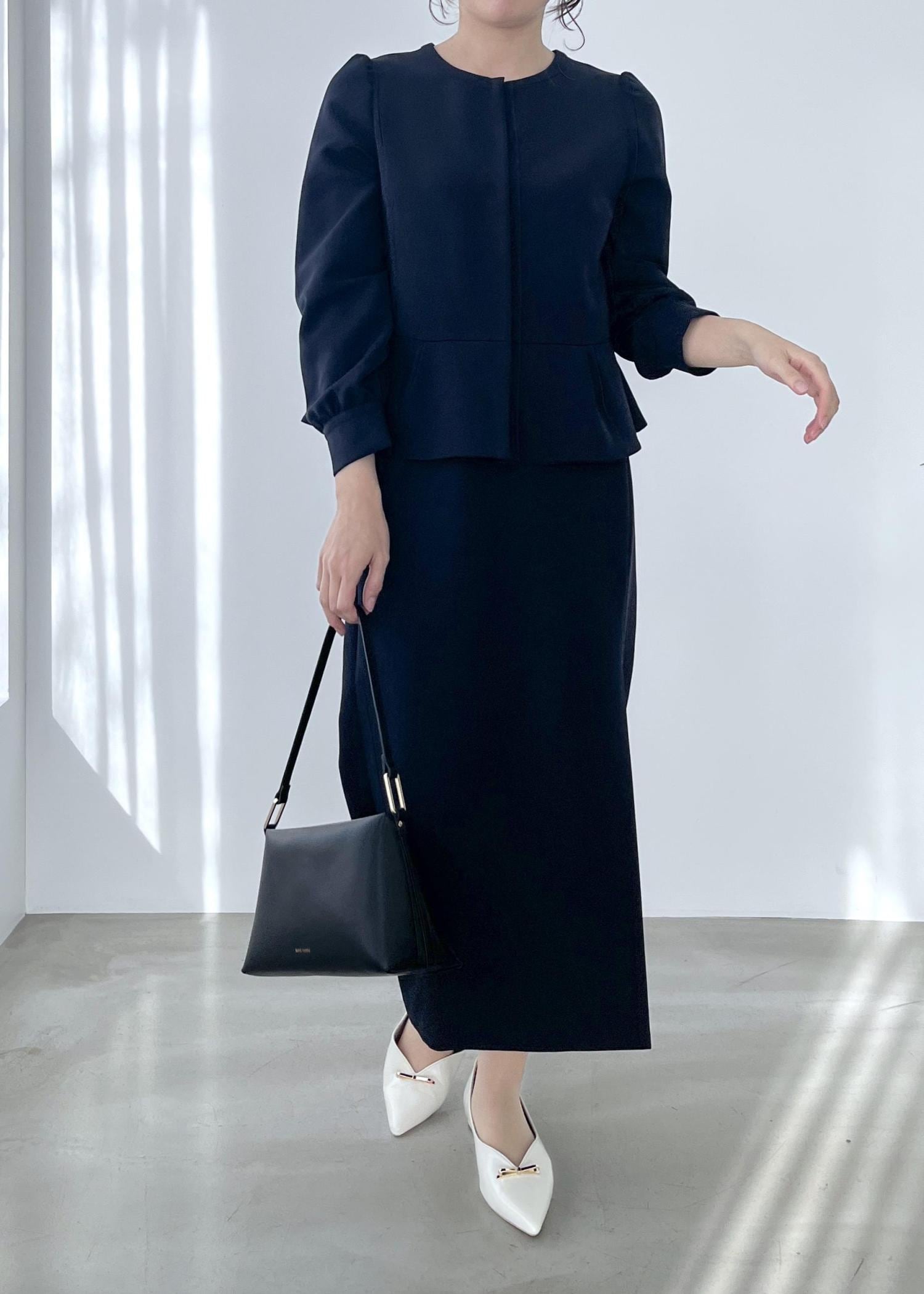 ペプラムデザインとスカートが女性らしい優しげな印象に。