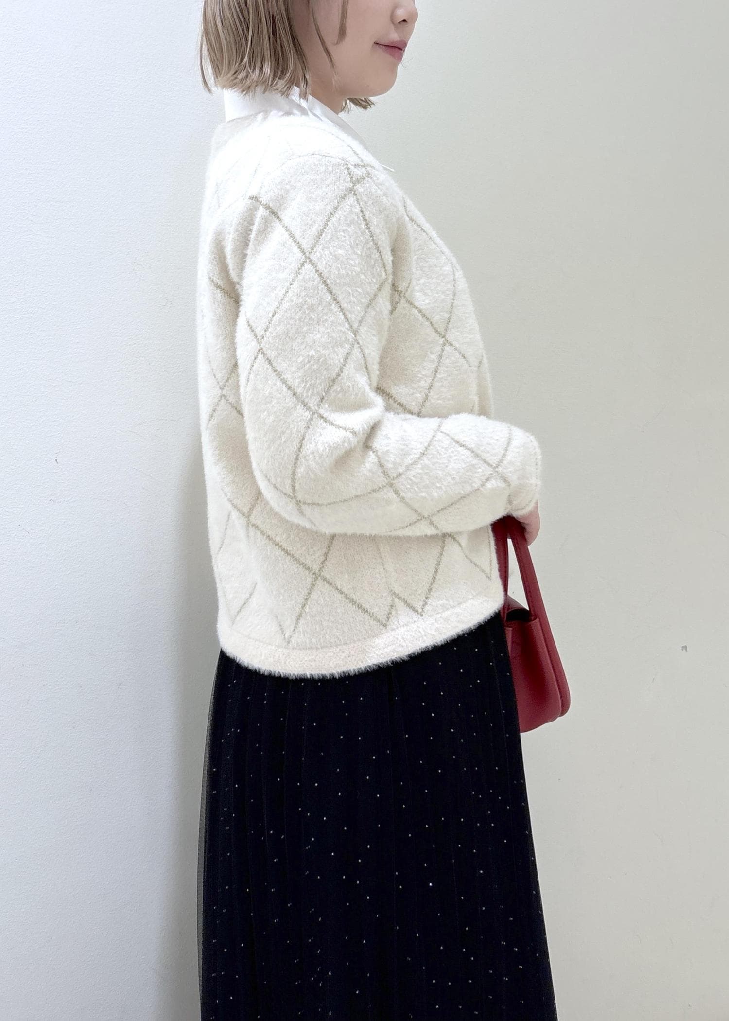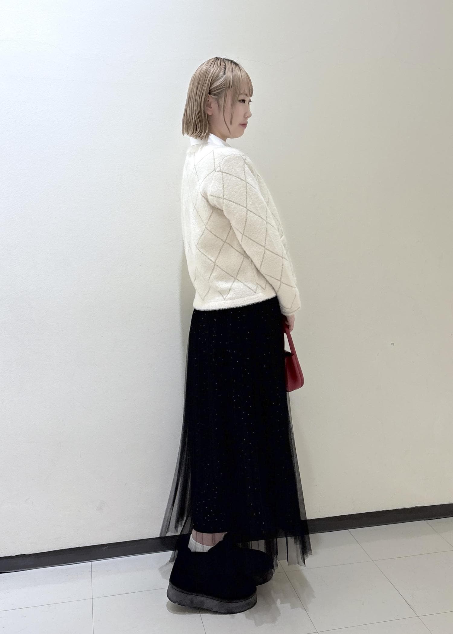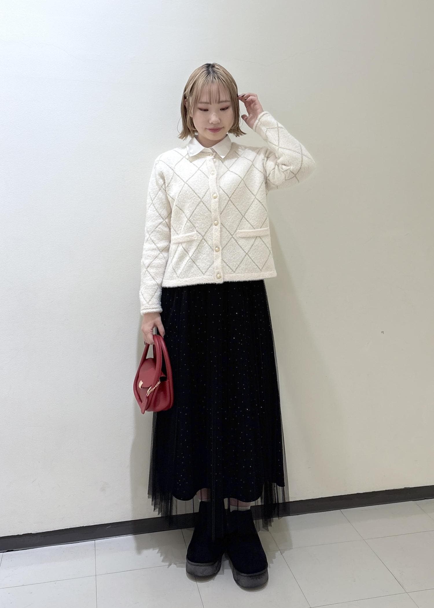ラメ感のあるカーディガンとスカートわ合わせた、ホリデーシーズンにぴったりの華やかなコーディネートです。