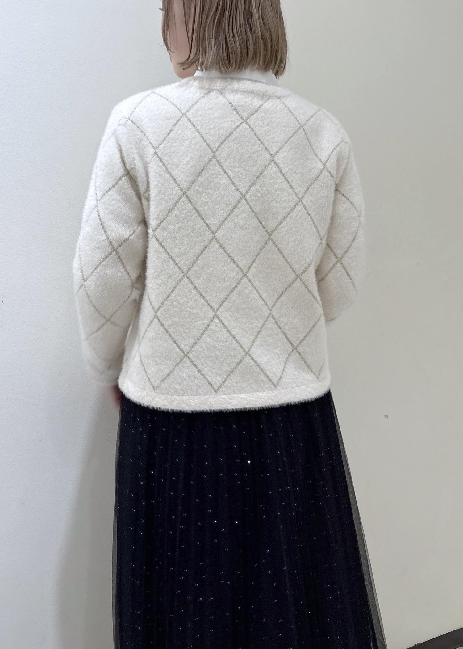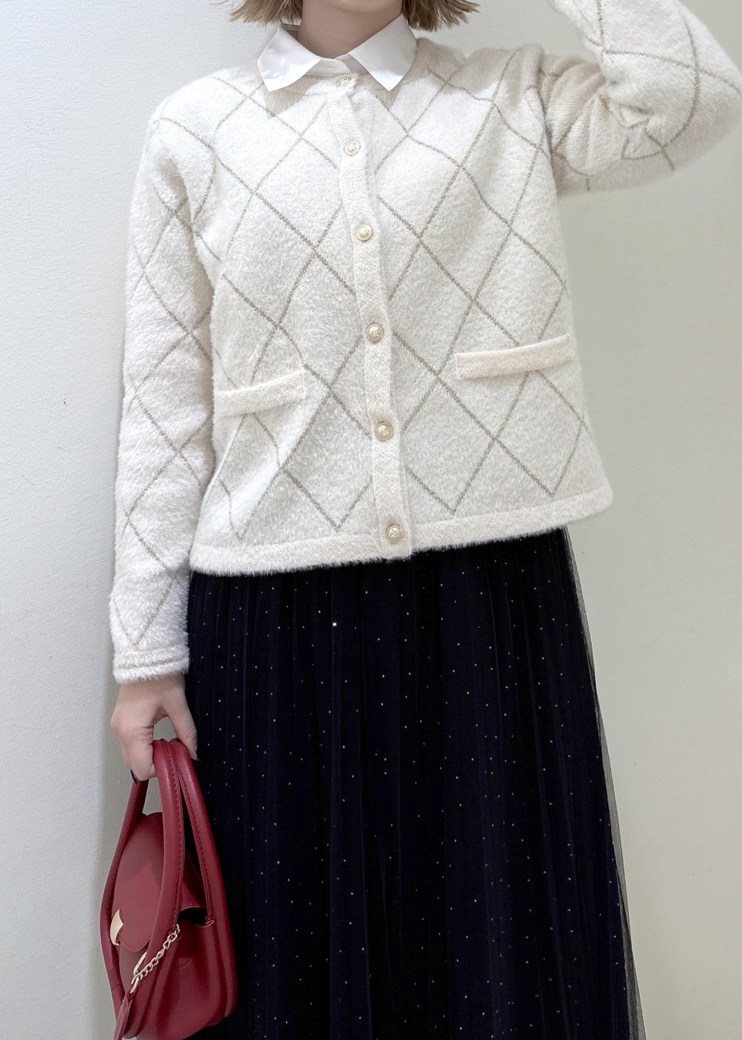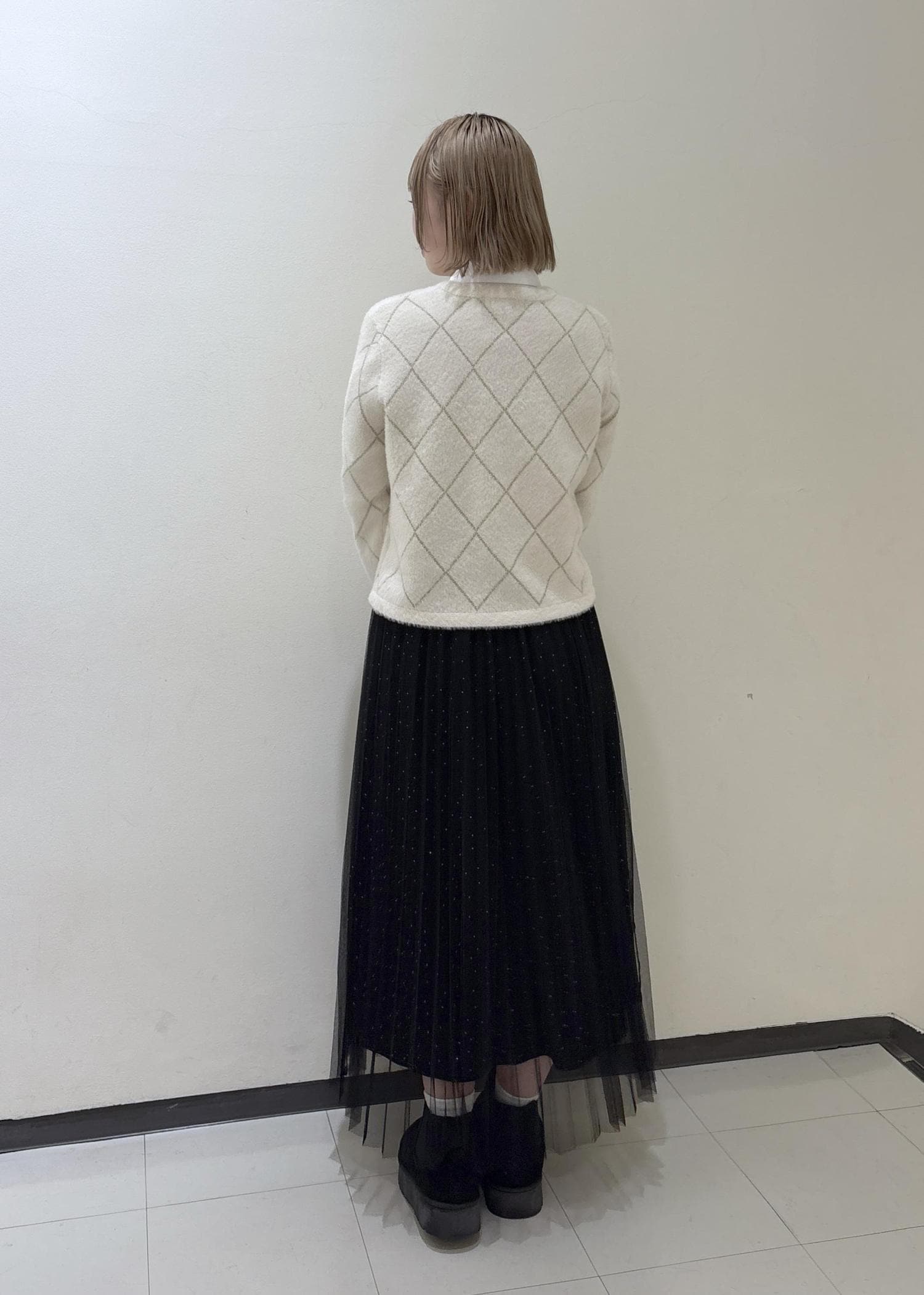 ラメ感のあるカーディガンとスカートわ合わせた、ホリデーシーズンにぴったりの華やかなコーディネートです。