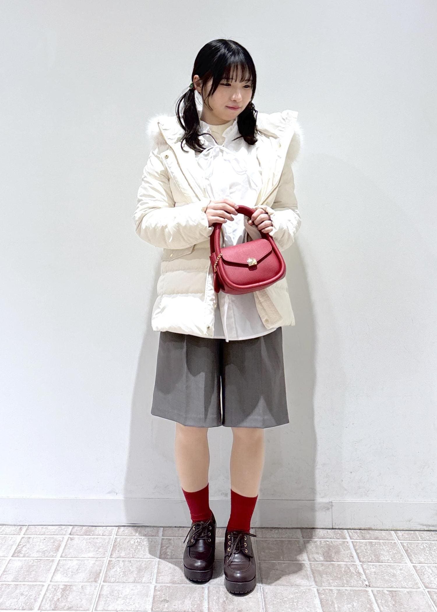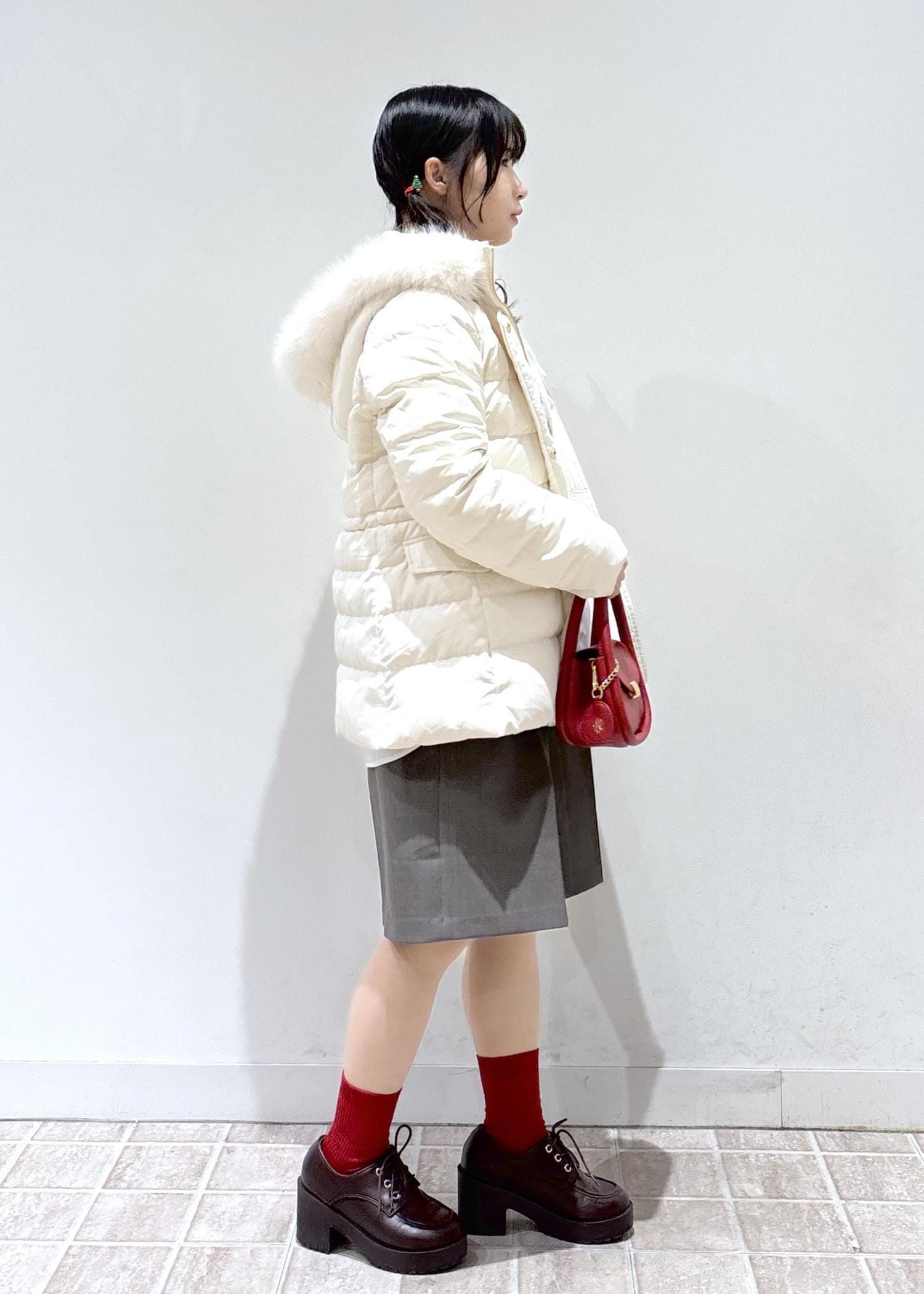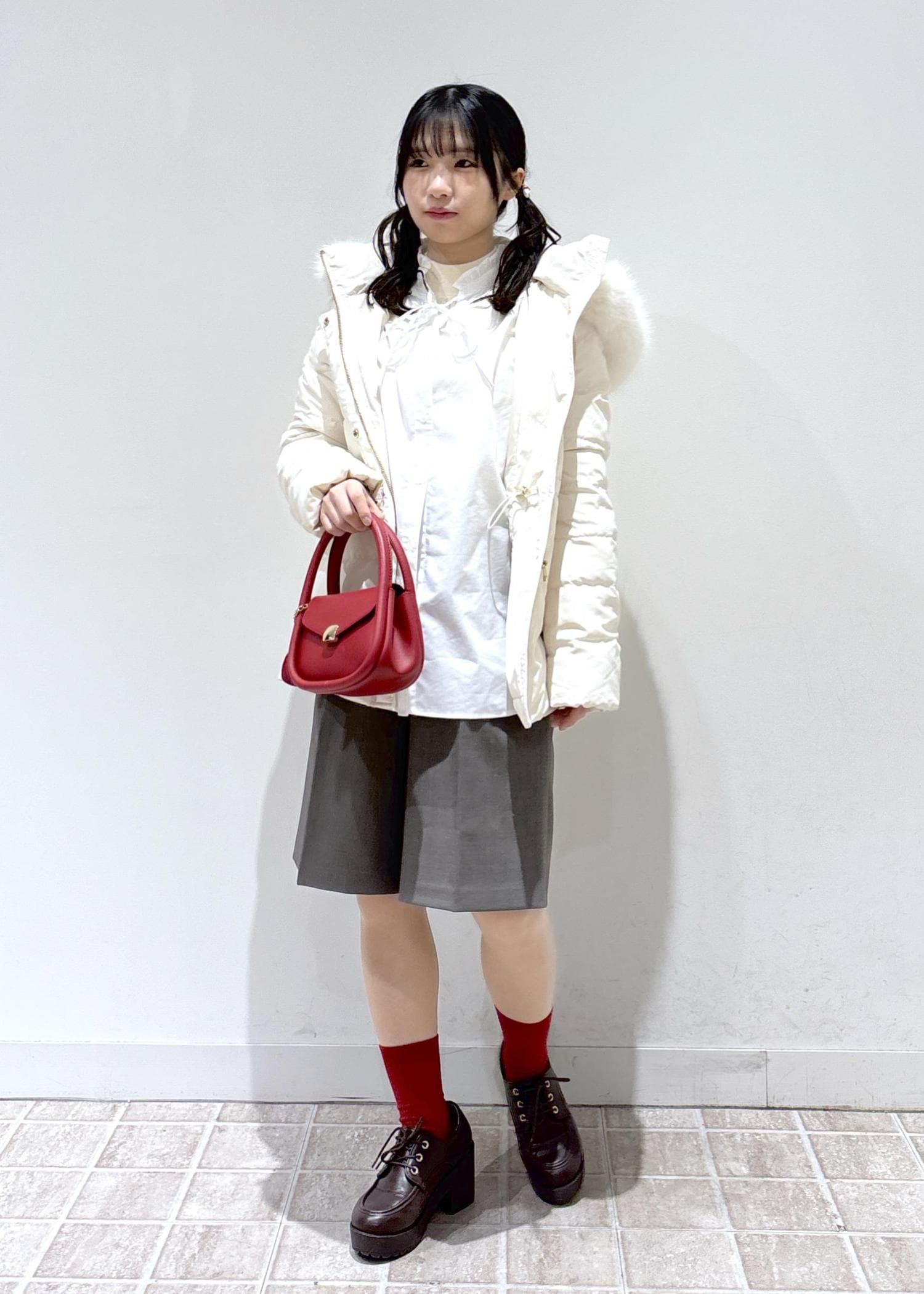 クリスマスにもお正月にも活躍する赤を差し色にしたホワイトコーデです。