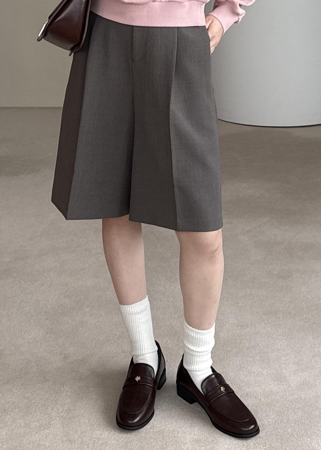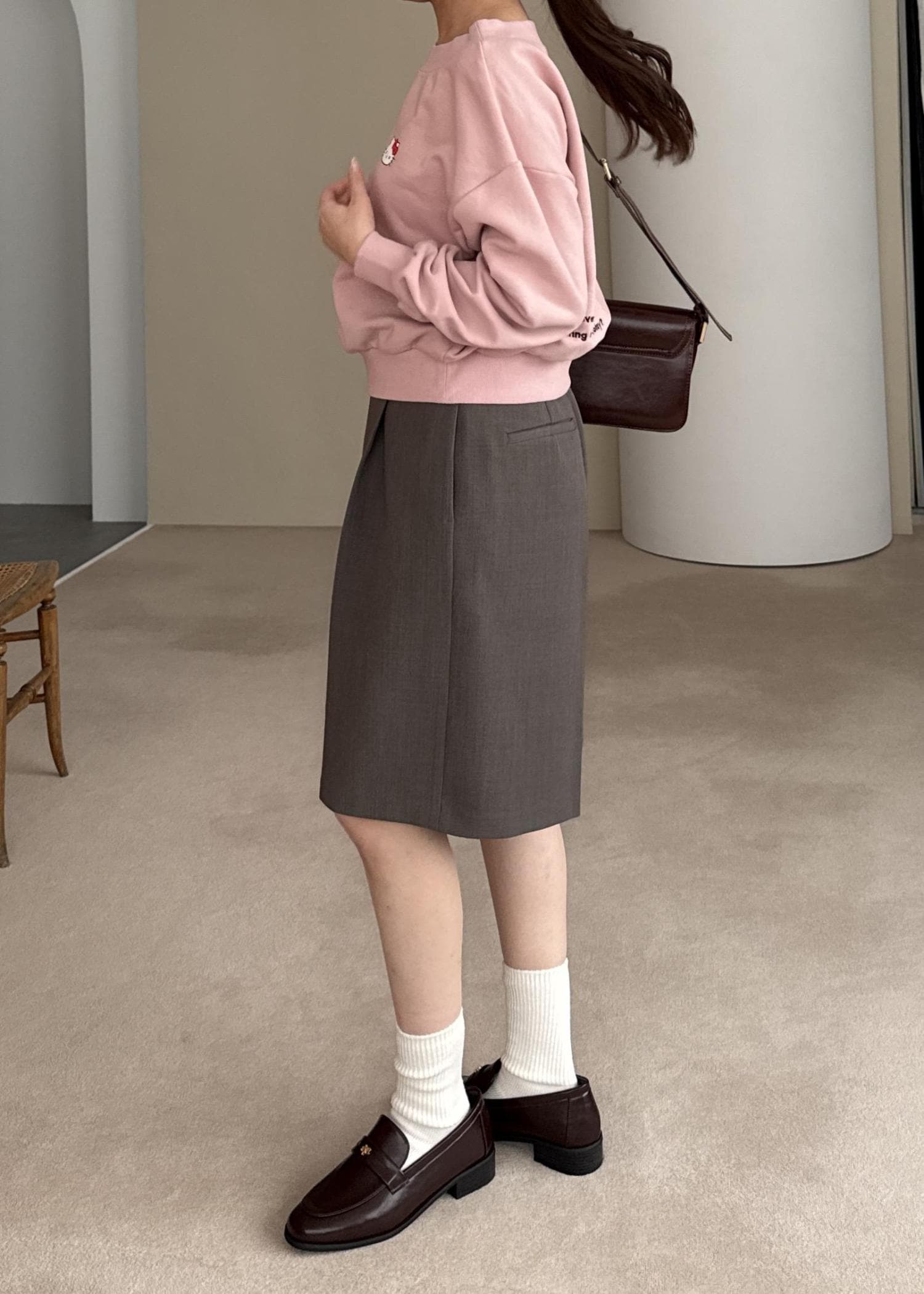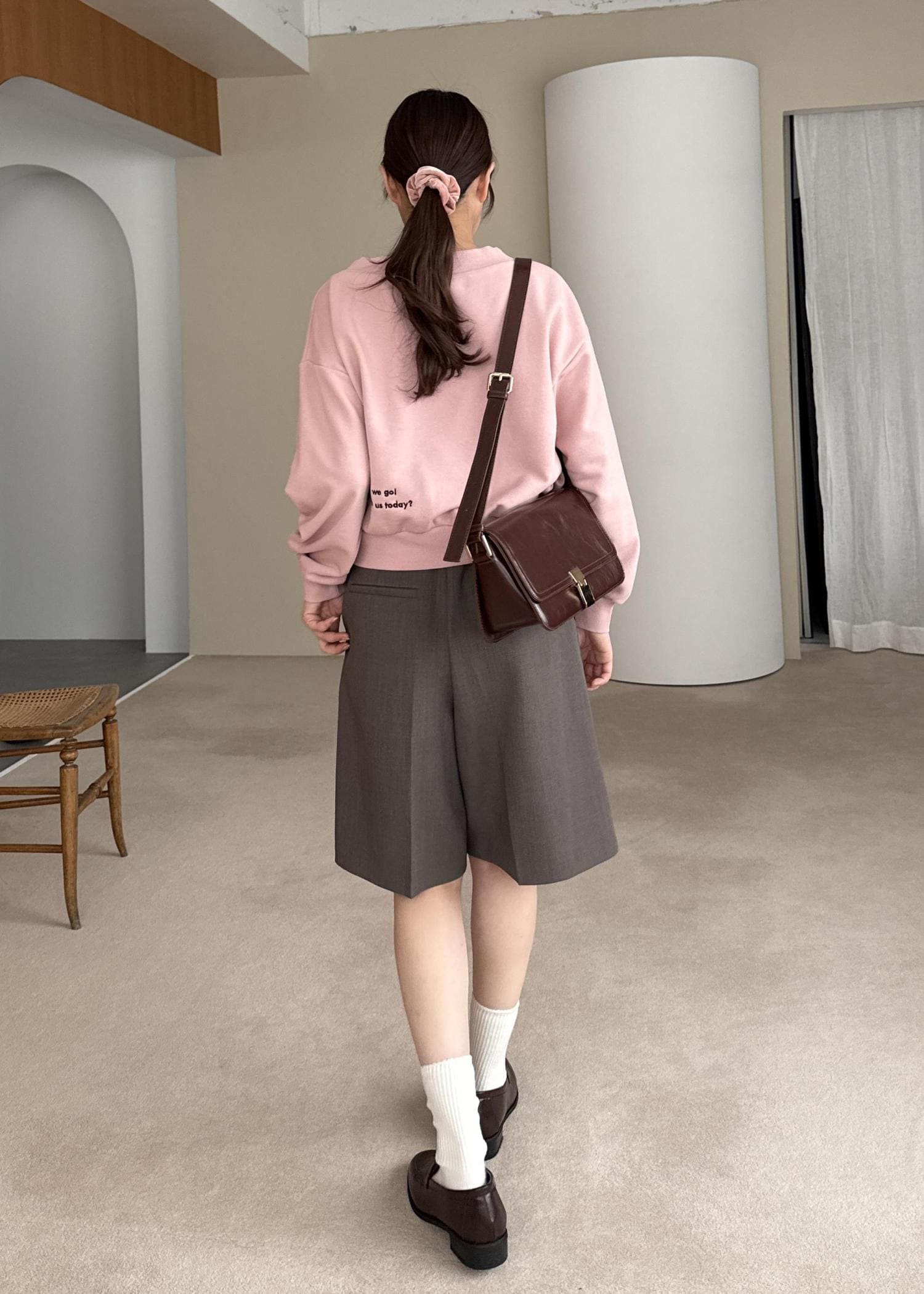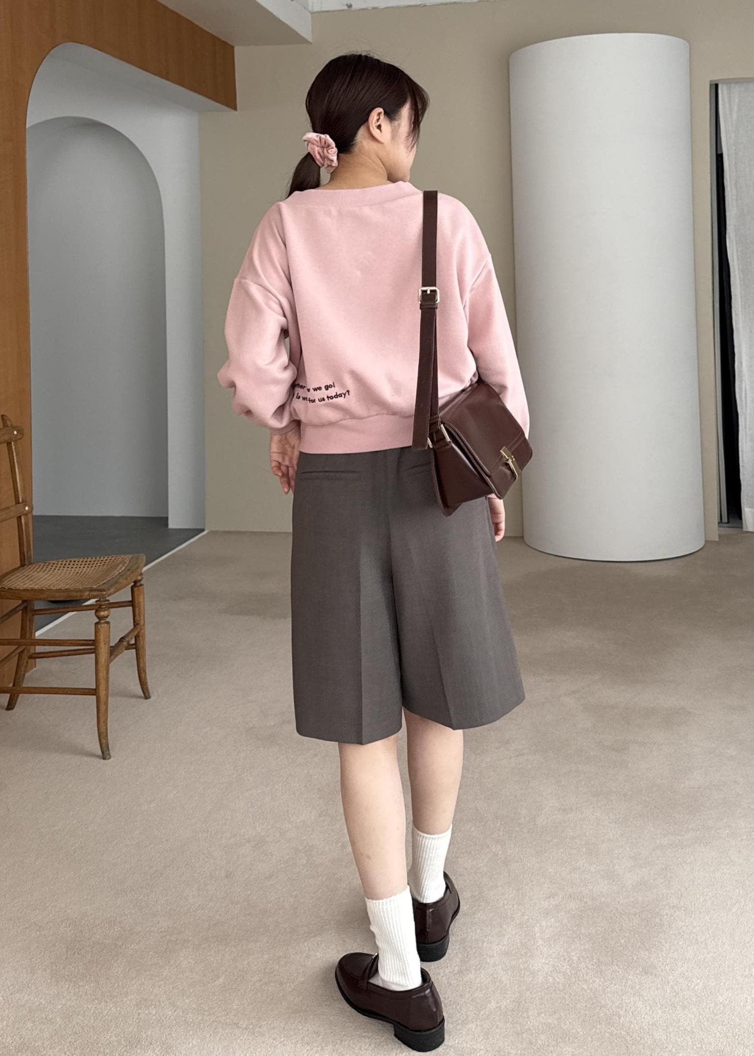 ピンクのスウェットにブラウンアイテムを合わせて、大人らしさをプラスしたコーディネートです。