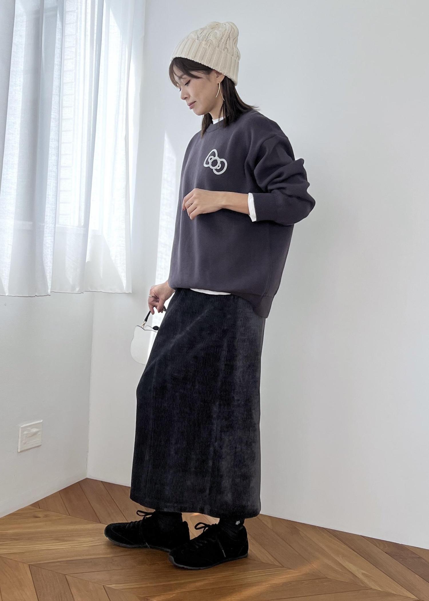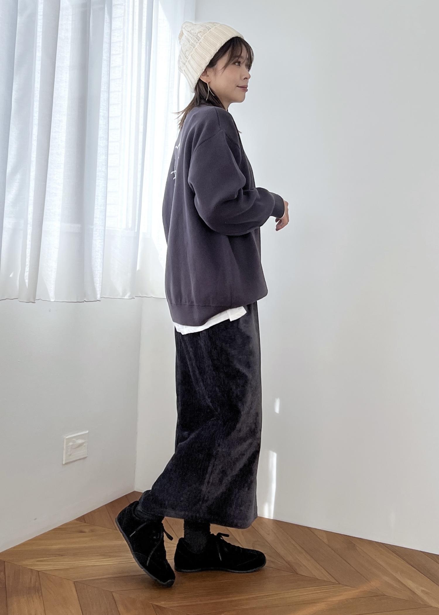 甘くならないようにグレーのワントーンコーデで大人カジュアルな着こなしにしました。