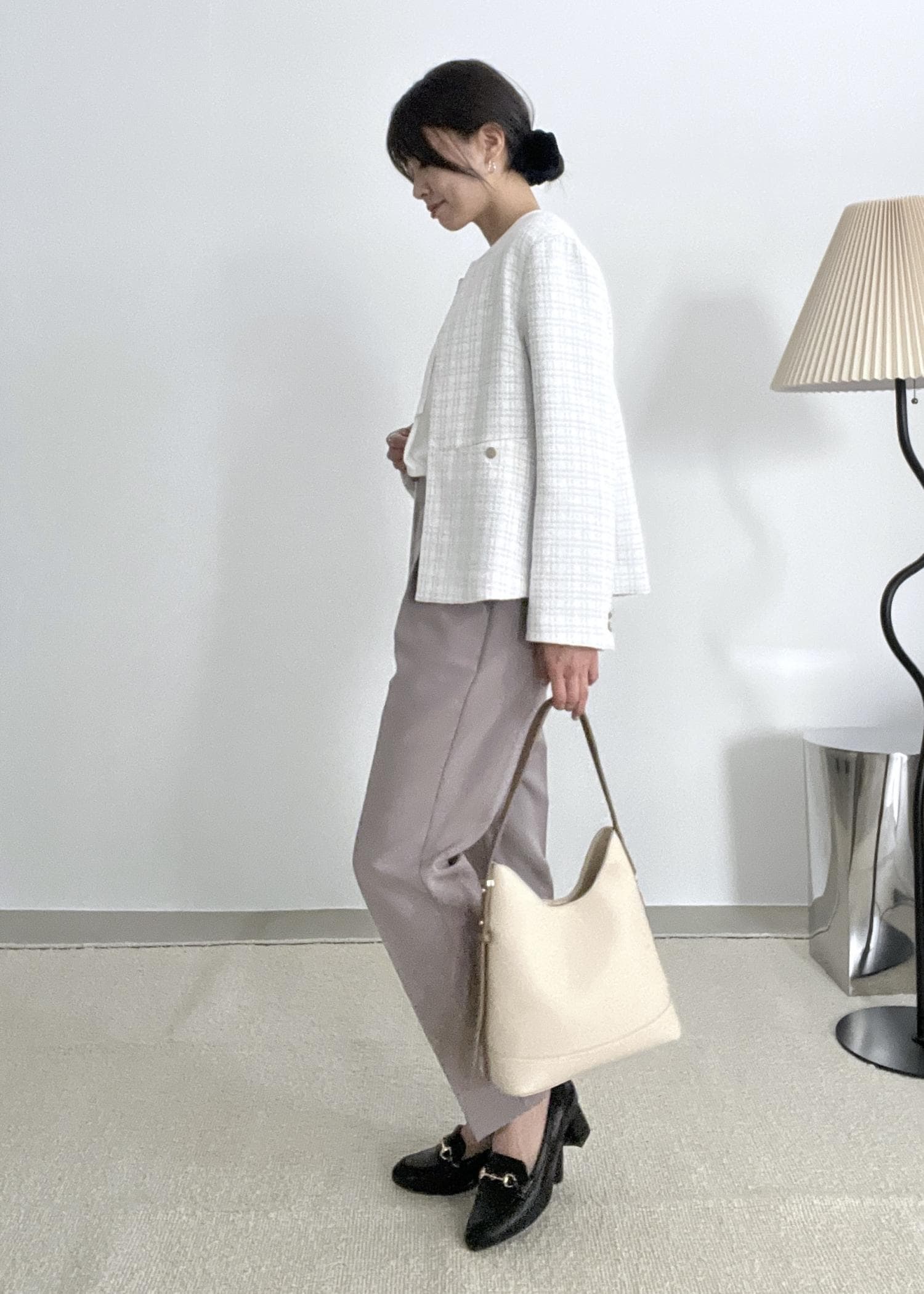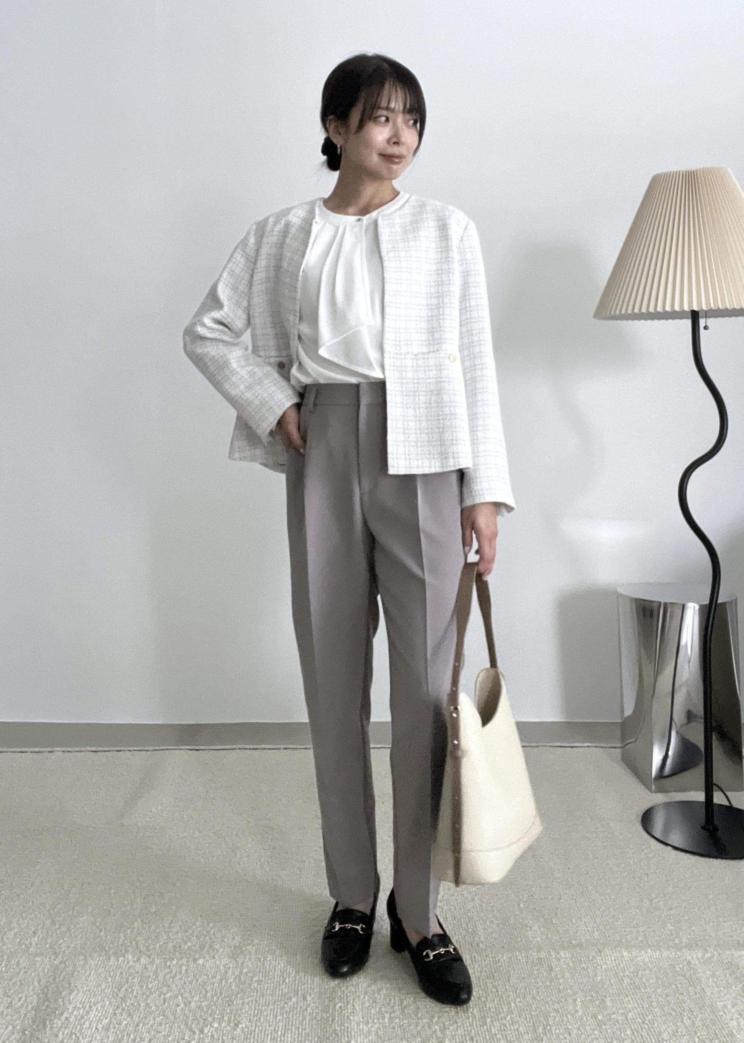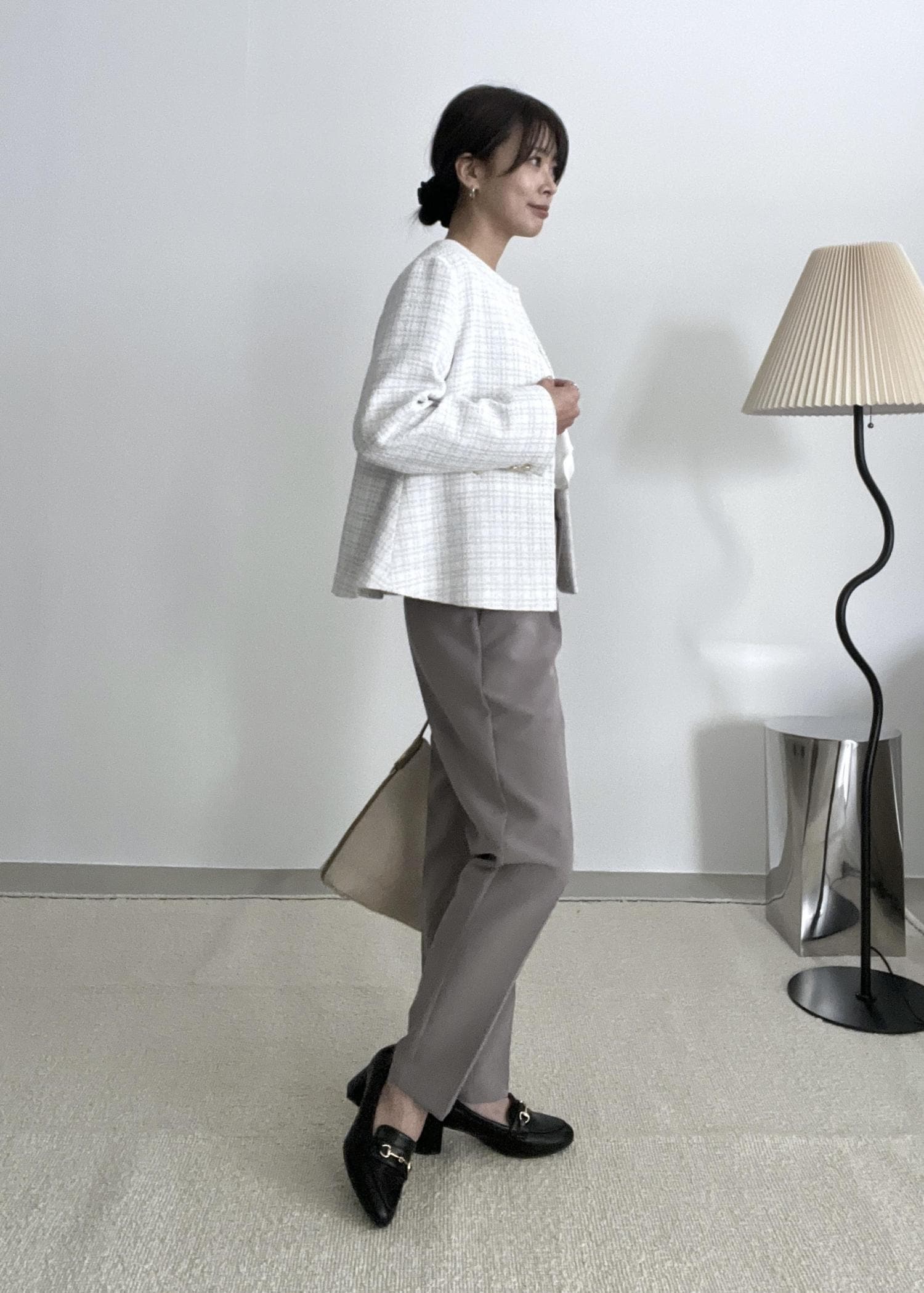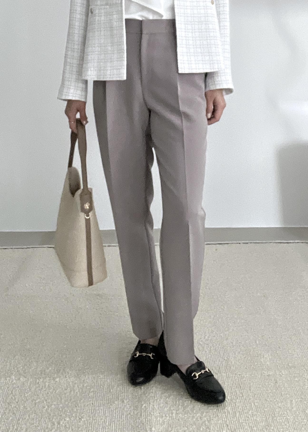 テーパードパンツを合わせてスッキリ感のあるきれいめスタイルにしました。