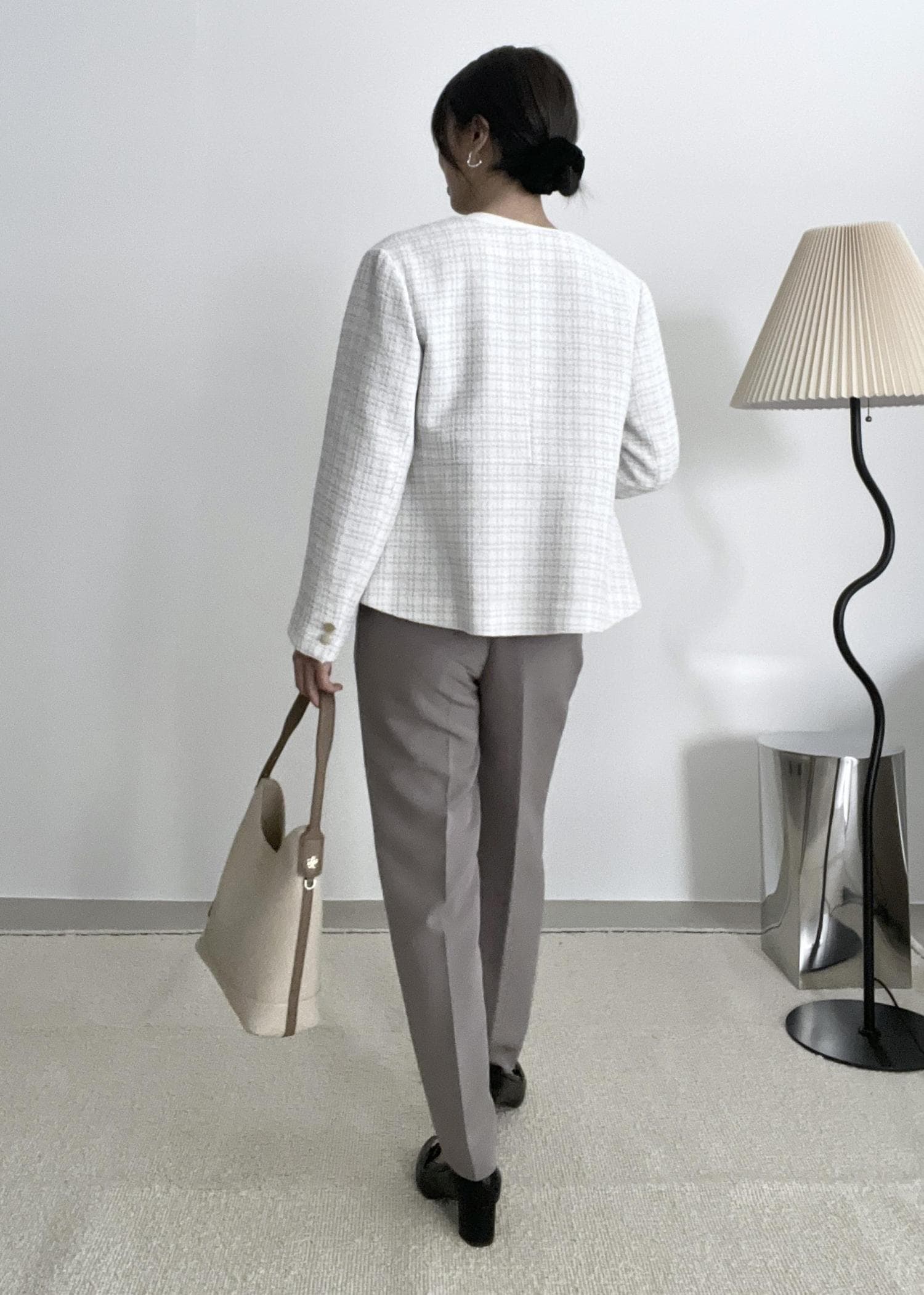 華やかなツイード生地のジャケットは、ぺプラムの切替で気になる腰回りも綺麗にカバーしてくれます。