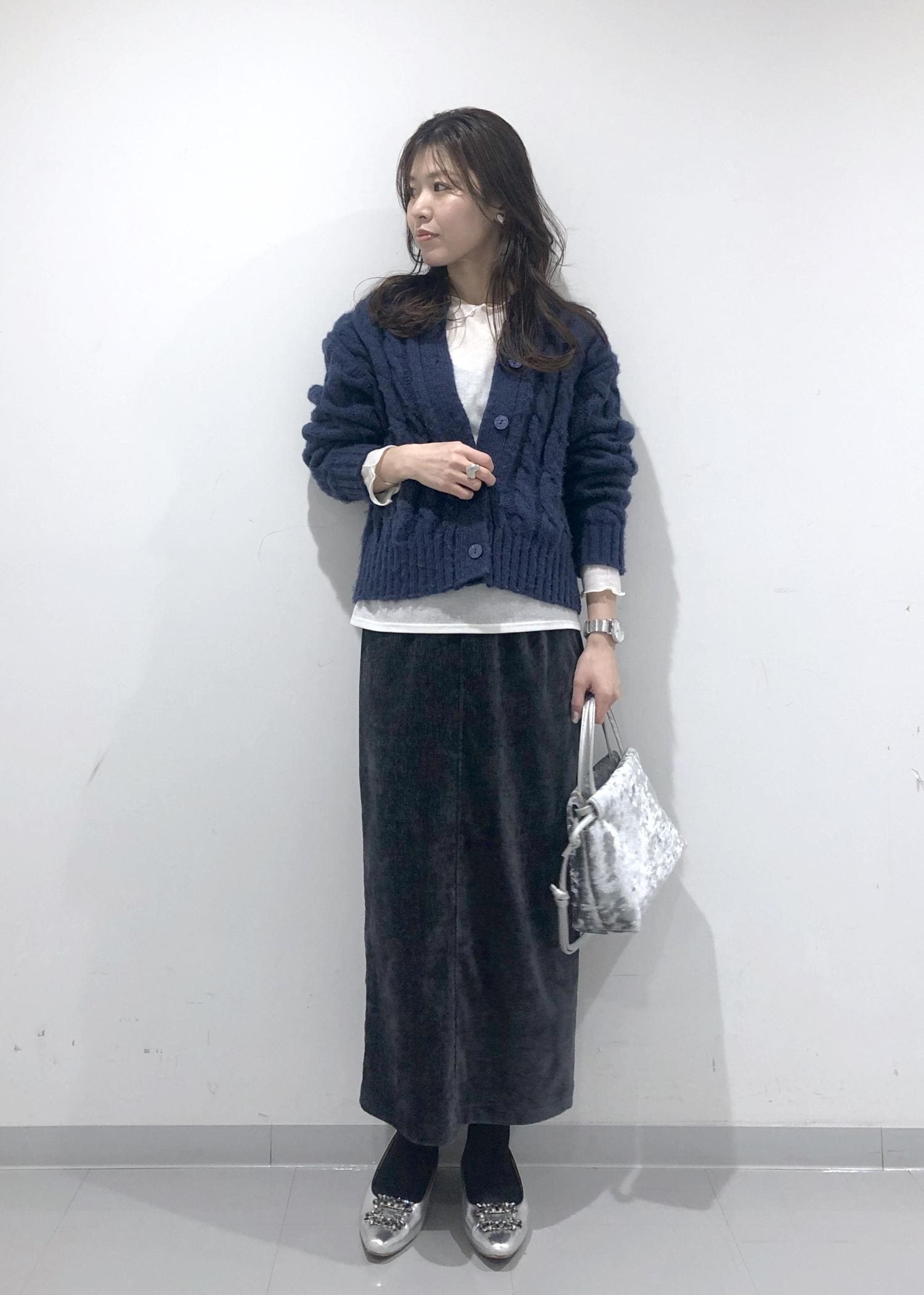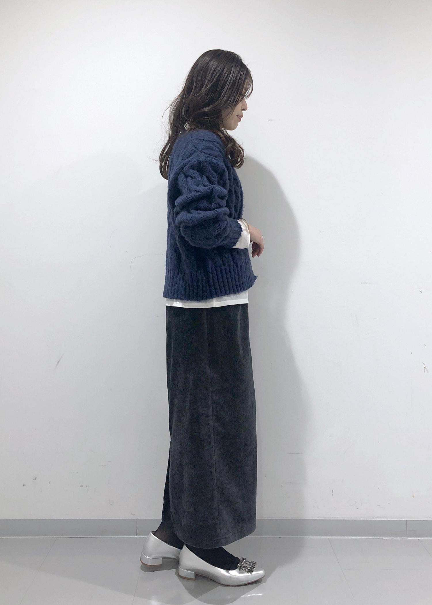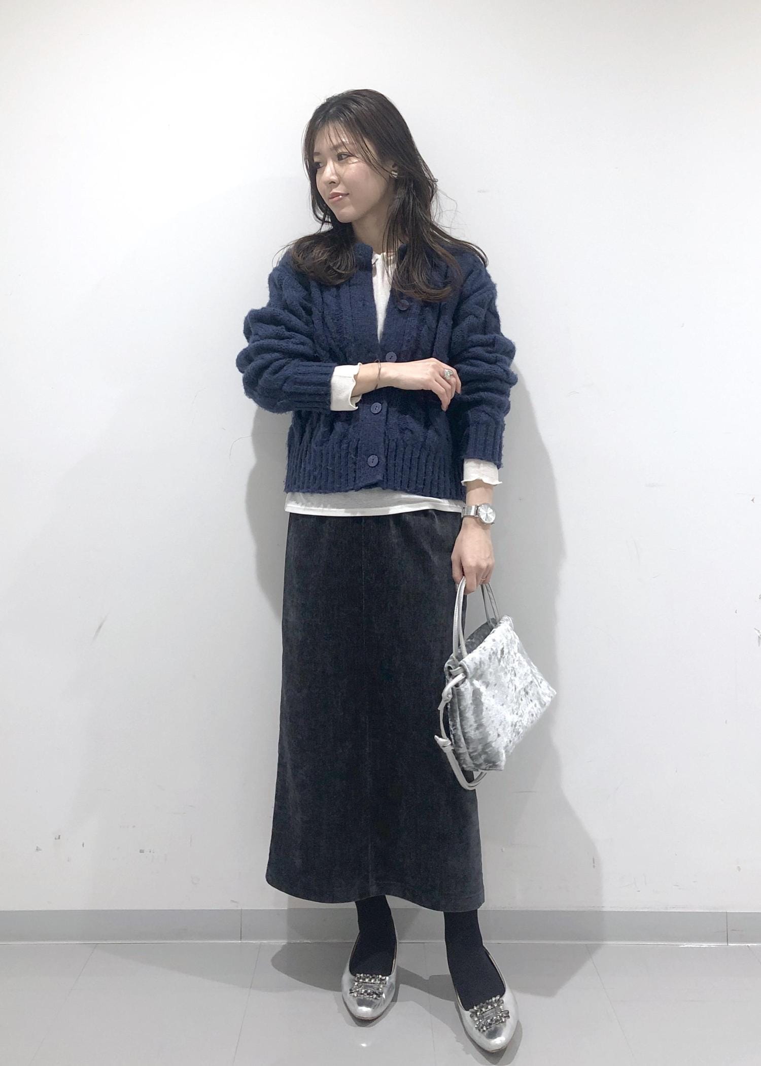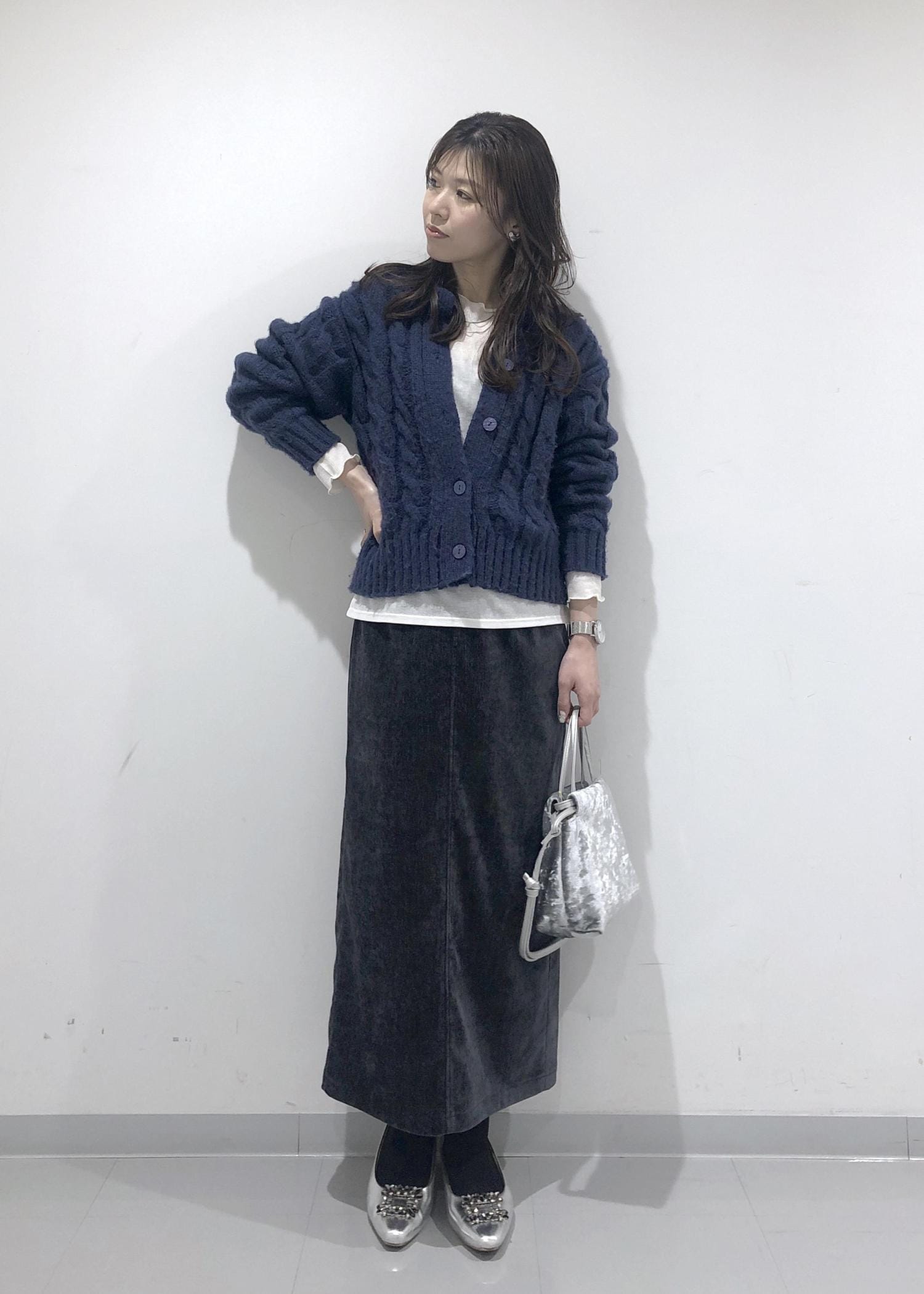 ほっこり暖かみのあるネイビーカーディガンとIラインのタイトスカートに、暗く重くならないようインナーのシアーカットソーの裾を出して間に白を挟み、軽さを出しポイントにしました!