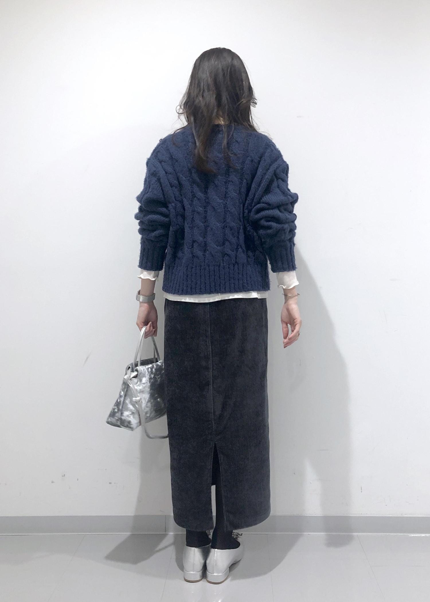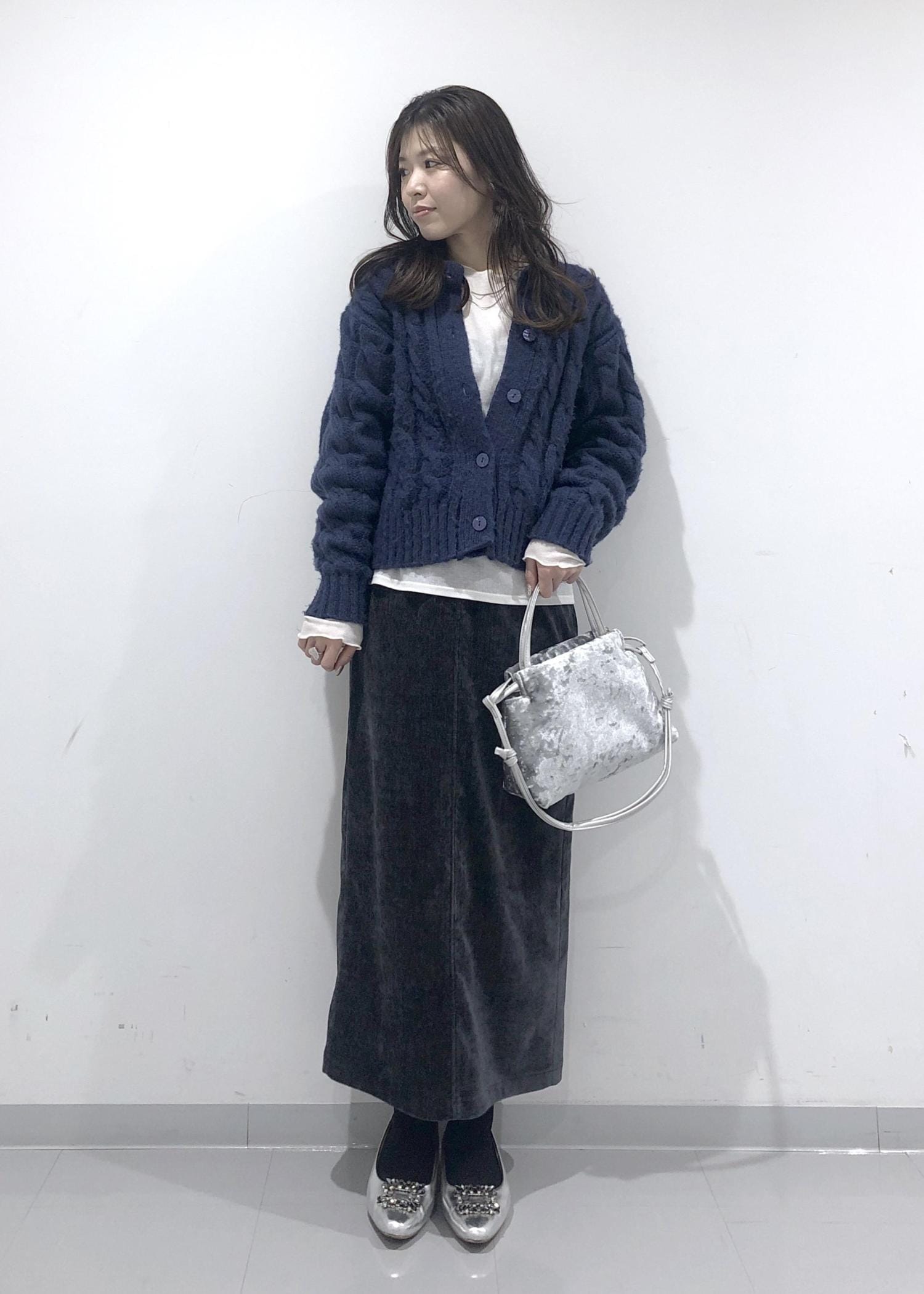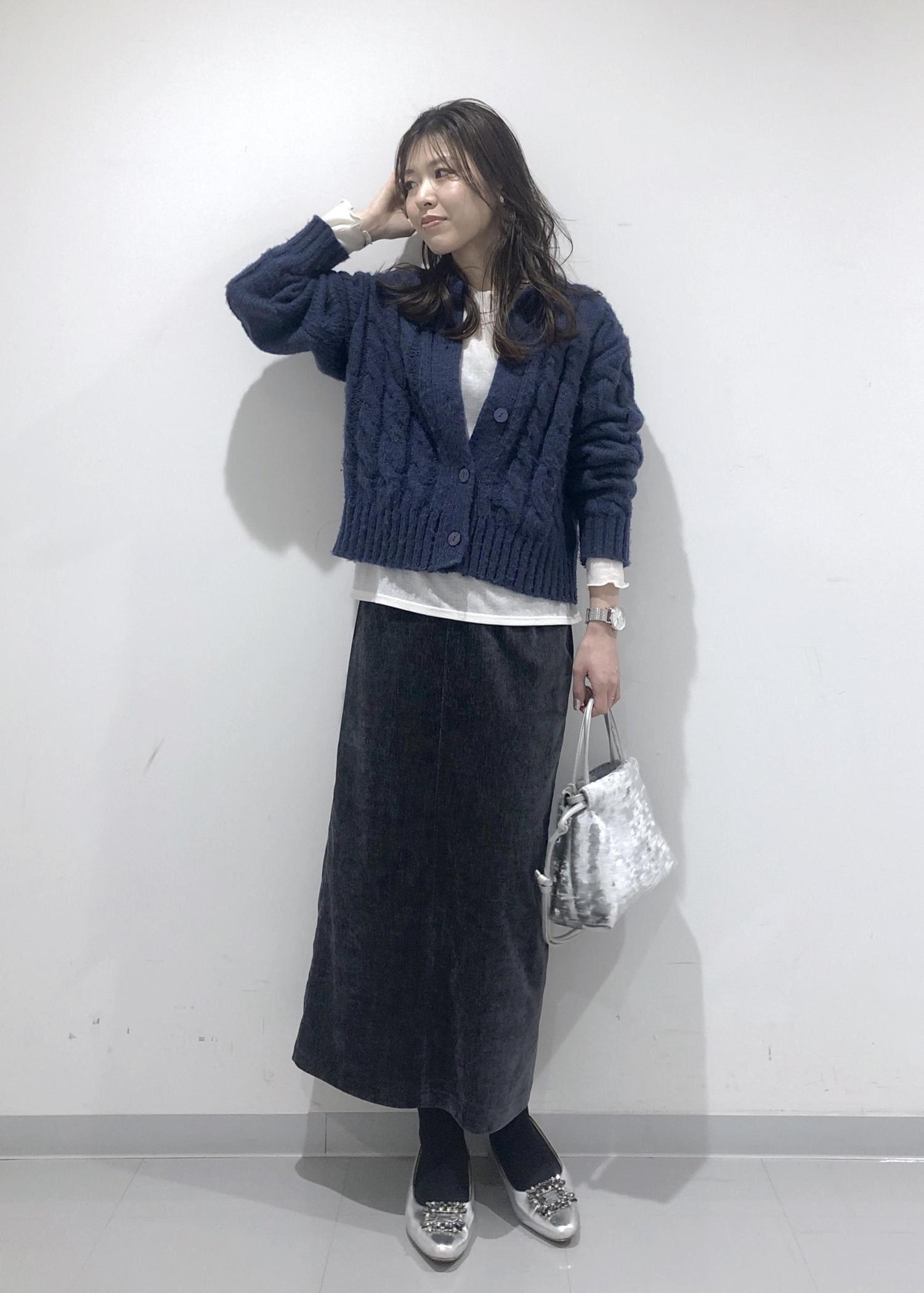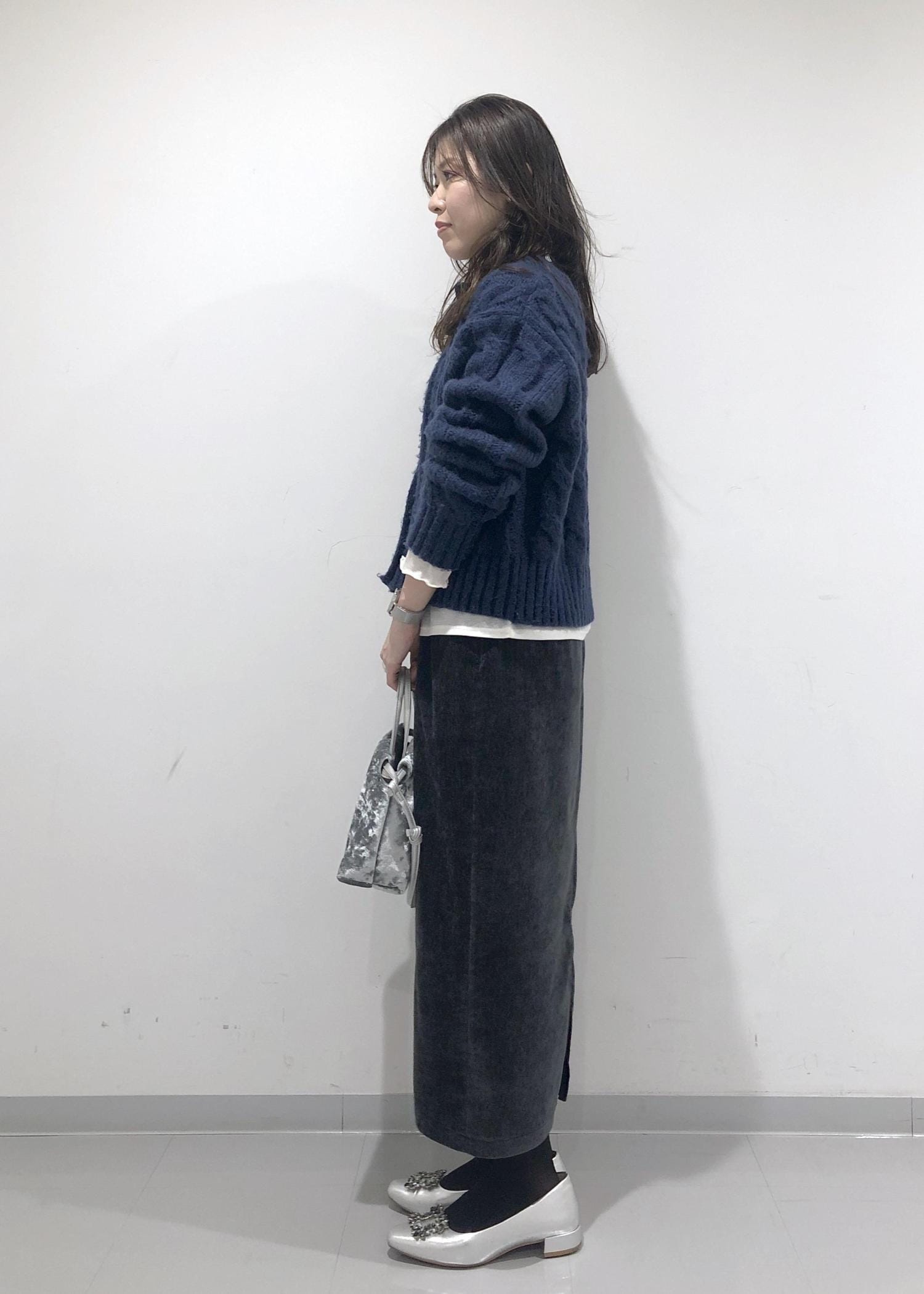 ほっこり暖かみのあるネイビーカーディガンとIラインのタイトスカートに、暗く重くならないようインナーのシアーカットソーの裾を出して間に白を挟み、軽さを出しポイントにしました!