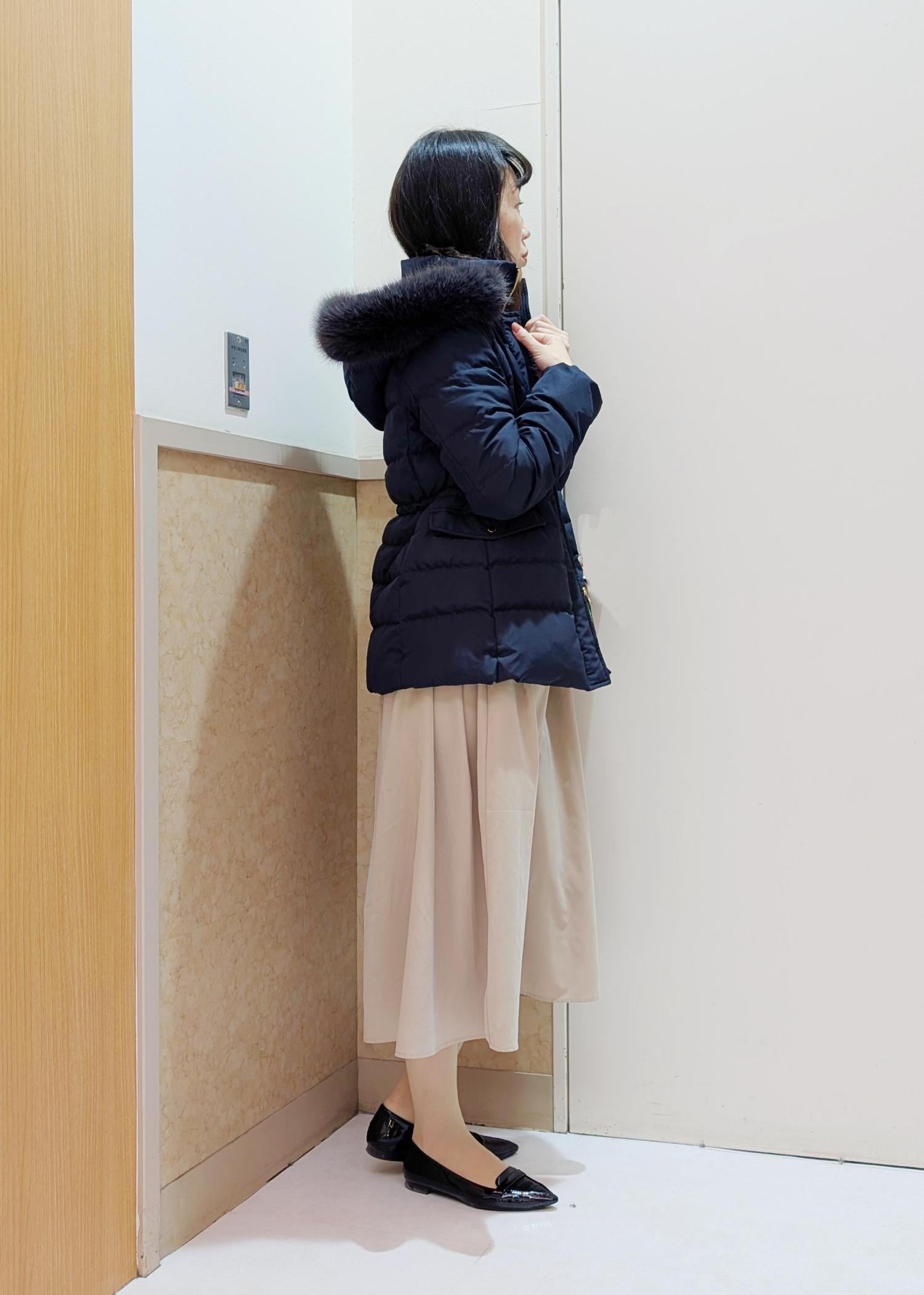 私は骨格ウェーブで長めのダウンコートは膨張して見えることが多いですが、こちらは切り替えがあるのでスッキリ見えました! -