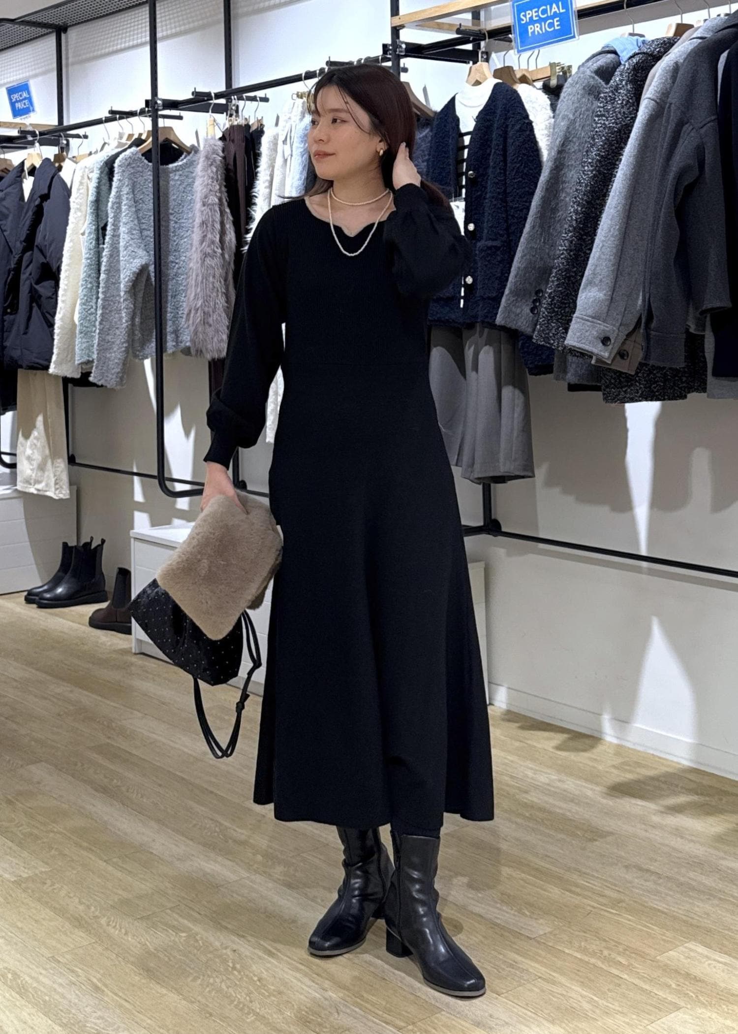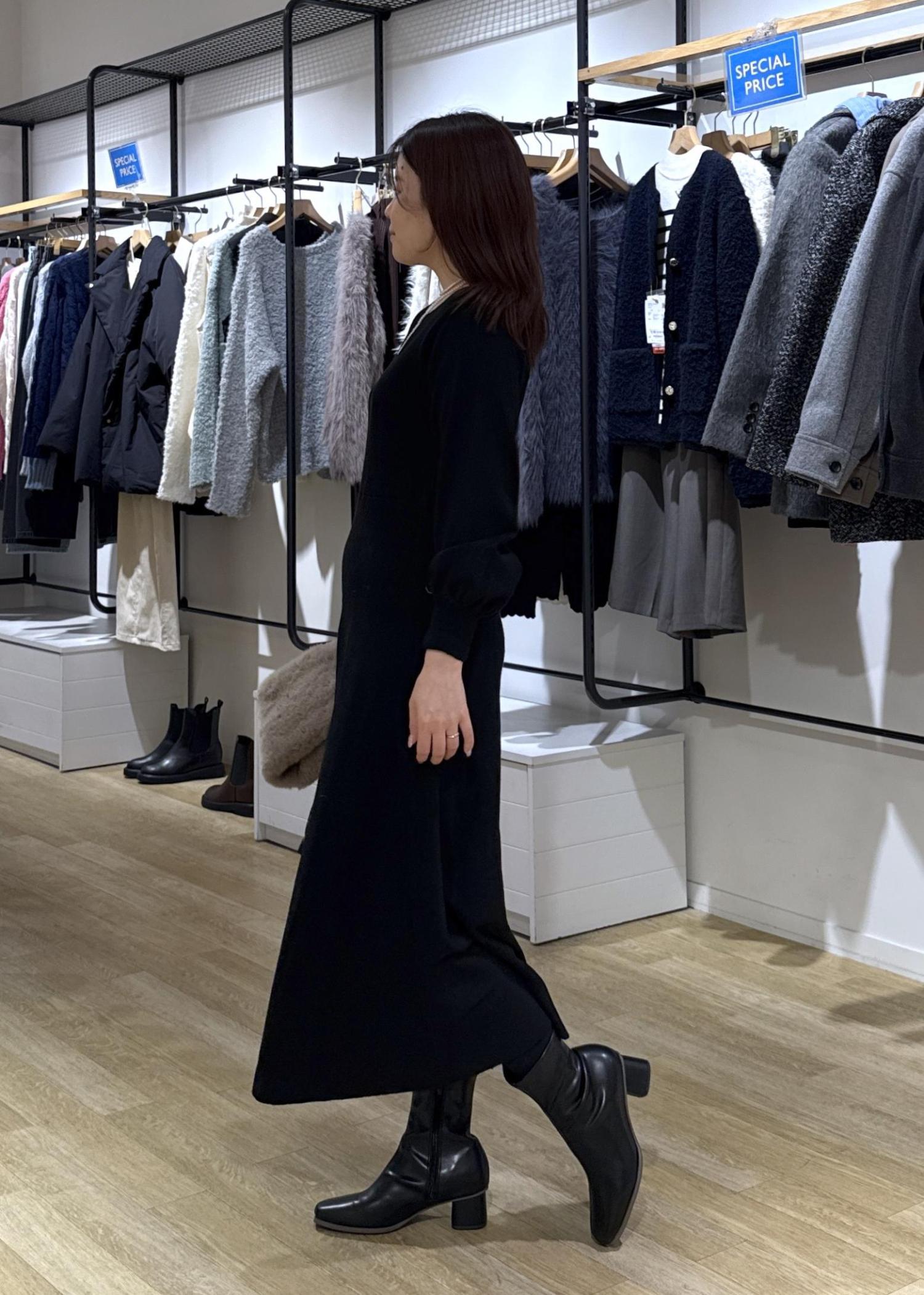 フィットアンドフレアのラインがきれいめなニットワンピースで簡単きれいめコーデにしてみました!