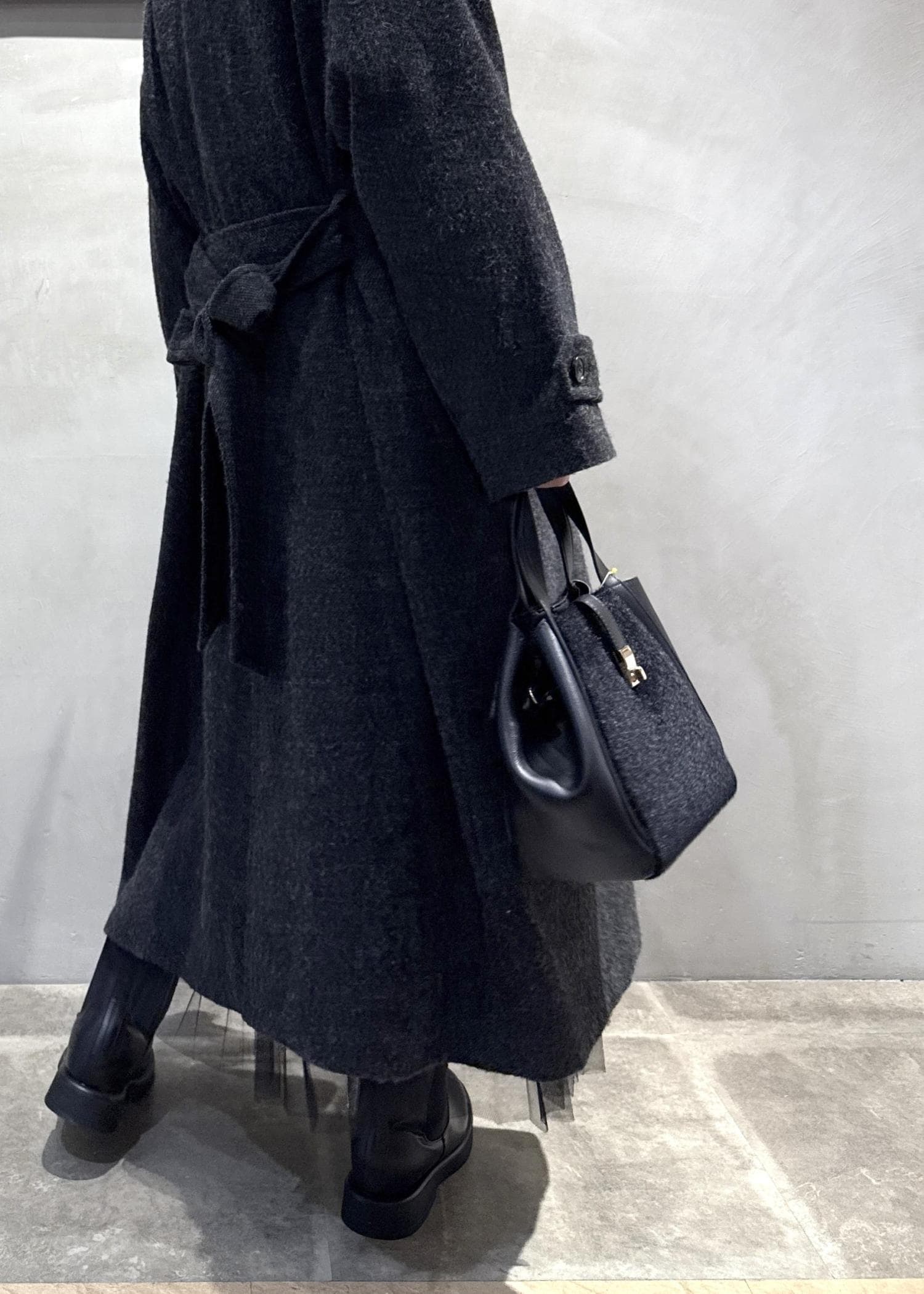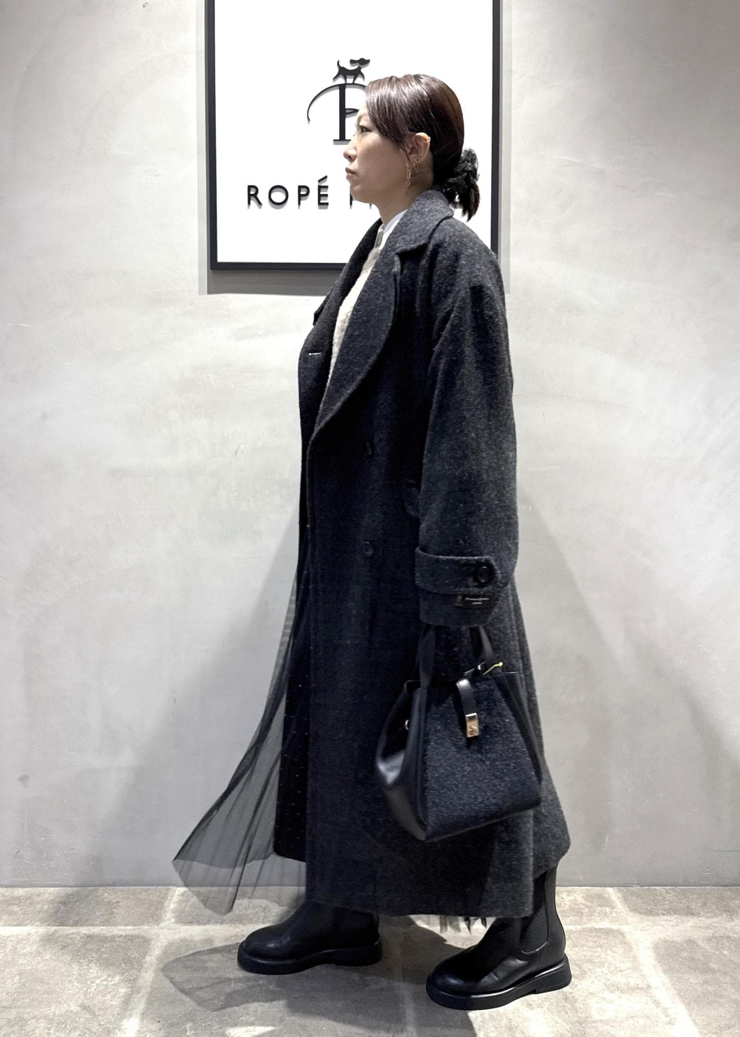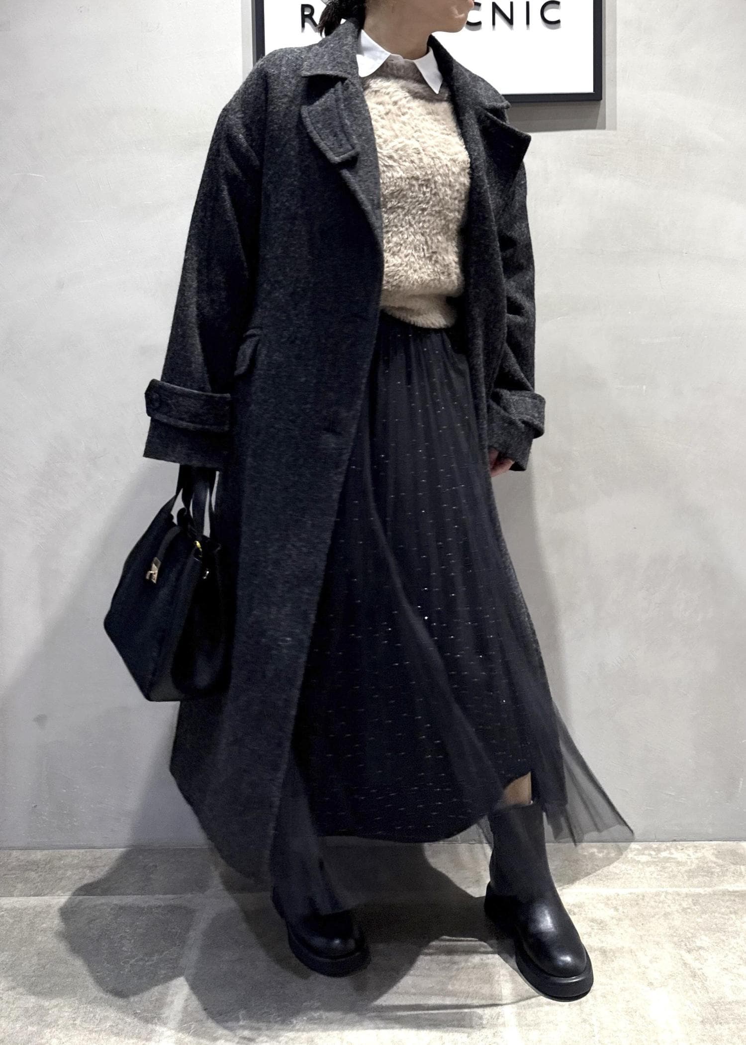 グレーのロングコートに、柔らかなニットを合わせて女性らしく。