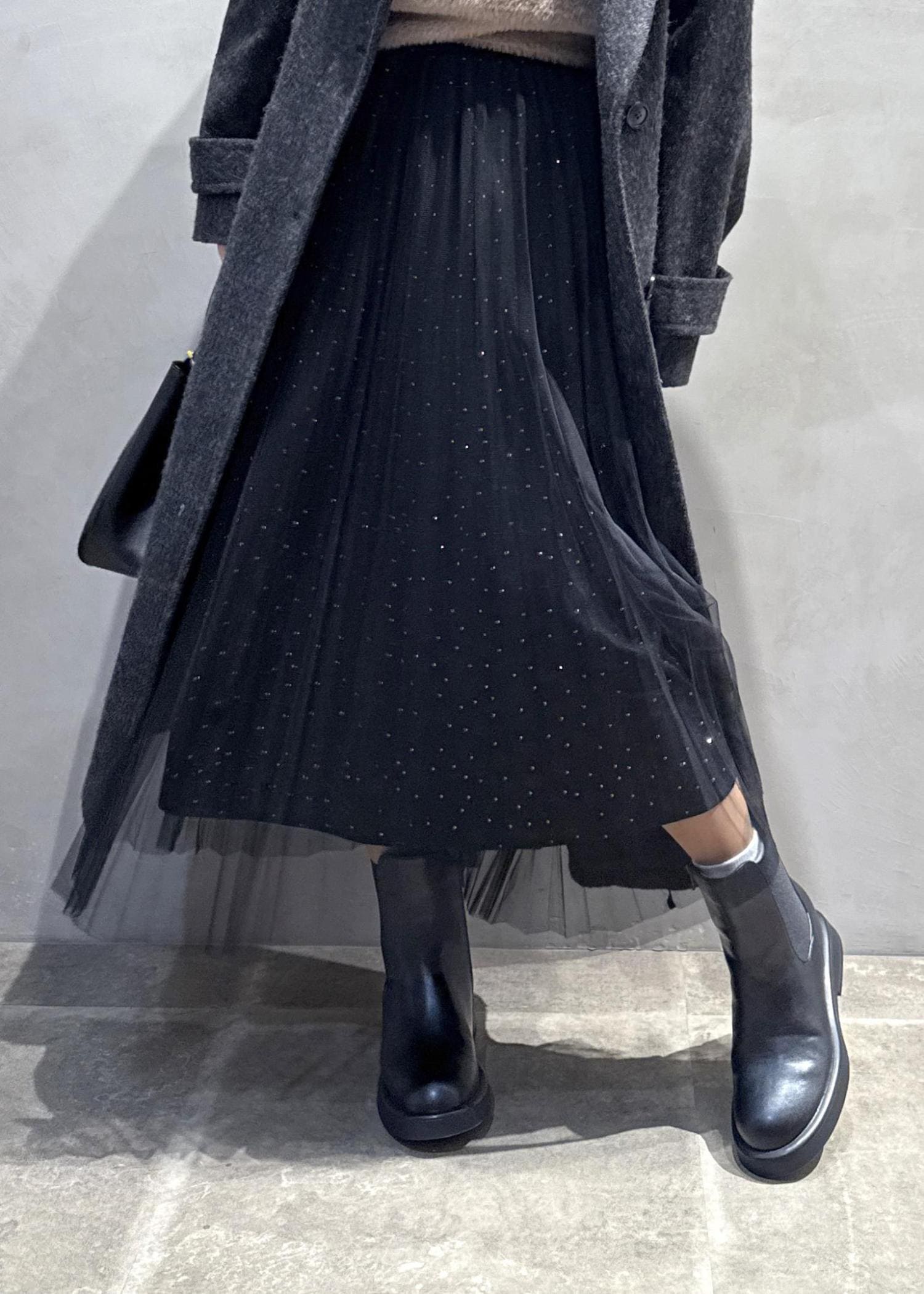 ドットチュールのプリーツスカートが、さりげない華やかさをプラス!