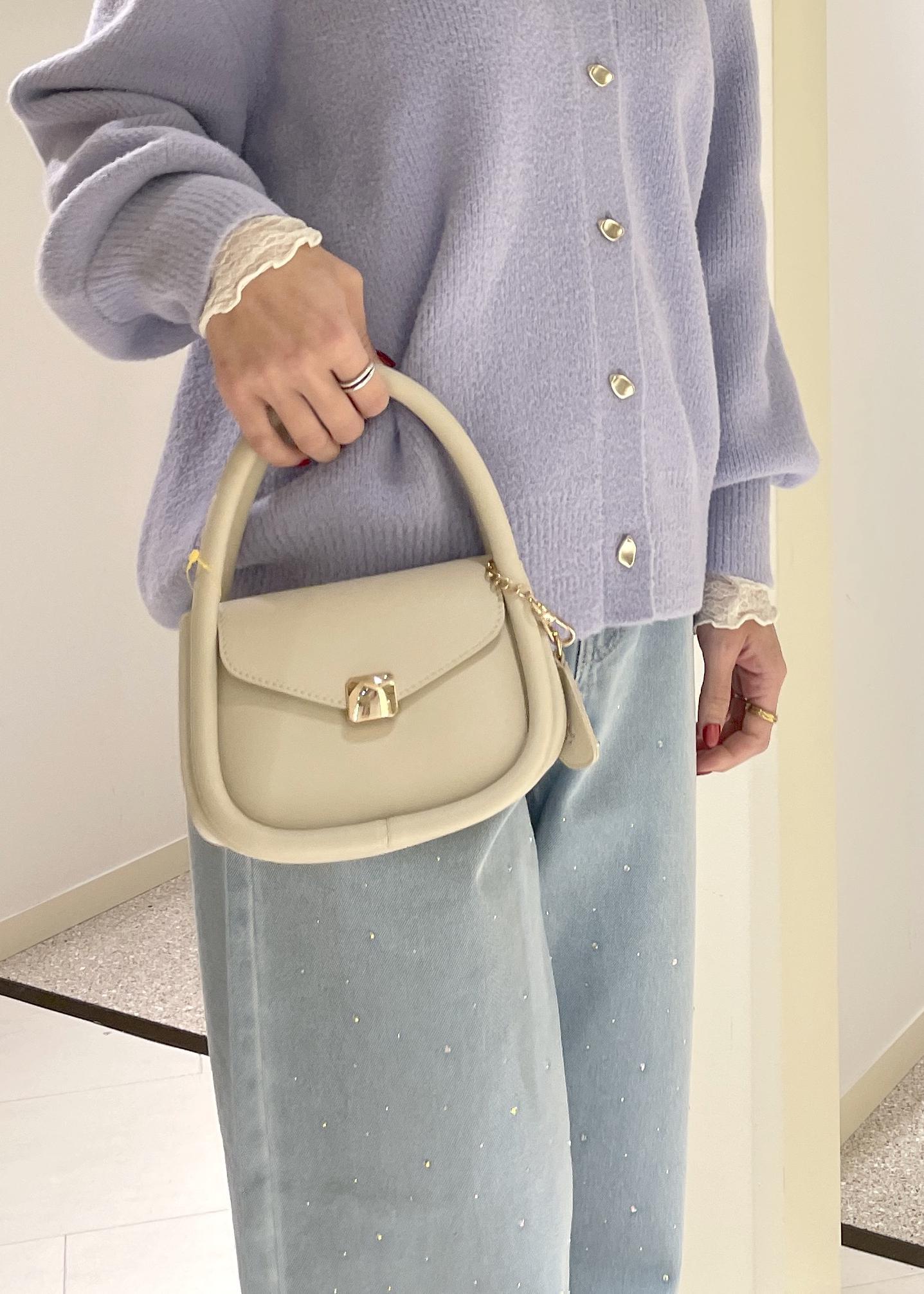 間口が広いので物の出し入れもしやすく、ショルダーベルトも付いている為、デイリーにもパーティーバッグとしてもお使い頂けそうです。 -