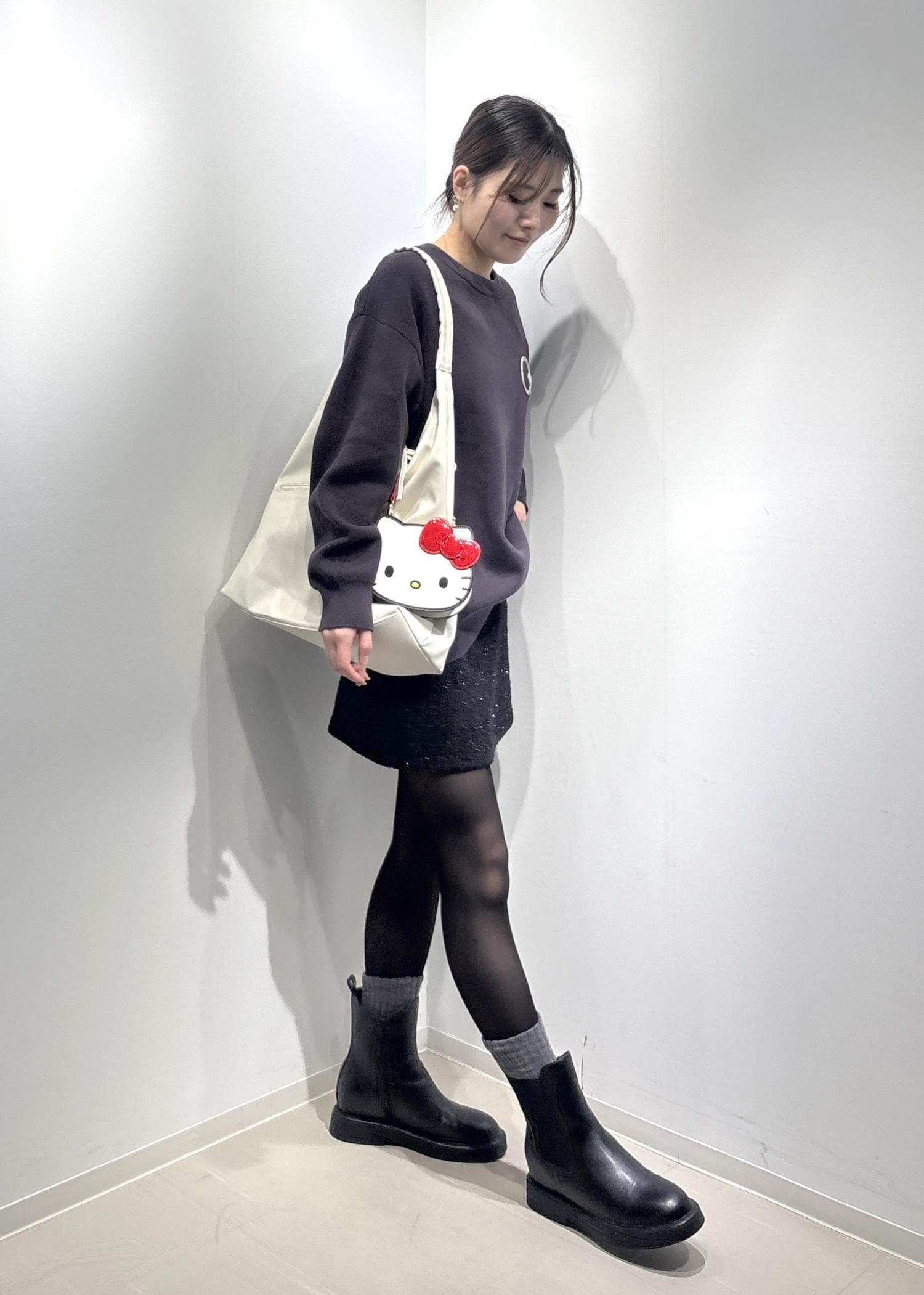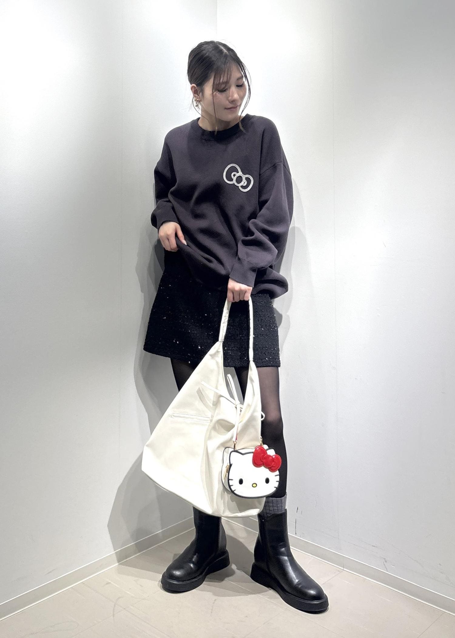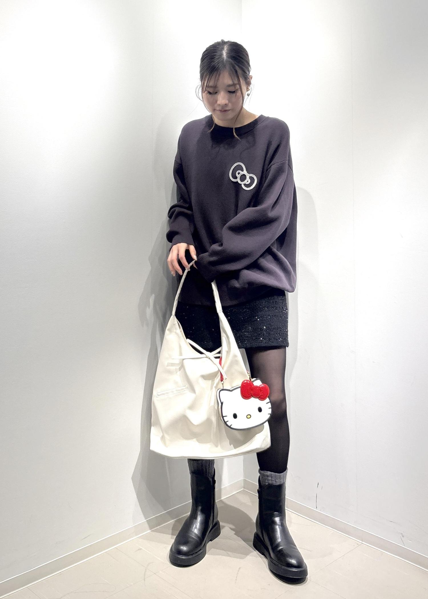 ハローキティのミニバッグがポイントになるブラックコーデです♩