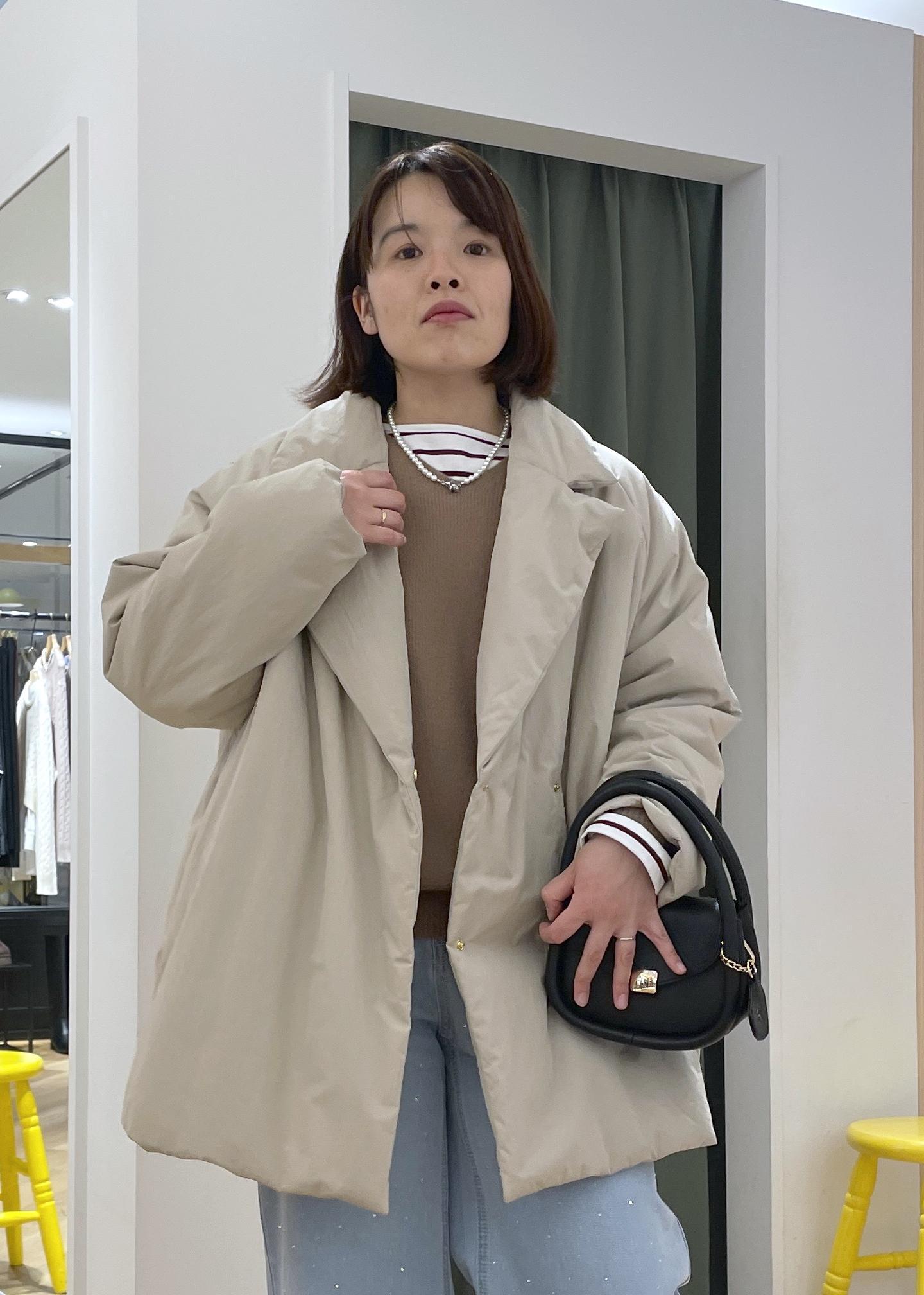 ROPÉ PICNIC2WAY中綿テーラードコートベージュ / F¥8,470レビュー軽く温かな中綿のアウターです。ふっくらした軽い素材感で羽織心地も良いです。ゆったりしたサイズ感で、厚地のトップスの上からでも羽織れます。着丈はヒップが隠れるくらいの長さです。前を閉めると首元も温かくお召し頂けます。