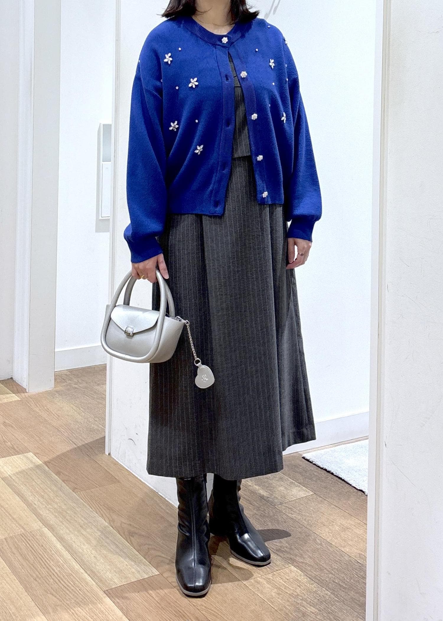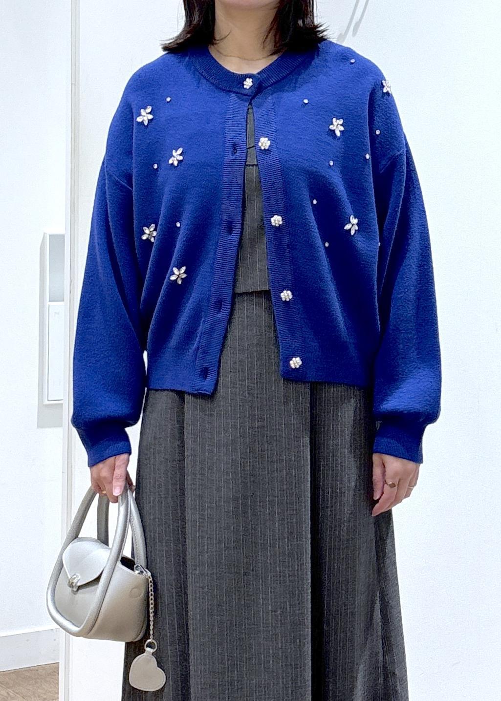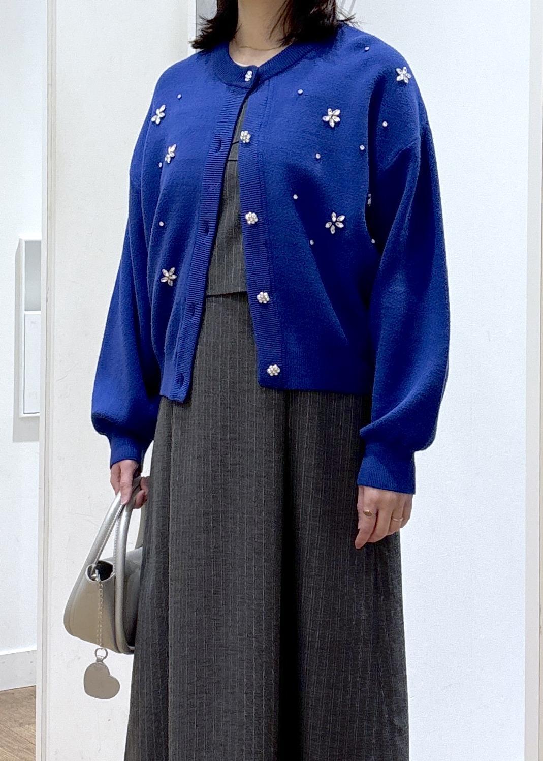 鮮やかなブルーとビジューが華やかなカーディガンに、