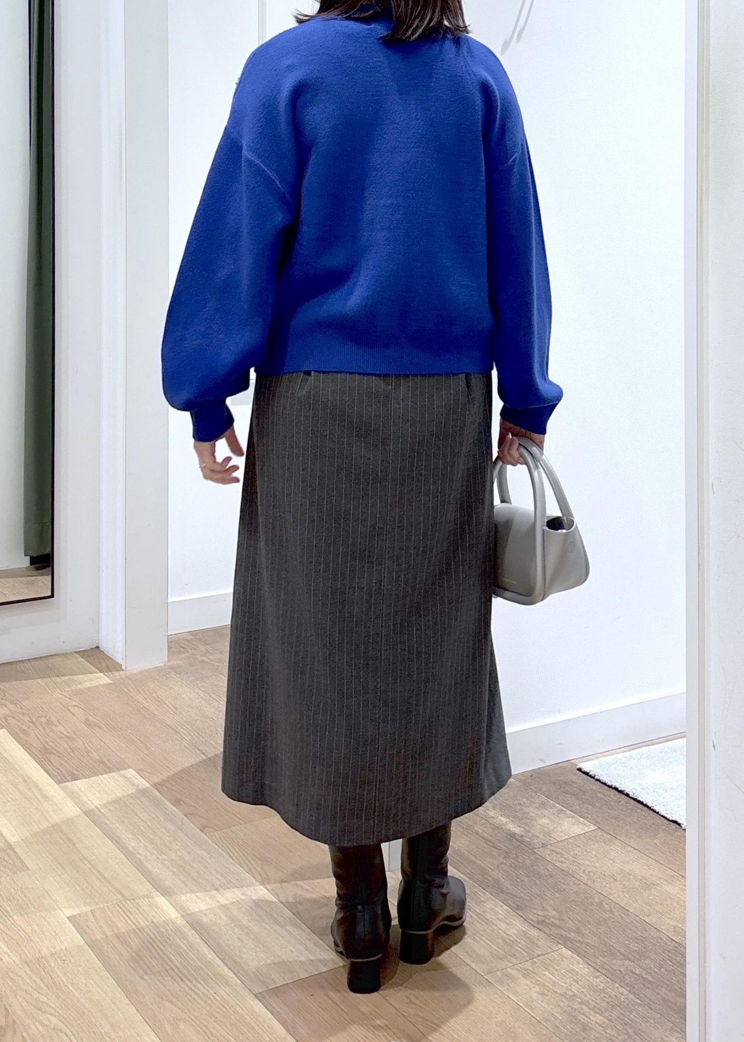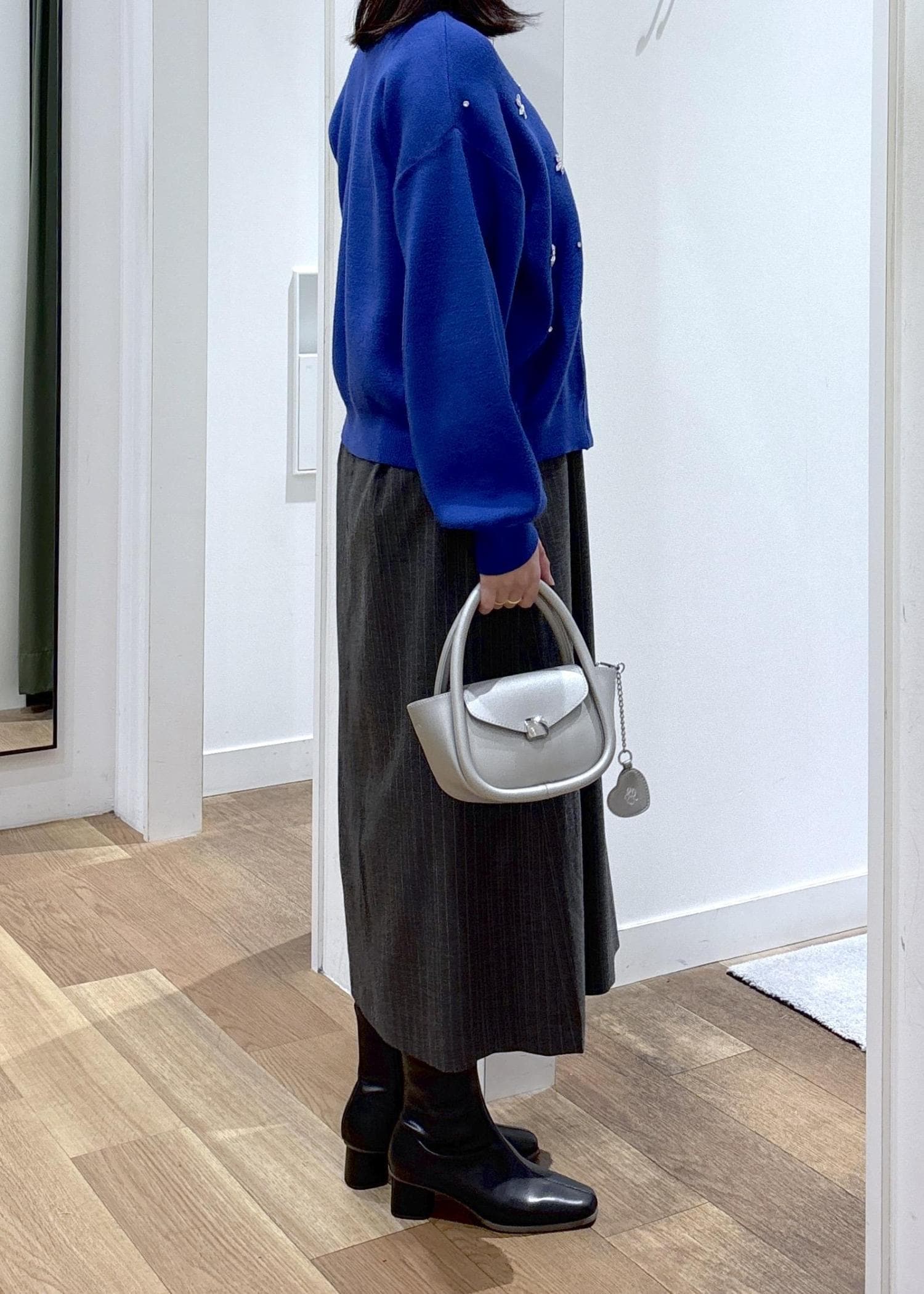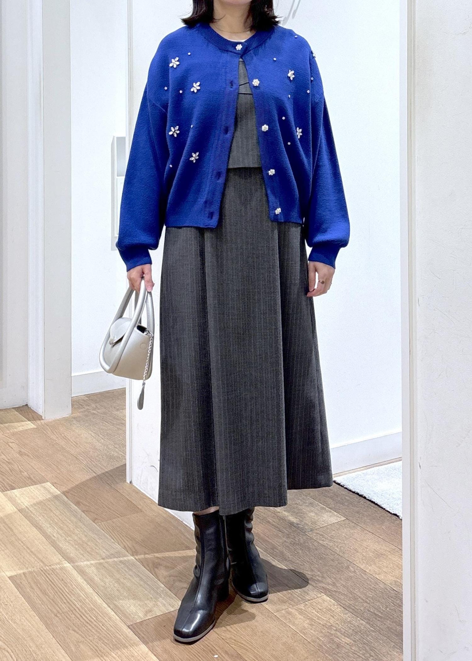 鮮やかなブルーとビジューが華やかなカーディガンに、