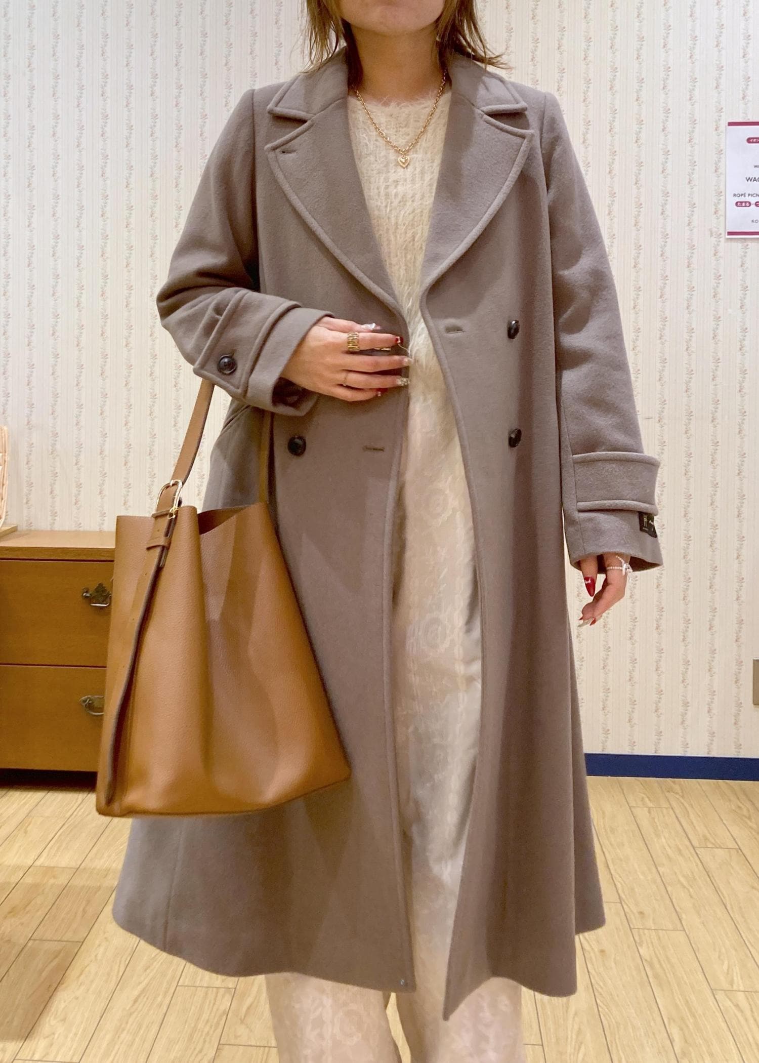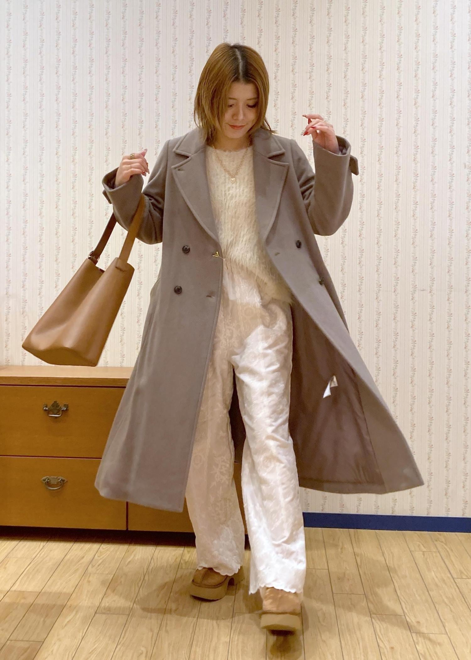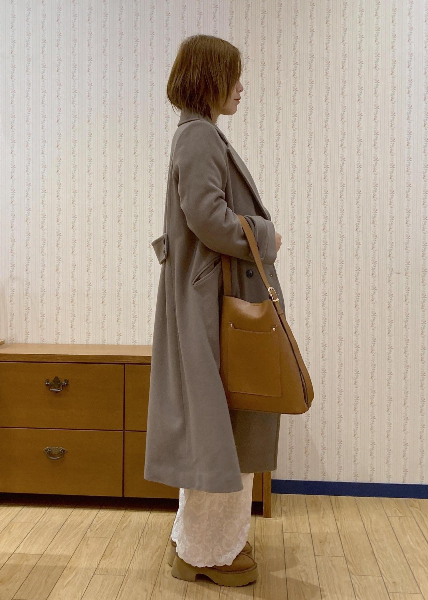 小物やコートはベージュ系で統一して優しい雰囲気にまとめました!