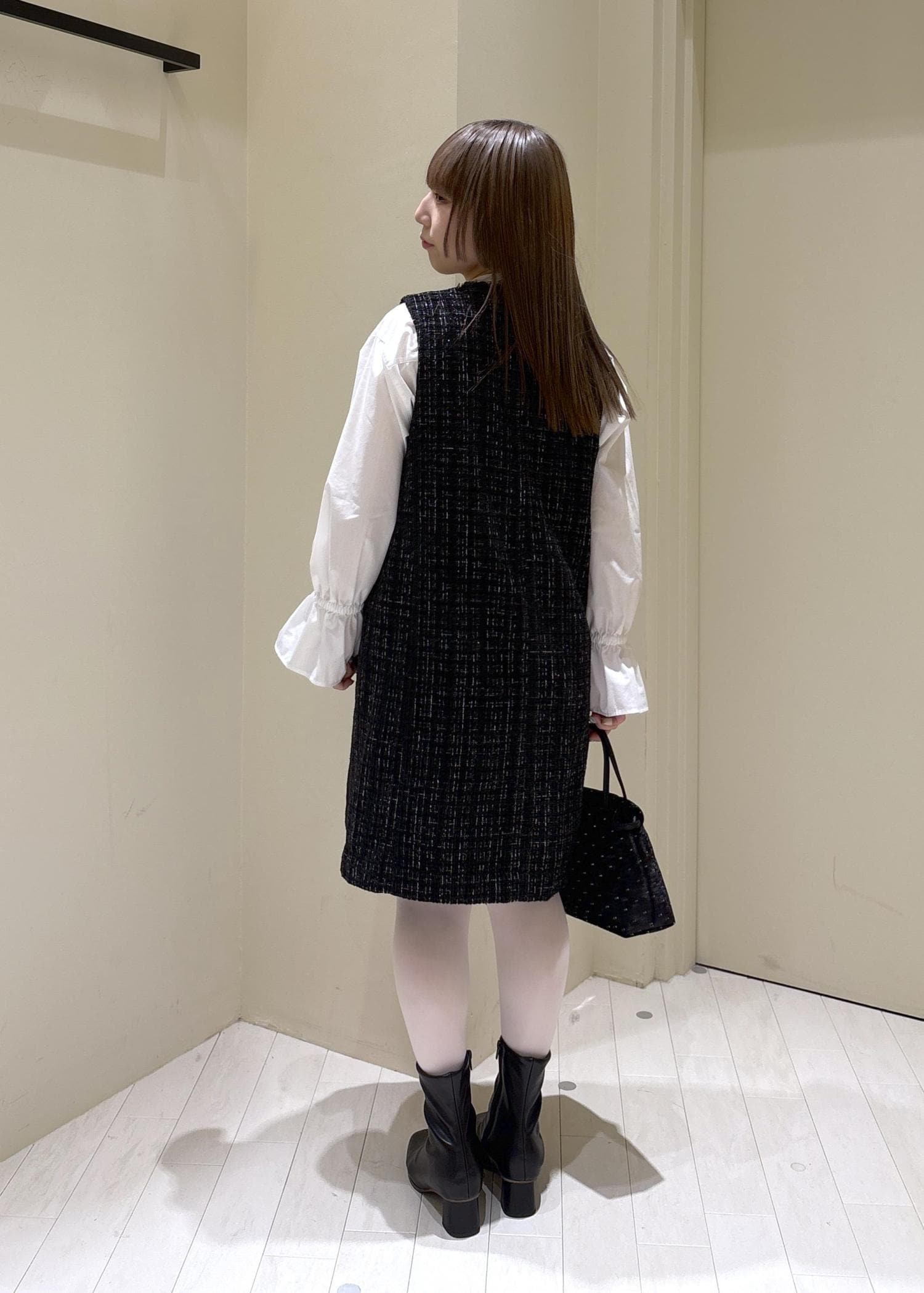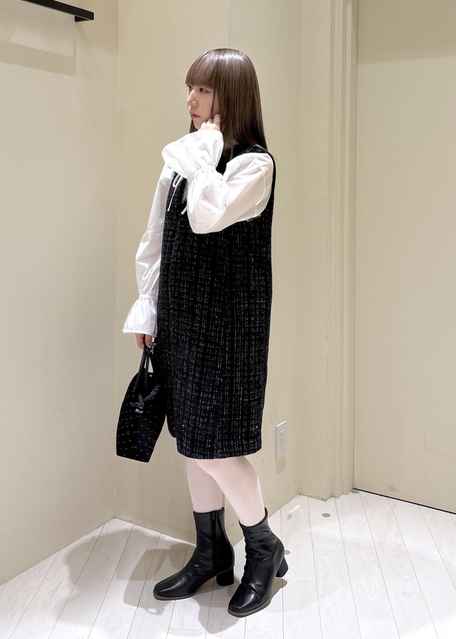 ワンピースにブラウス+白タイツと要素はガーリーですが、黒と白に色を限定することで大人っぽさをプラスしました。