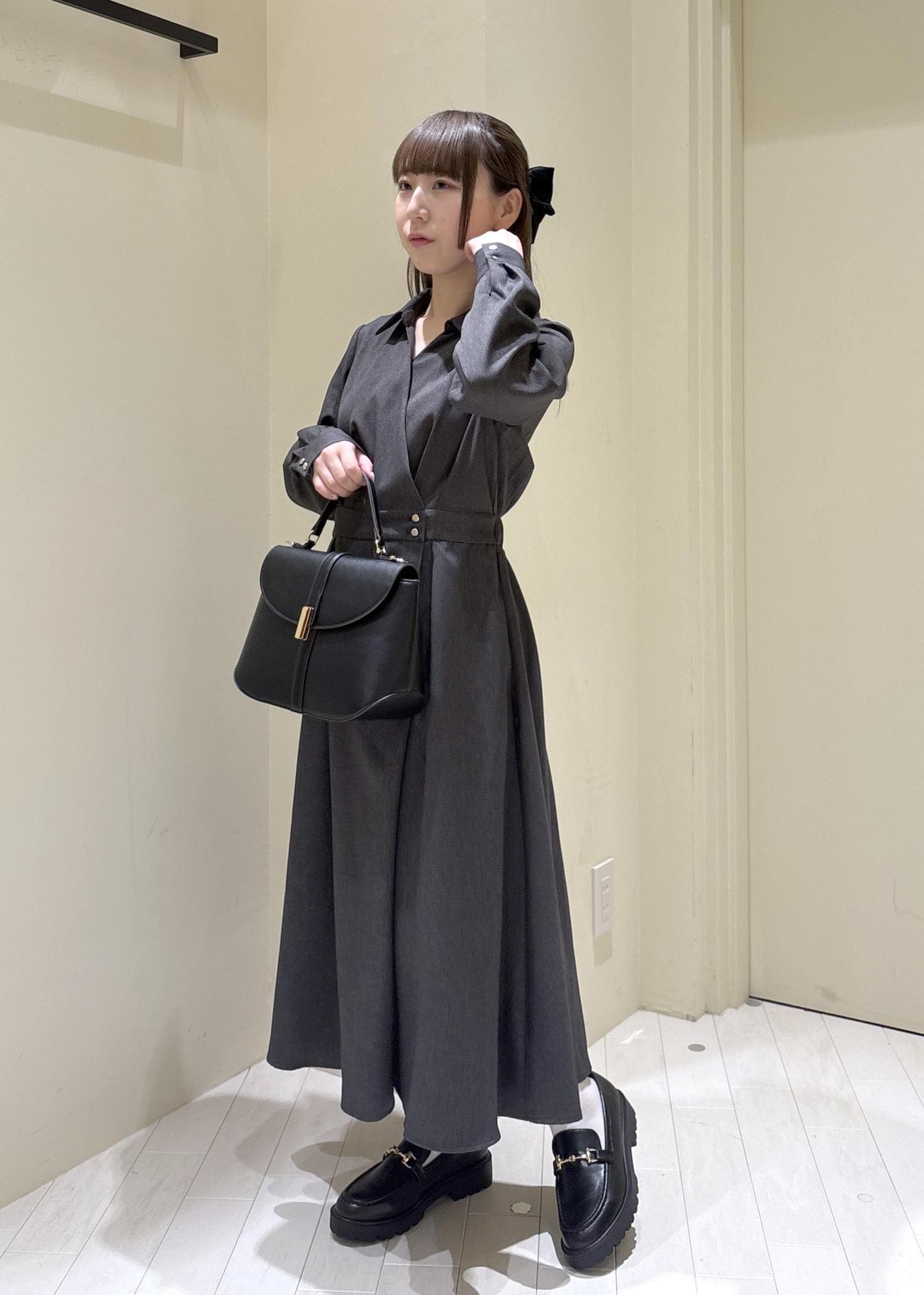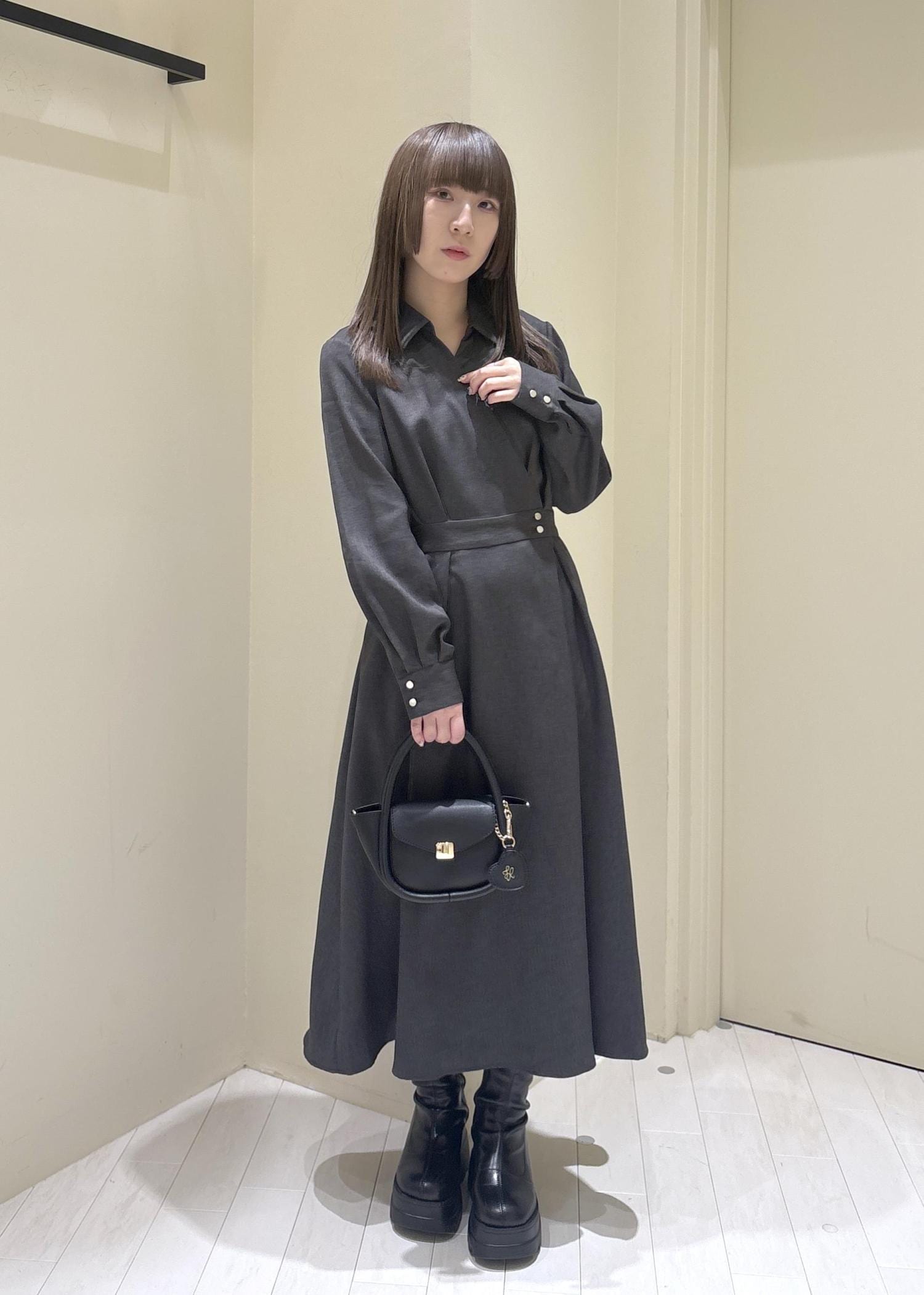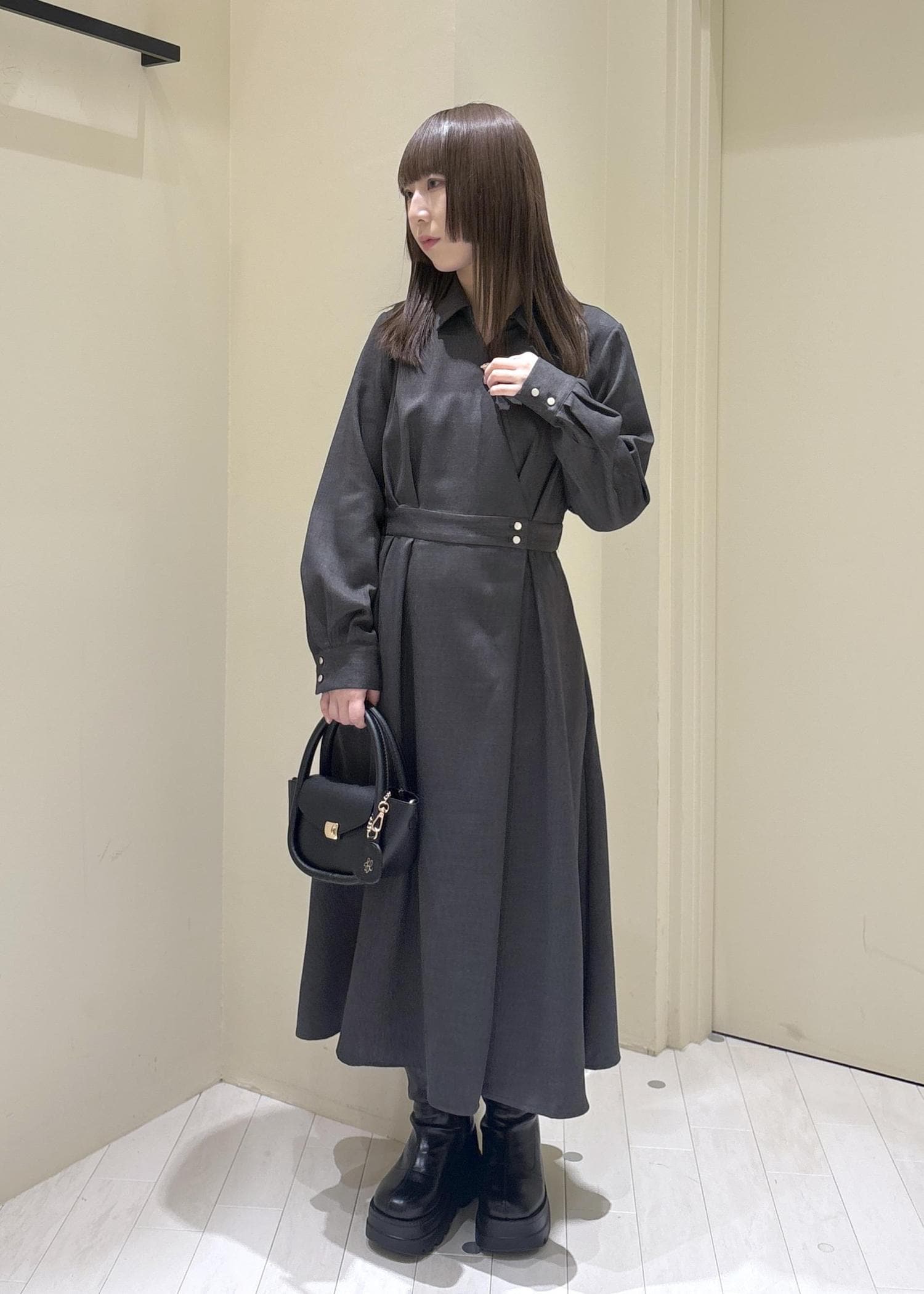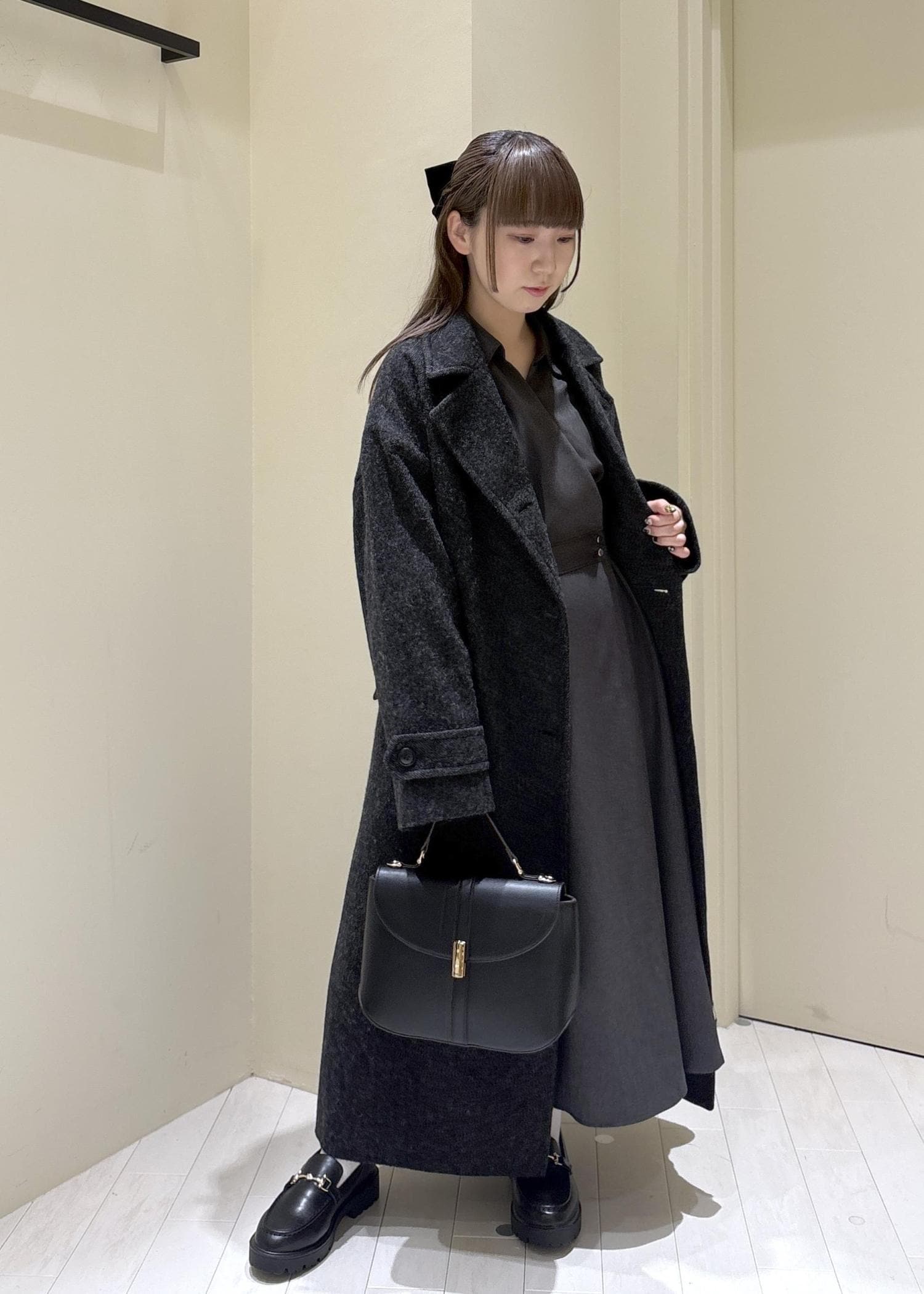 スタイリッシュで大人っぽく、直線的なイメージで髪を下ろし、でも強くなりすぎないように丸いバッグを選び大人っぽいコーデを組みました。(※靴は私物です。)