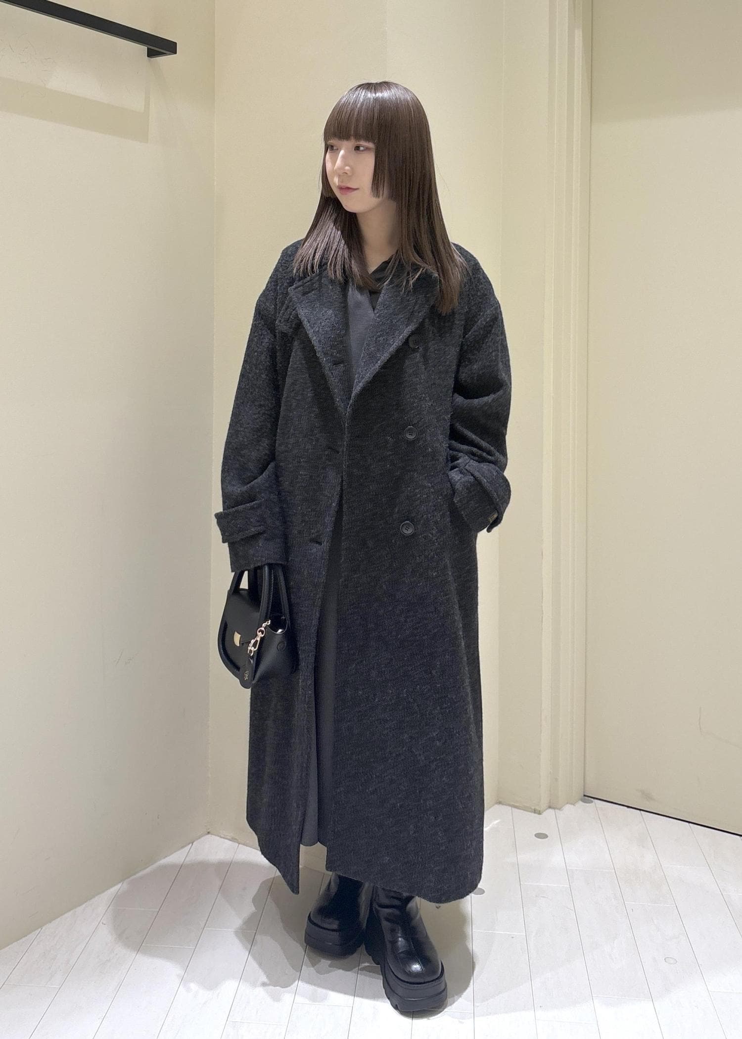 同じワンピース、ロングコートを使って全く印象が違うクールとキュートなコーデを組みました◎