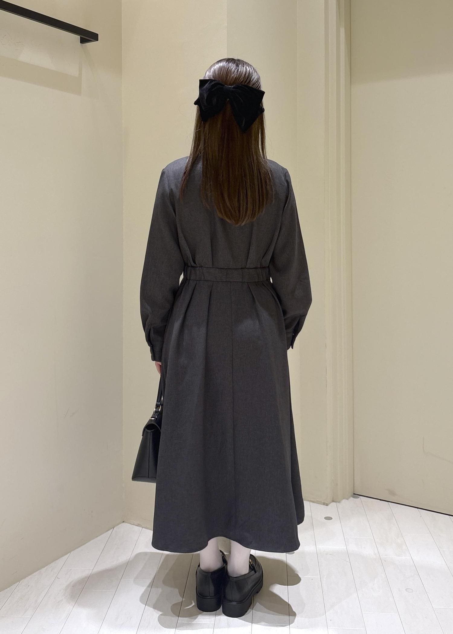 白タイツにローファー、頭に大きなリボンを合わせ可愛い雰囲気で、バッグも大きめのものを選び絵本に出てくる主人公をイメージしてコーデを組みました。