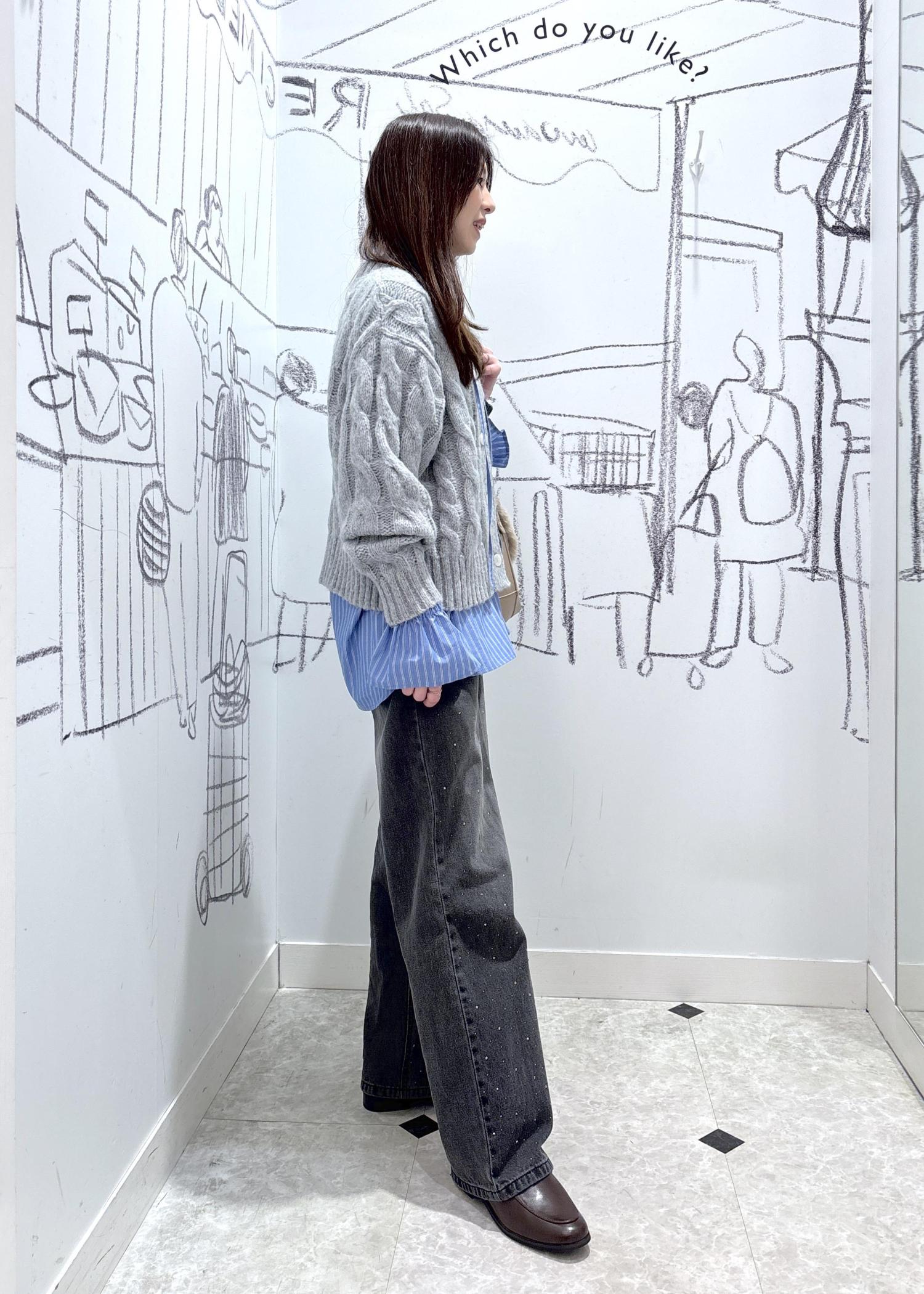 アイテムがシンプルなので、レイヤードや、デニムのキラキラビジューでアクセントを出しました。