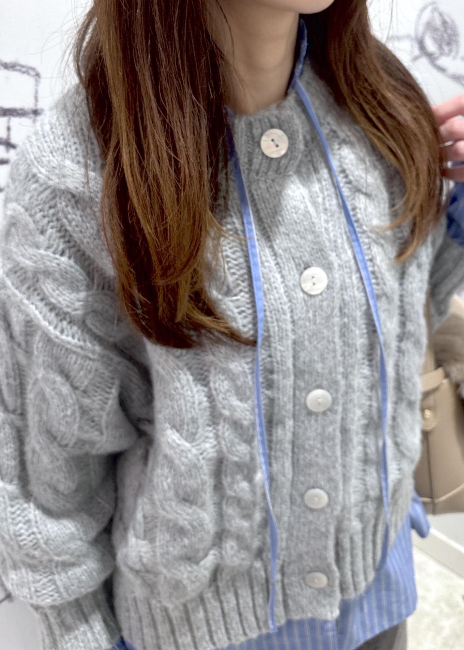 ショート丈のケーブル編みカーディガンをシャツとレイヤードしデニムと合わせたカジュアルなコーディネートです。