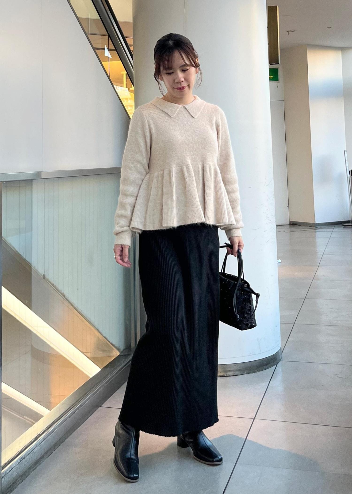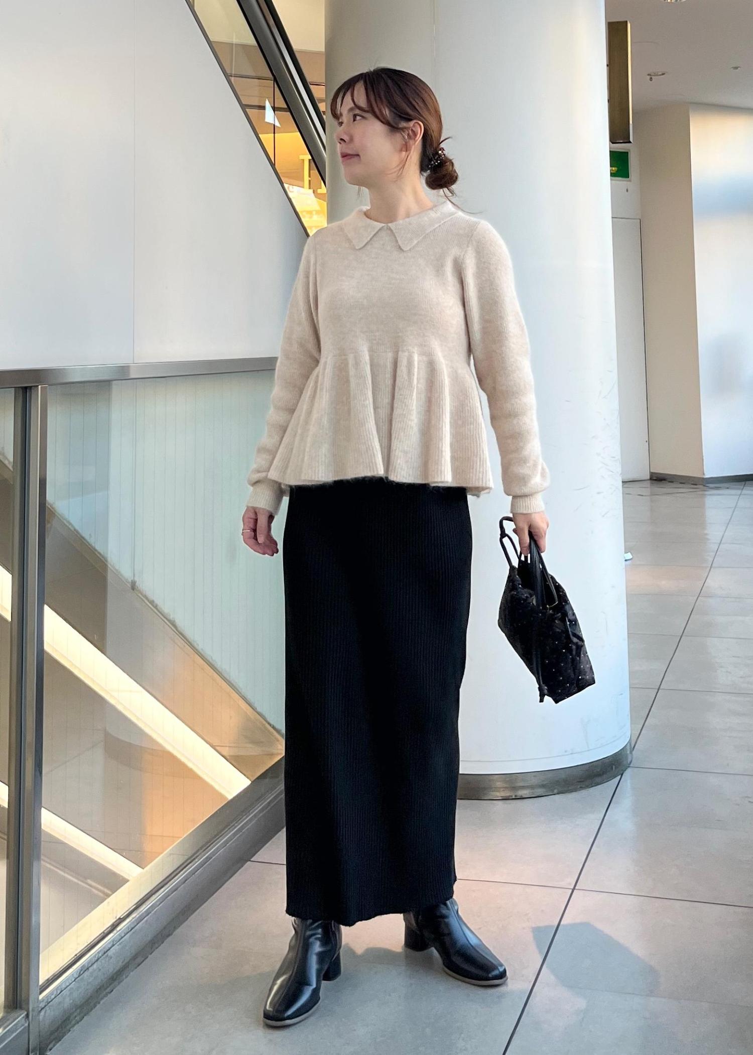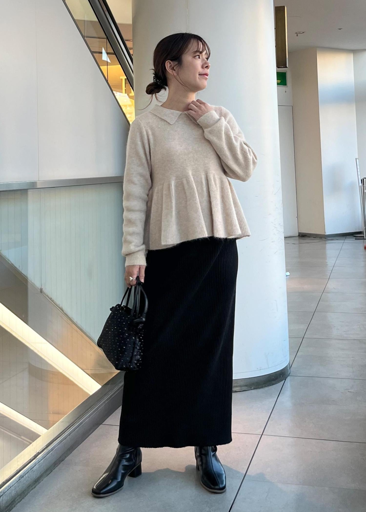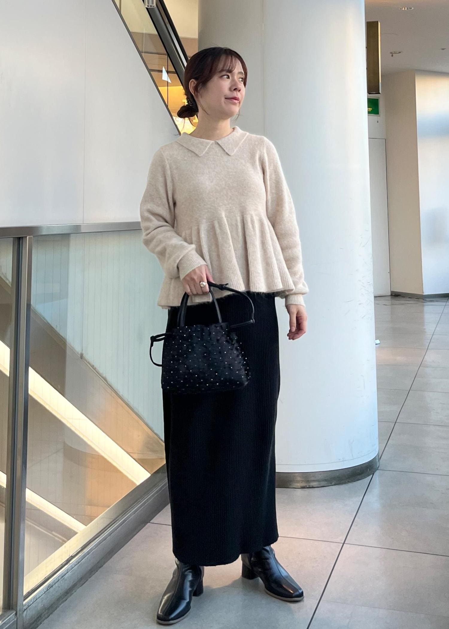 襟付きのペプラムニットは少し甘めな印象ですが、アイラインのスカートに小物を黒でまとめて大人なスタイルにしました(^_^)