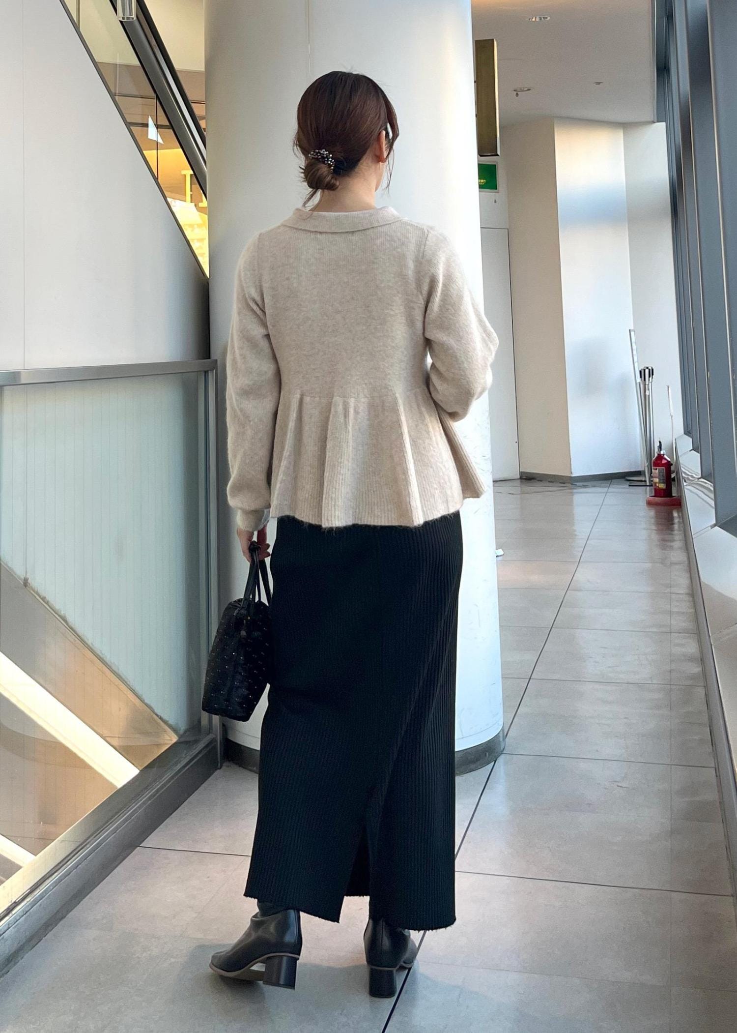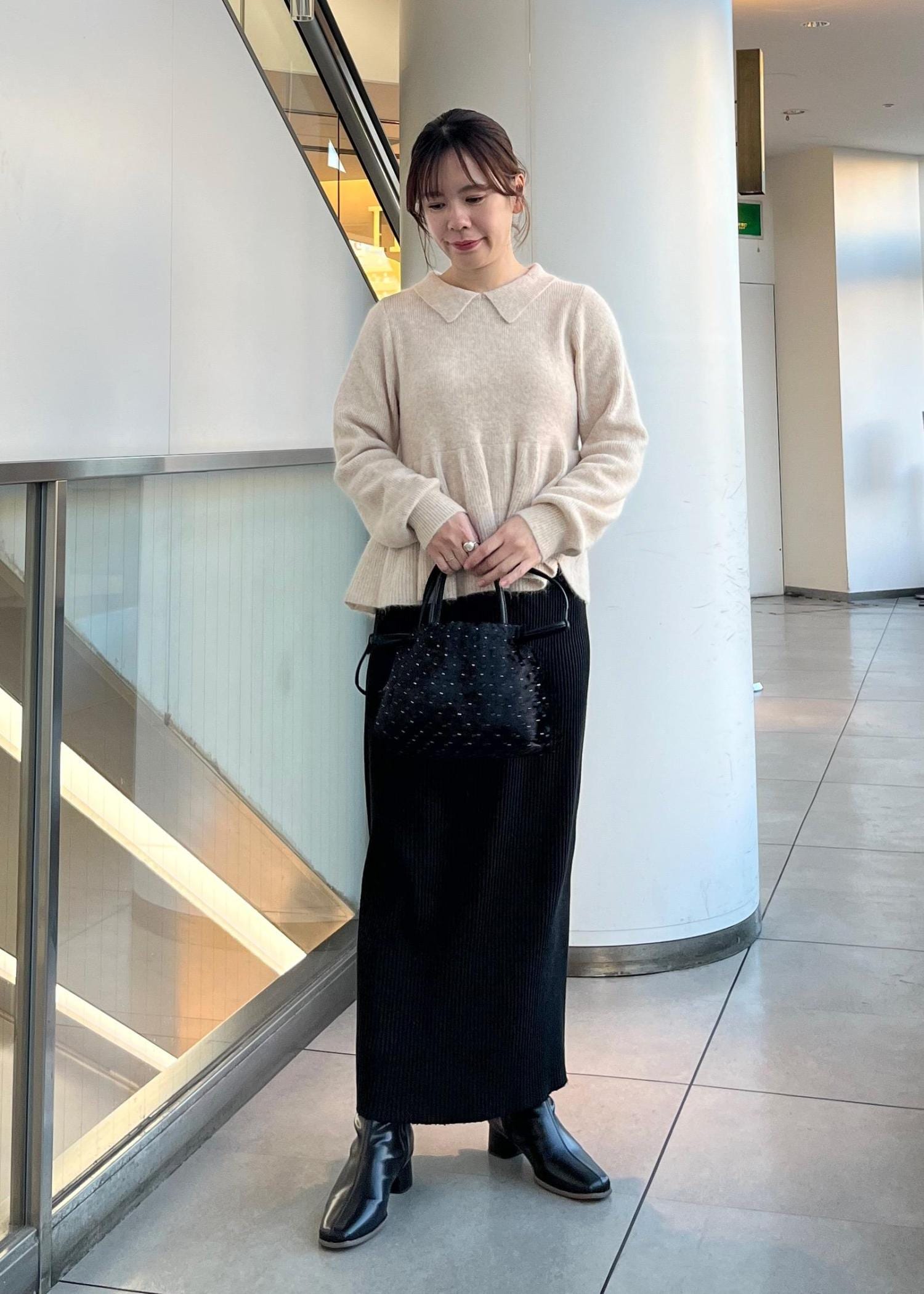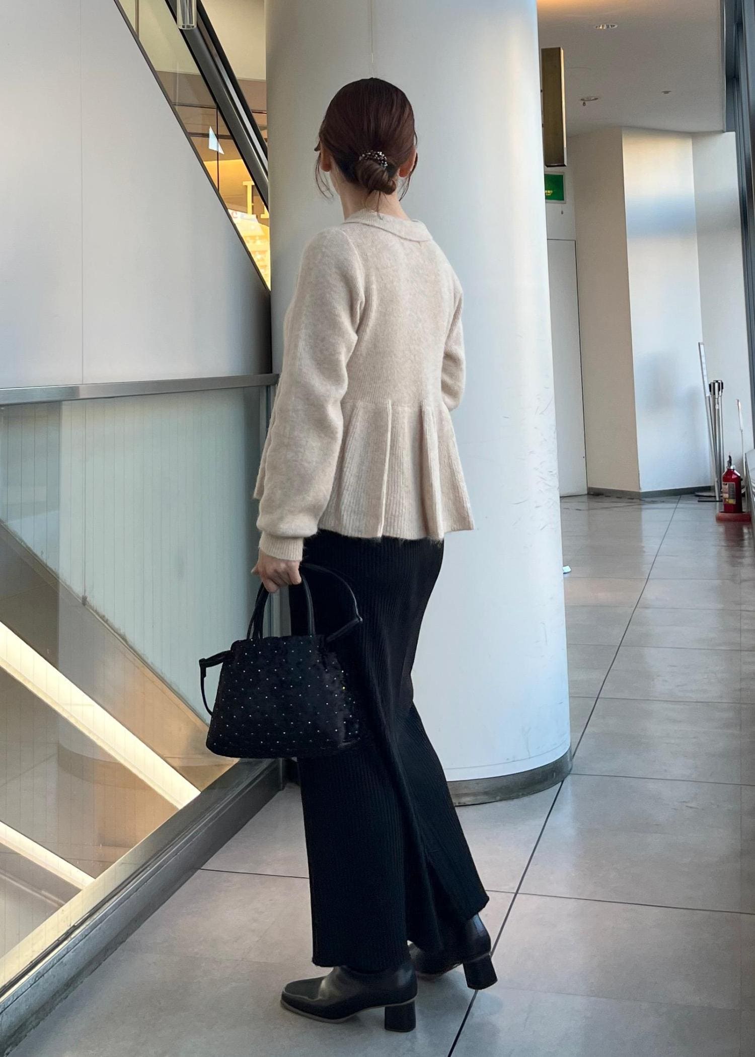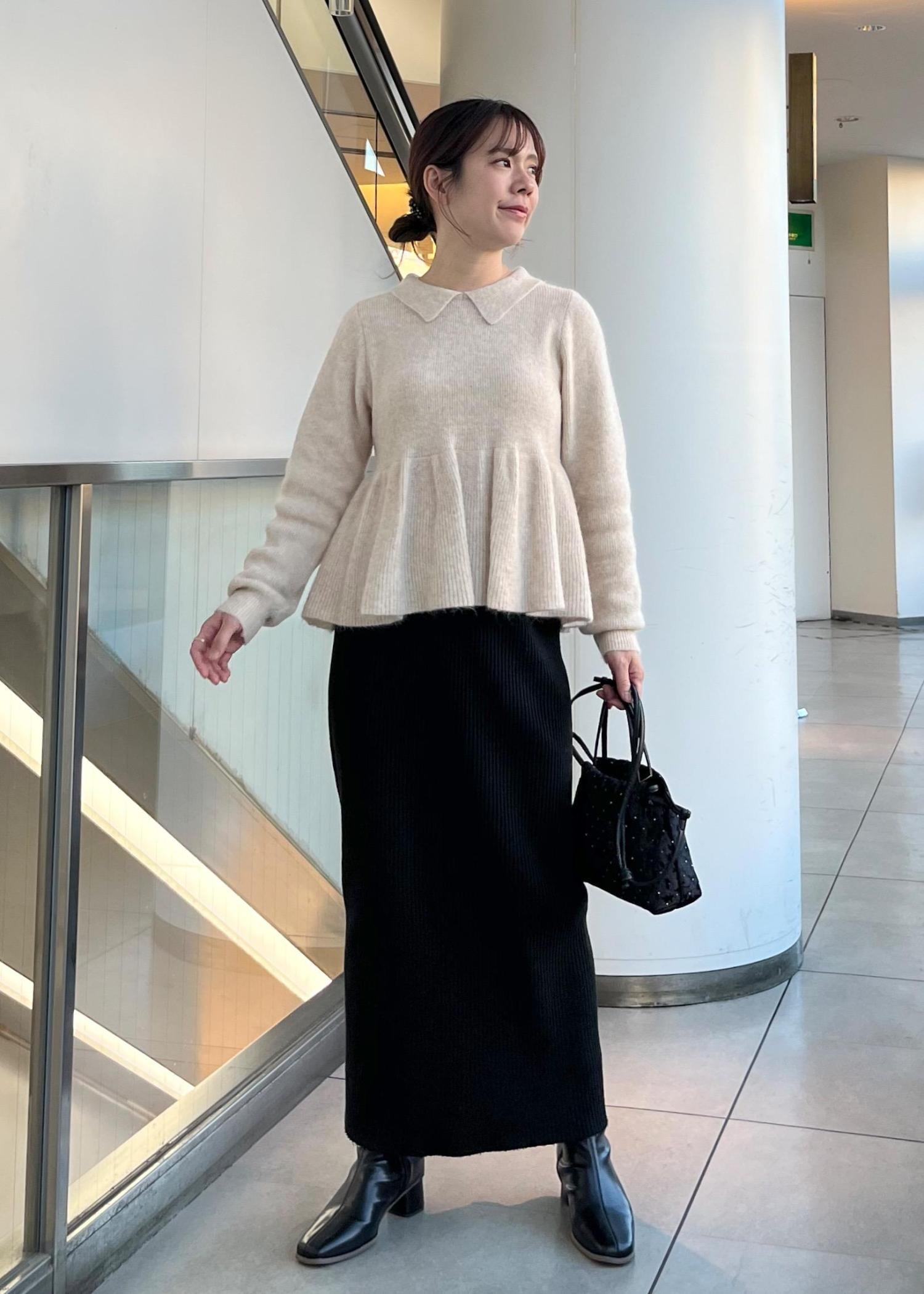 襟付きのペプラムニットは少し甘めな印象ですが、アイラインのスカートに小物を黒でまとめて大人なスタイルにしました(^_^)