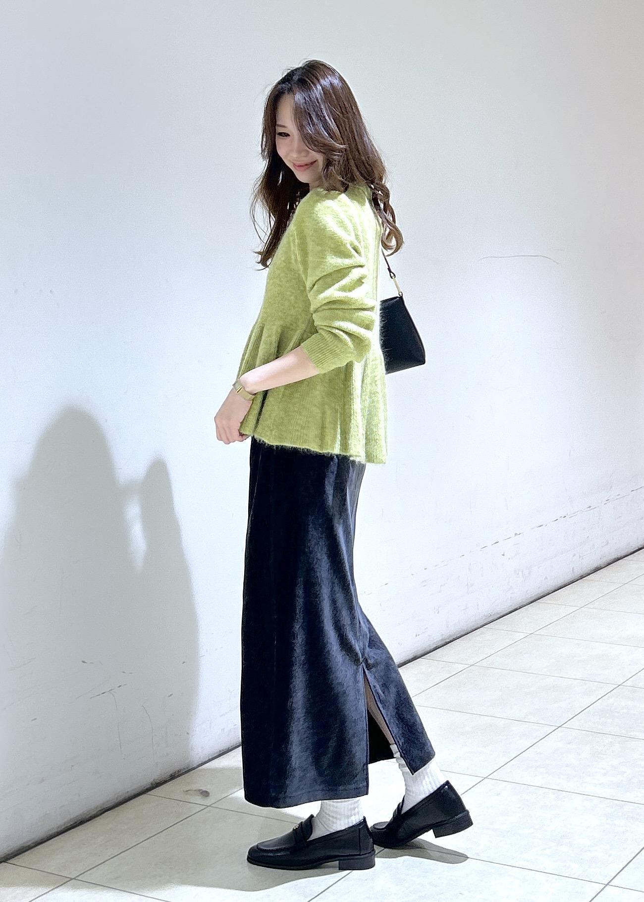 ペプラムニットにグレーのスカートで落ち着いた綺麗めなスタイリングにしました。
