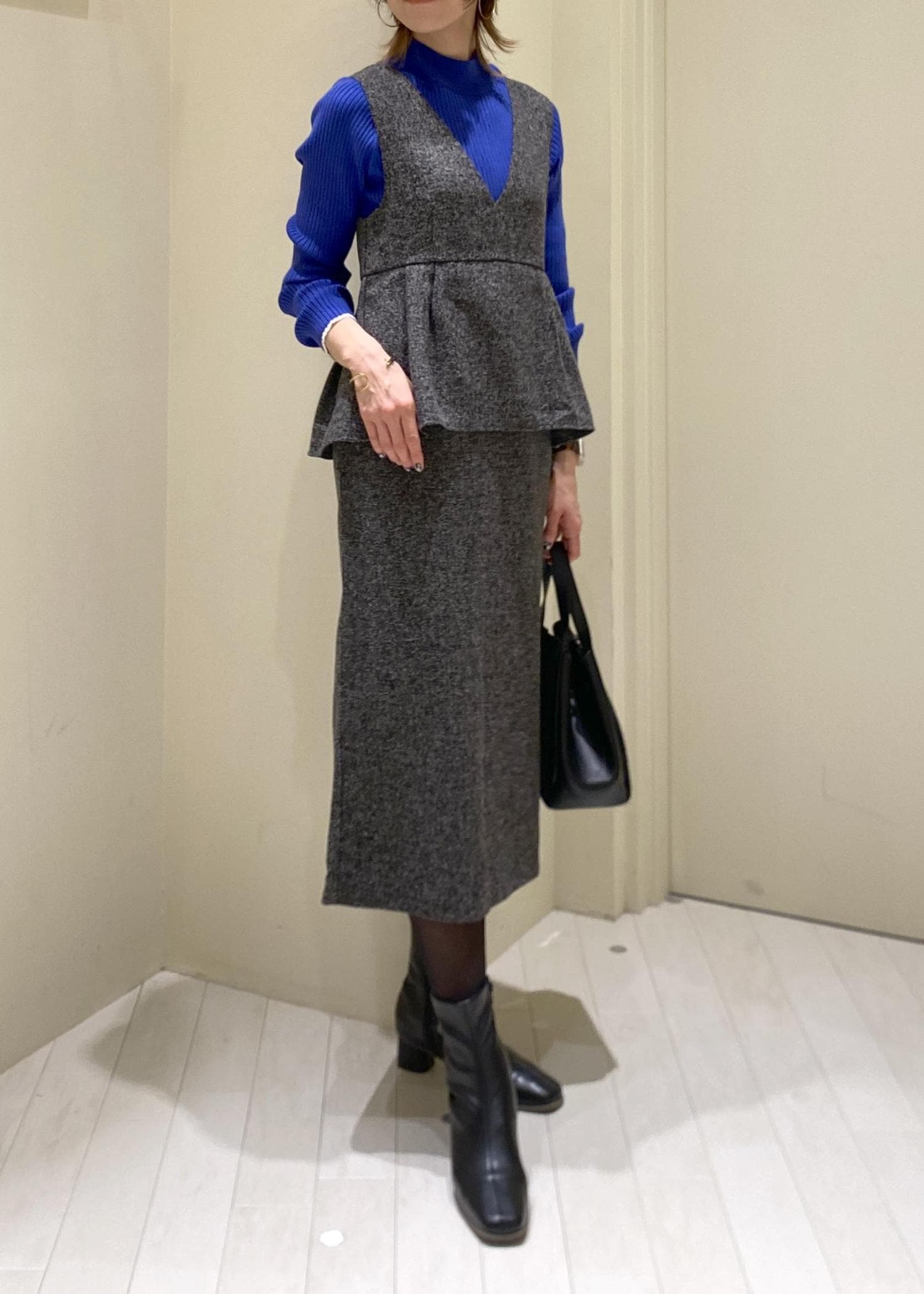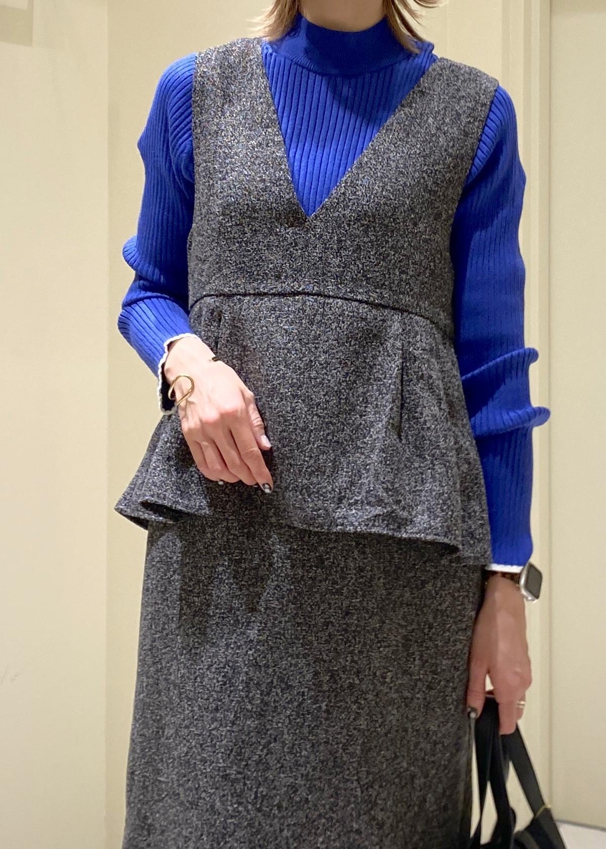 ROPÉ PICNIC【新色追加】レイヤード風ペプラムジャンパースカートチャコール / L¥6,398レビューアイラインシルエットですが、ペプラムデザインで腰回りをカバー。深めのVネックで縦ラインが強調されスタイルアップ効果抜群です。