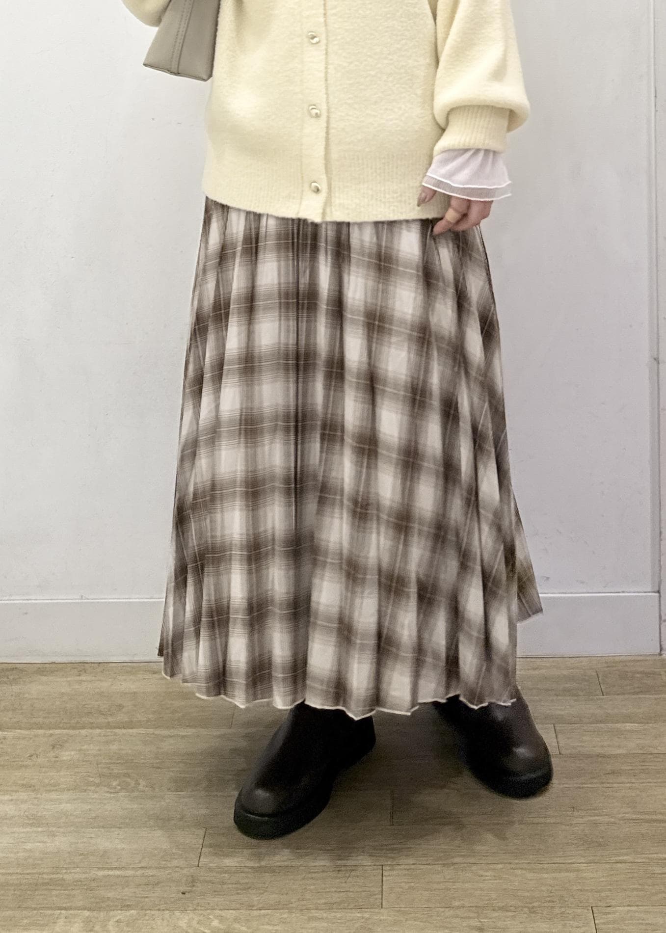 着丈は足首が少し見えるぐらいの長さで、ふんわりとしたフレアシルエットのスカートです。 -