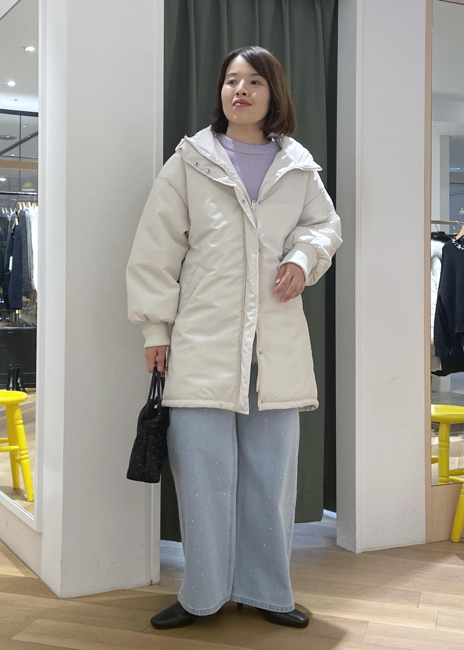 白の中綿アウターにパープルのニットを合わせた、春の肌寒い日にも使える春カラーコーデです!