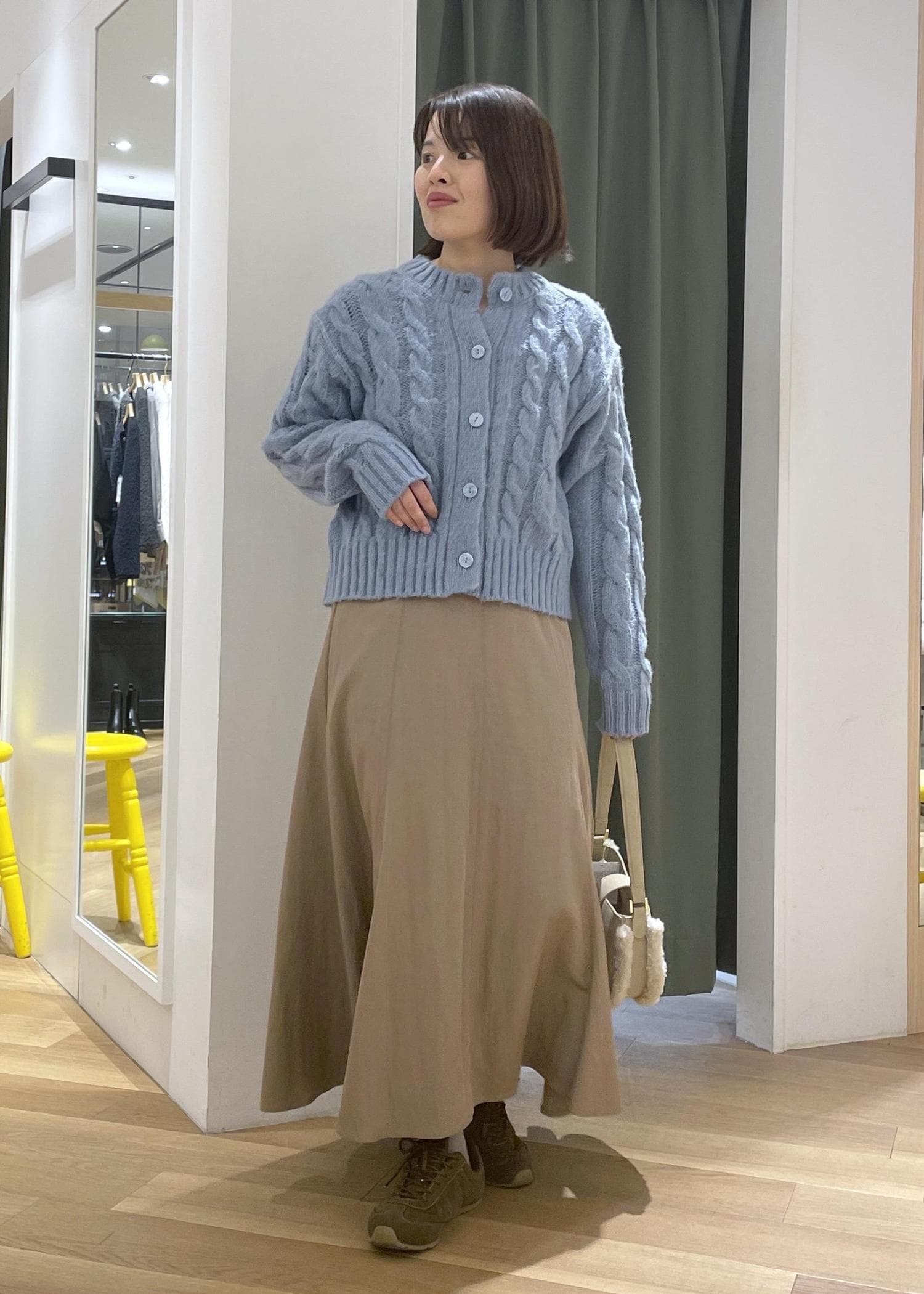 ベーシックなカラー合わせなので、ブルーのカーディガンをアクセントで合わせてみました◎