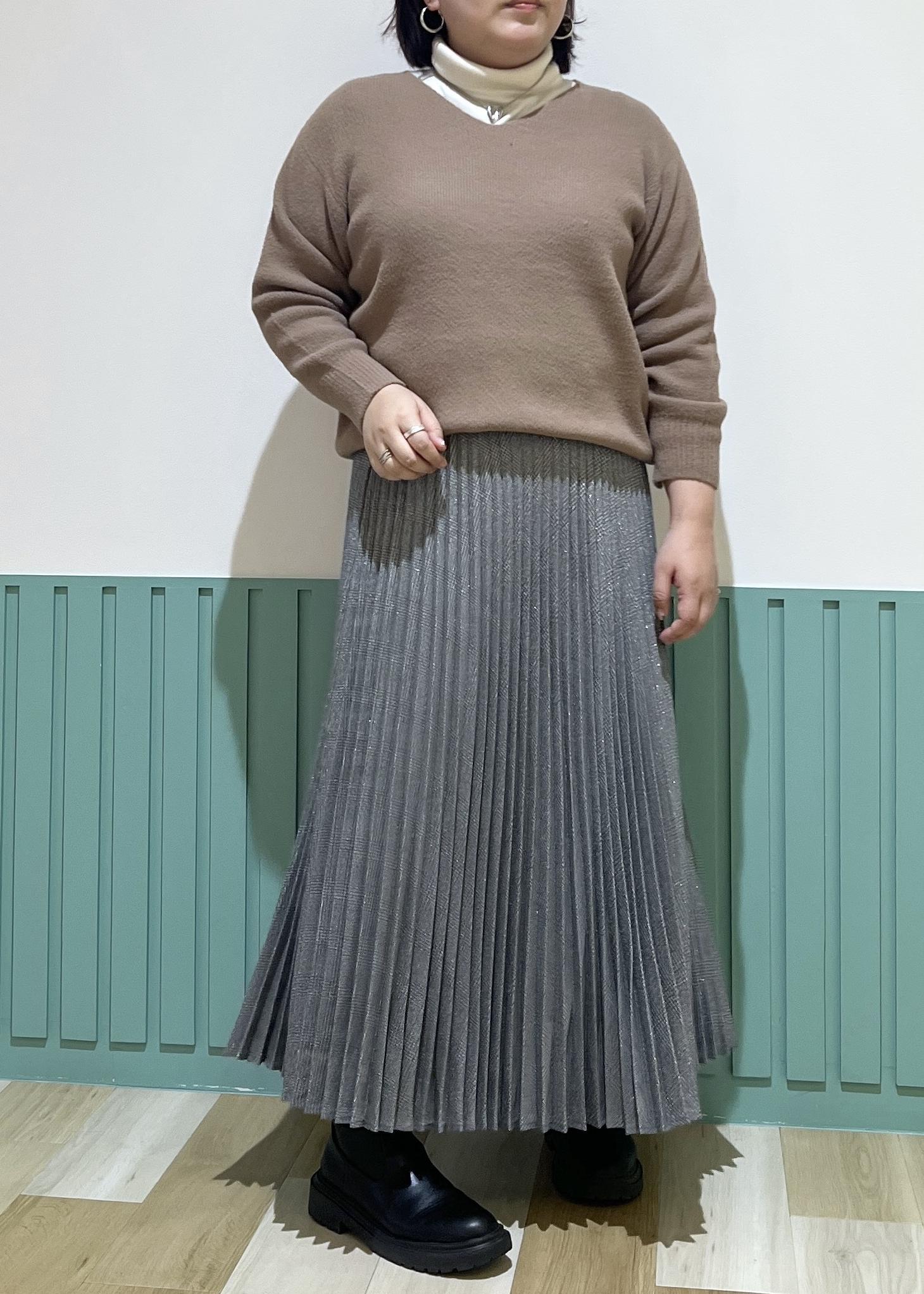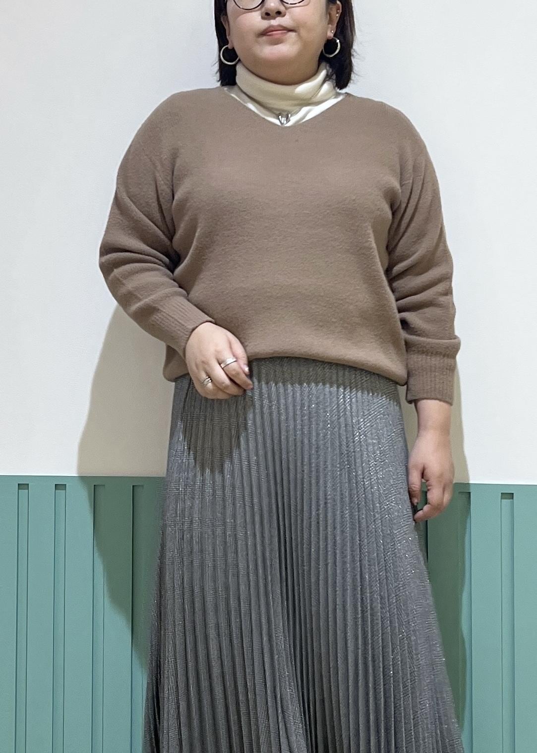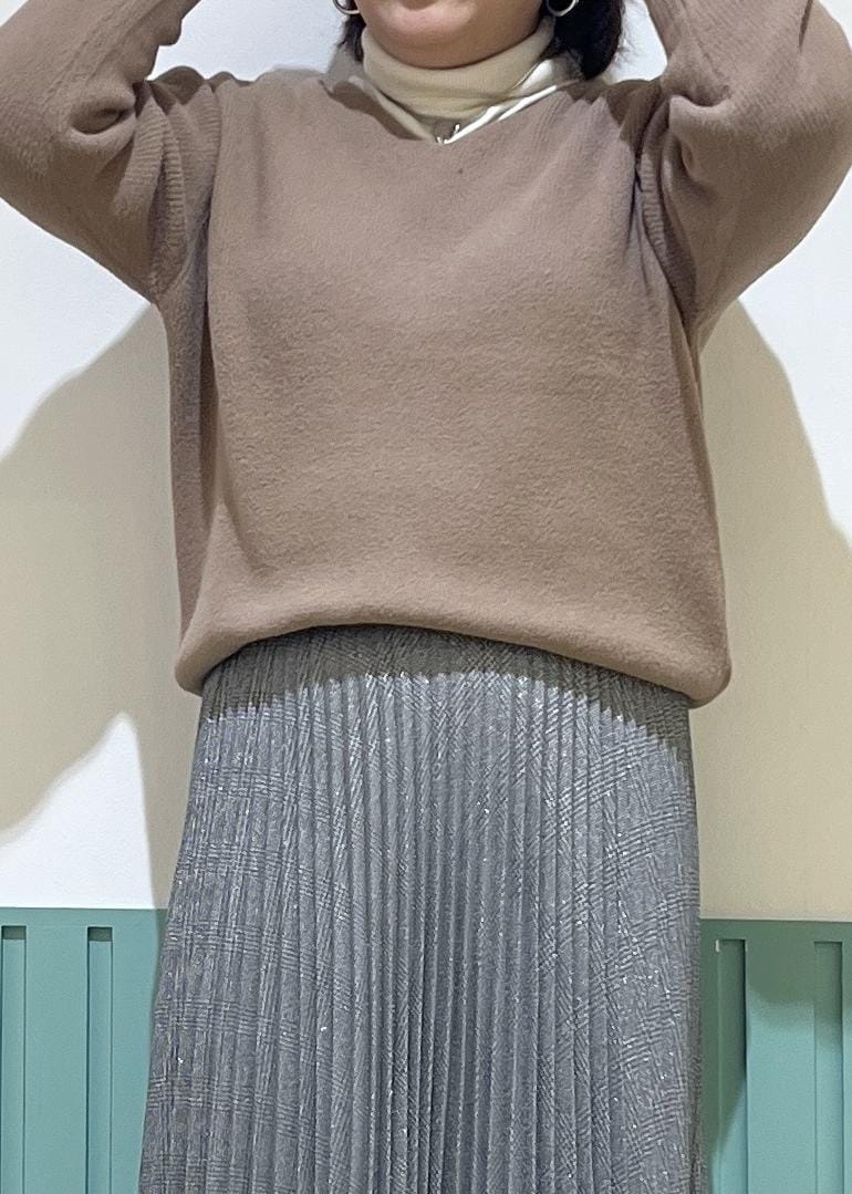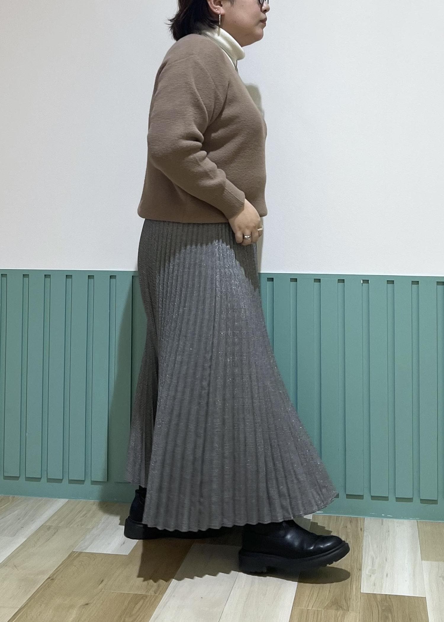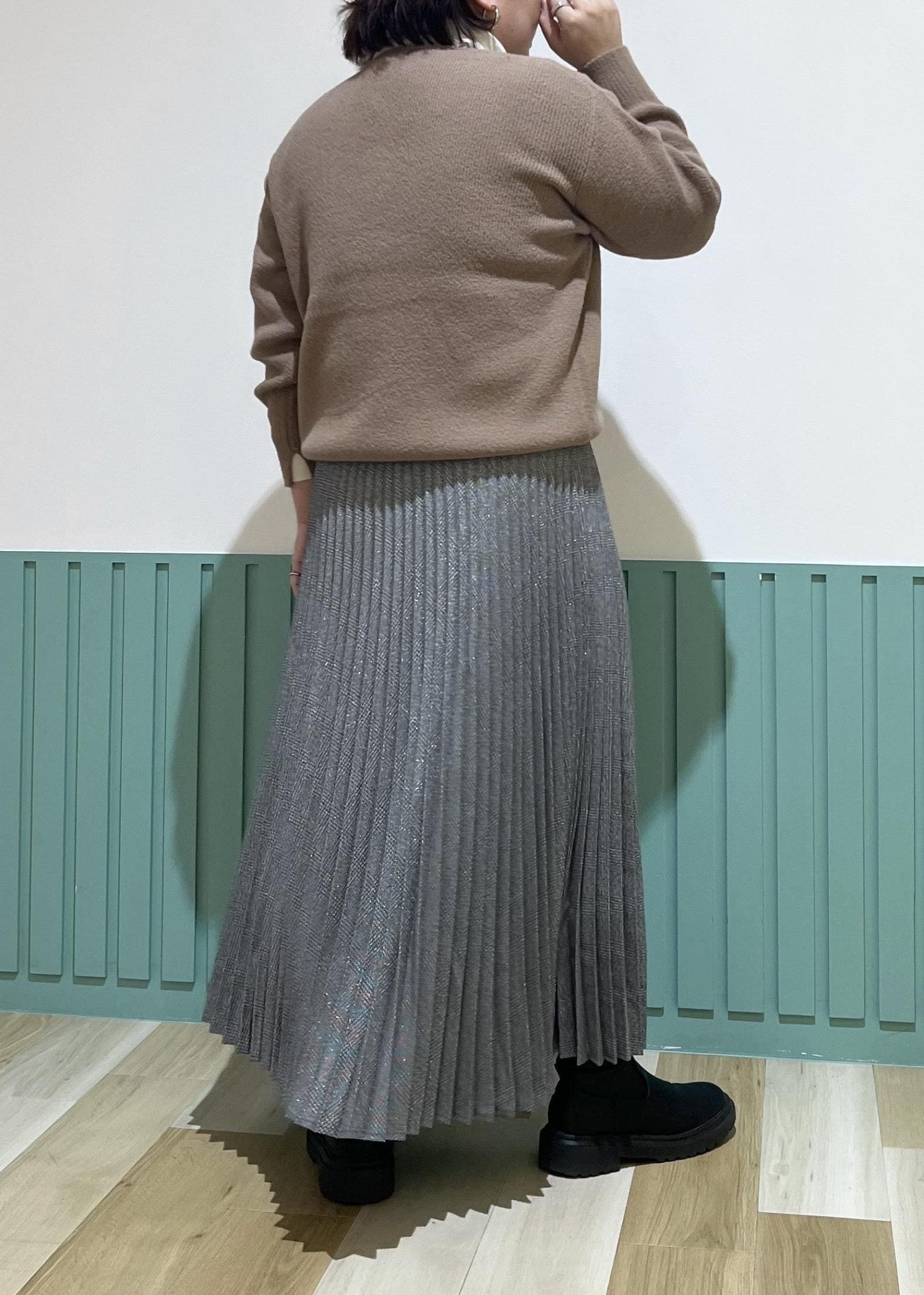 ベージュ、グレー、ホワイトの落ち着いたカラーのレイヤードスタイルは、スカートのラメ感が上品なアクセントに。