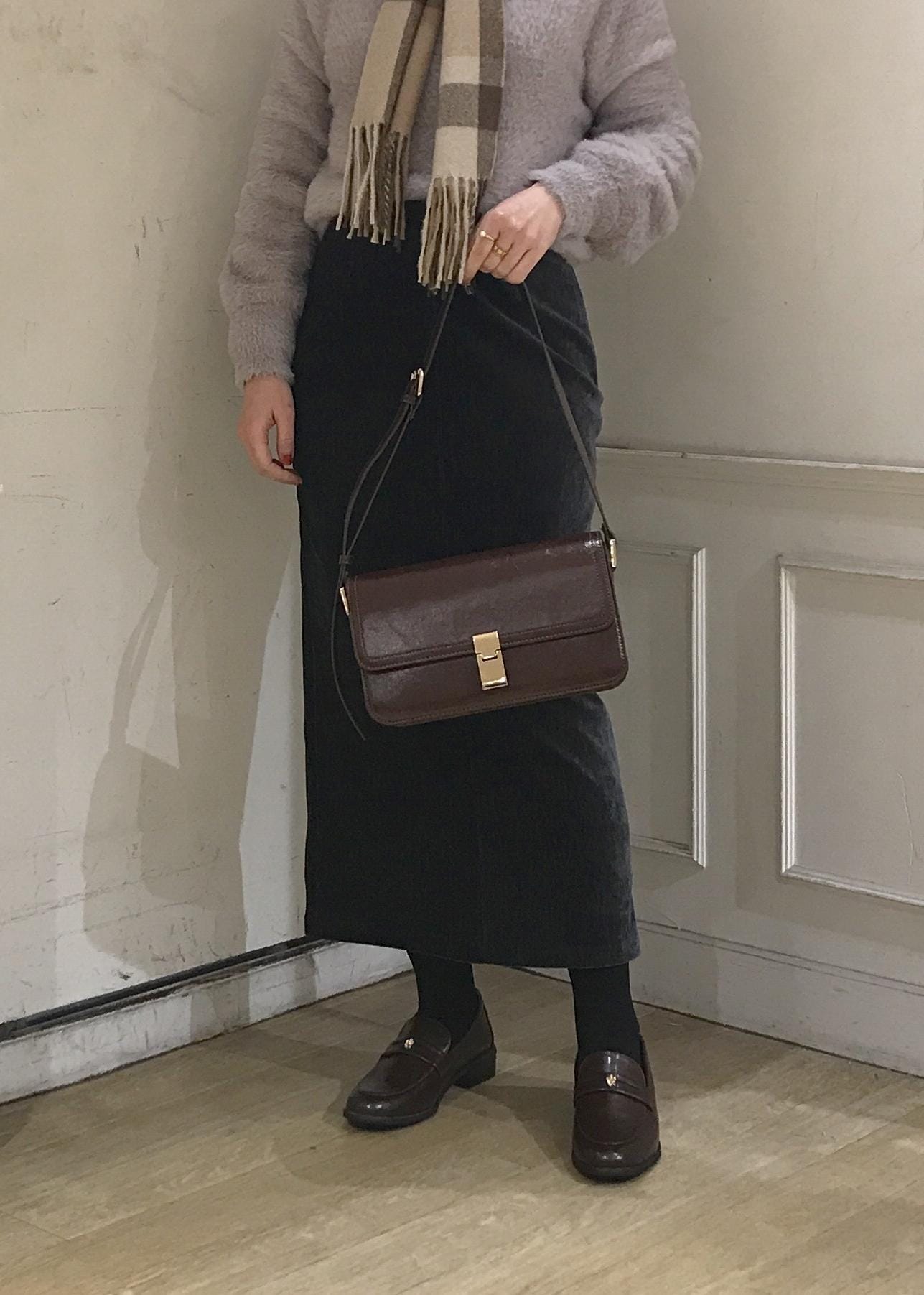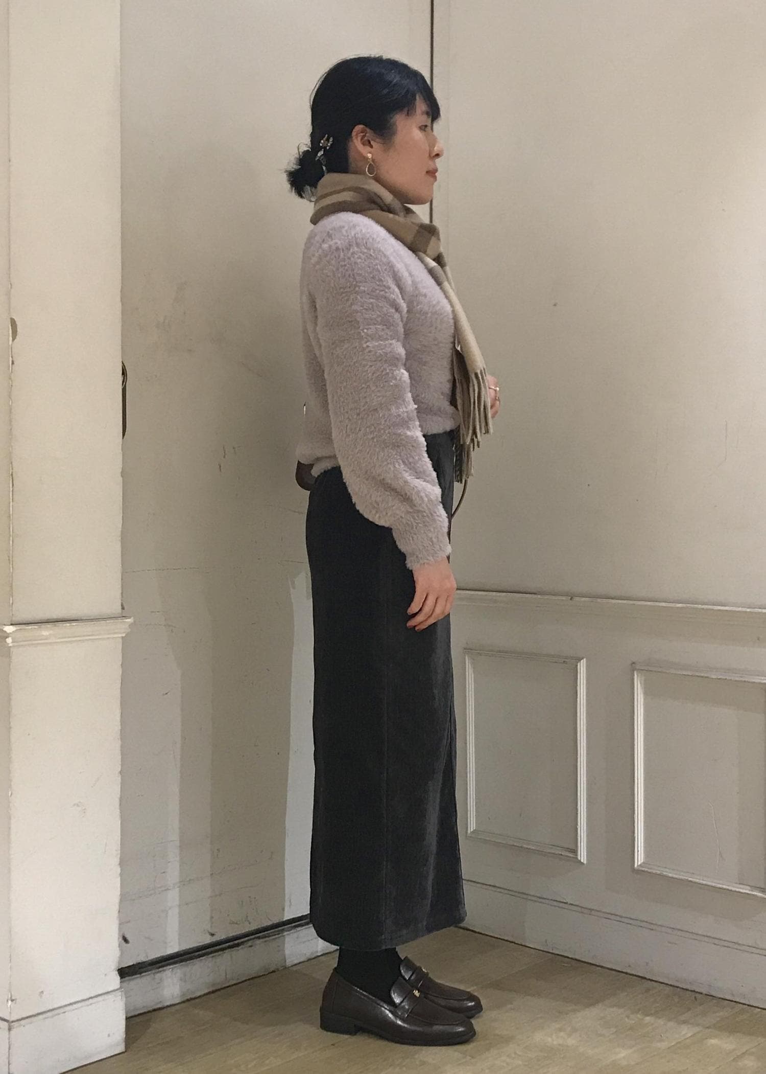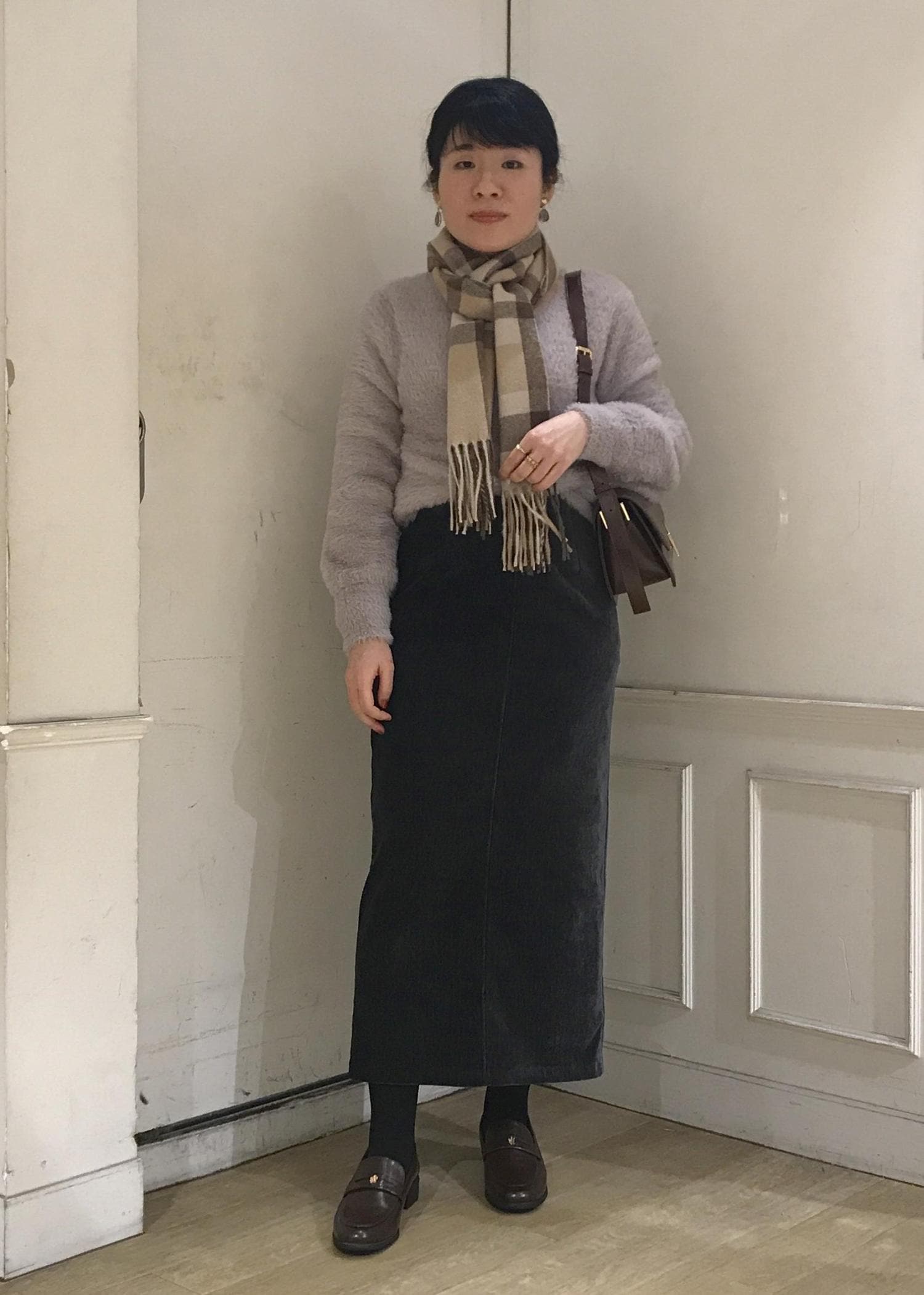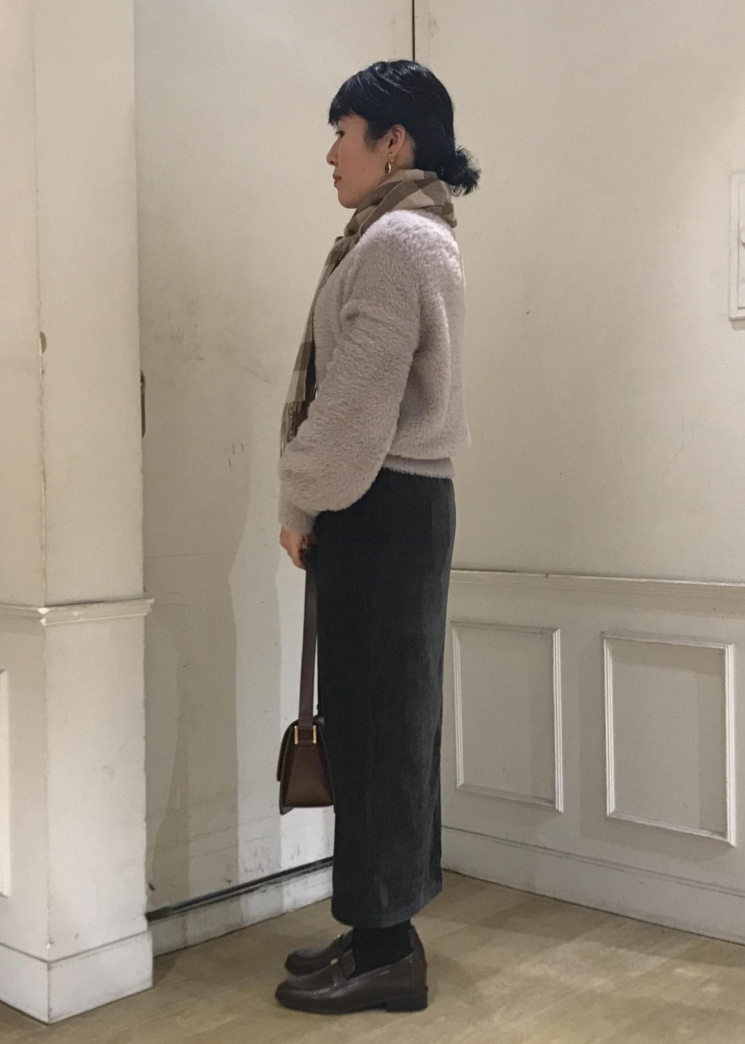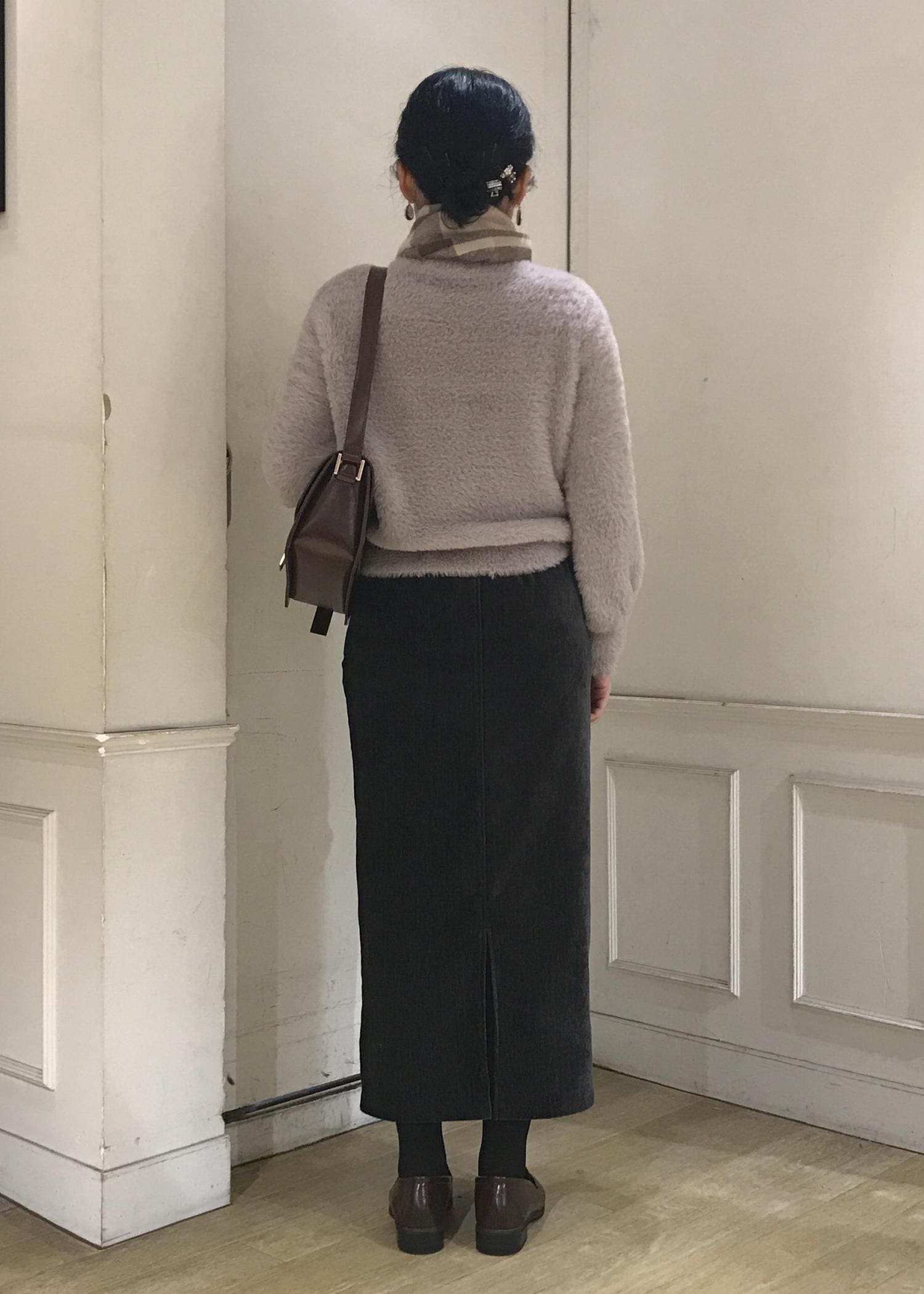 パープルのフェザーニットと首元のミラノ巻きで暖かいおしゃれを楽しめるようにしました。スカートにはベロア素材と冬ならではのアイテムを取り揃えました。