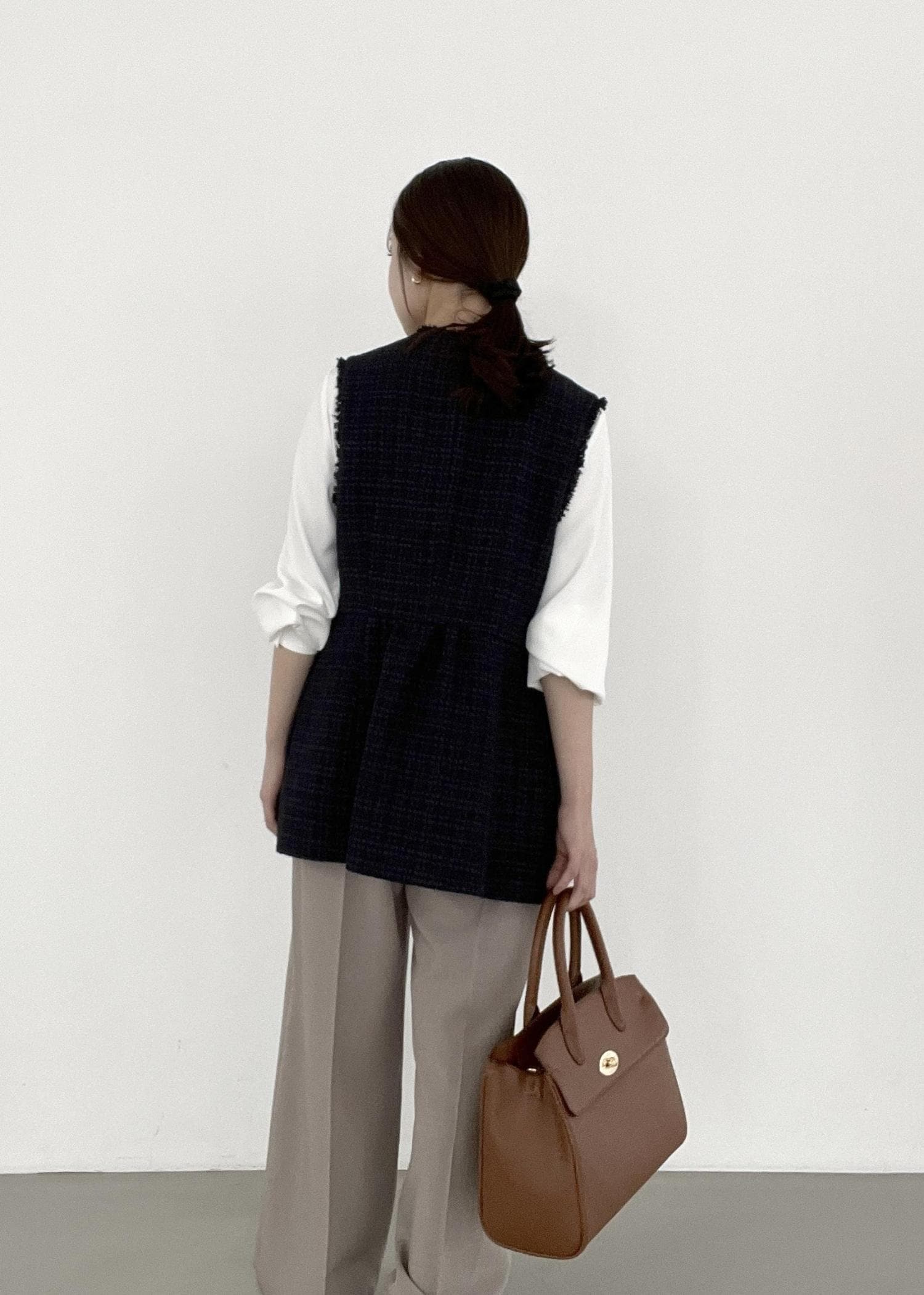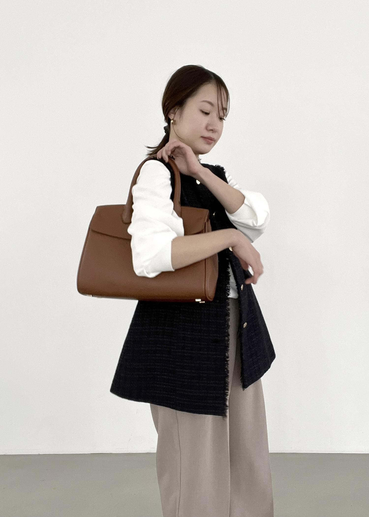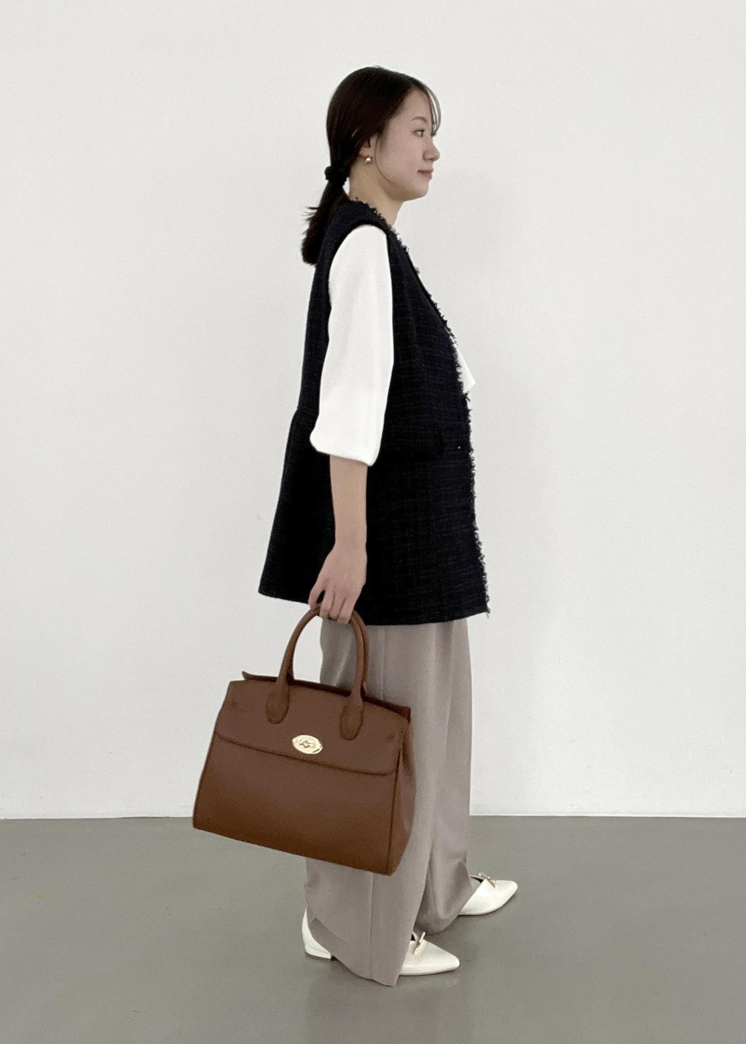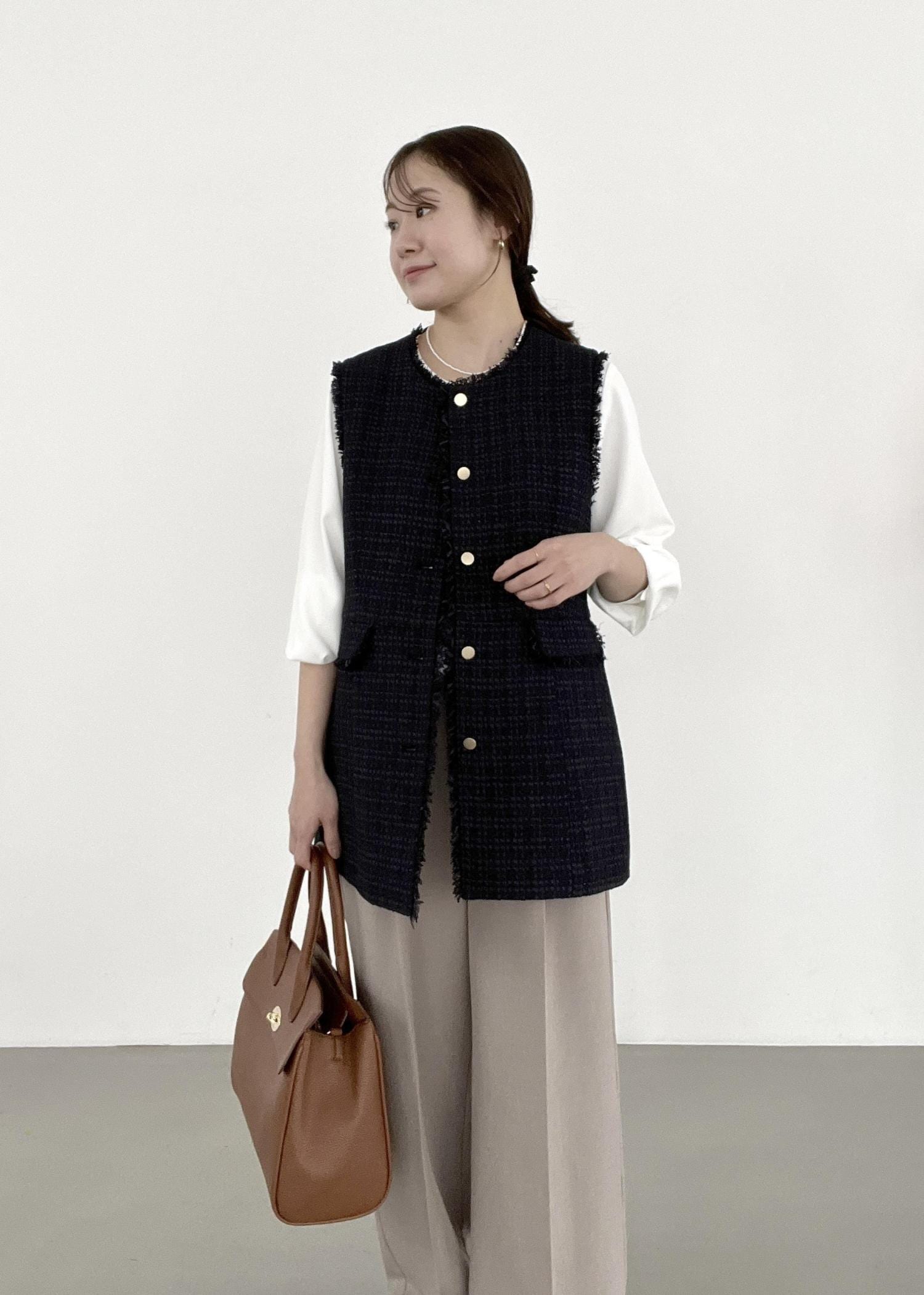 ネイビーのジレをベージュのパンツと合わせ、入卒どちらも着られるスタイリングに。