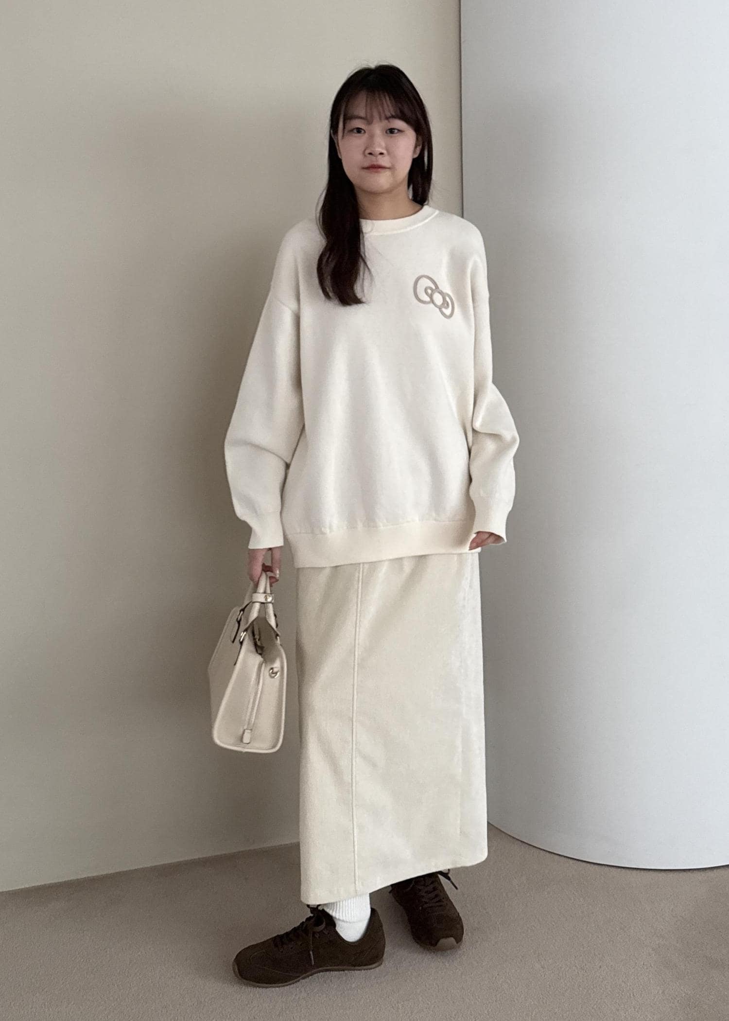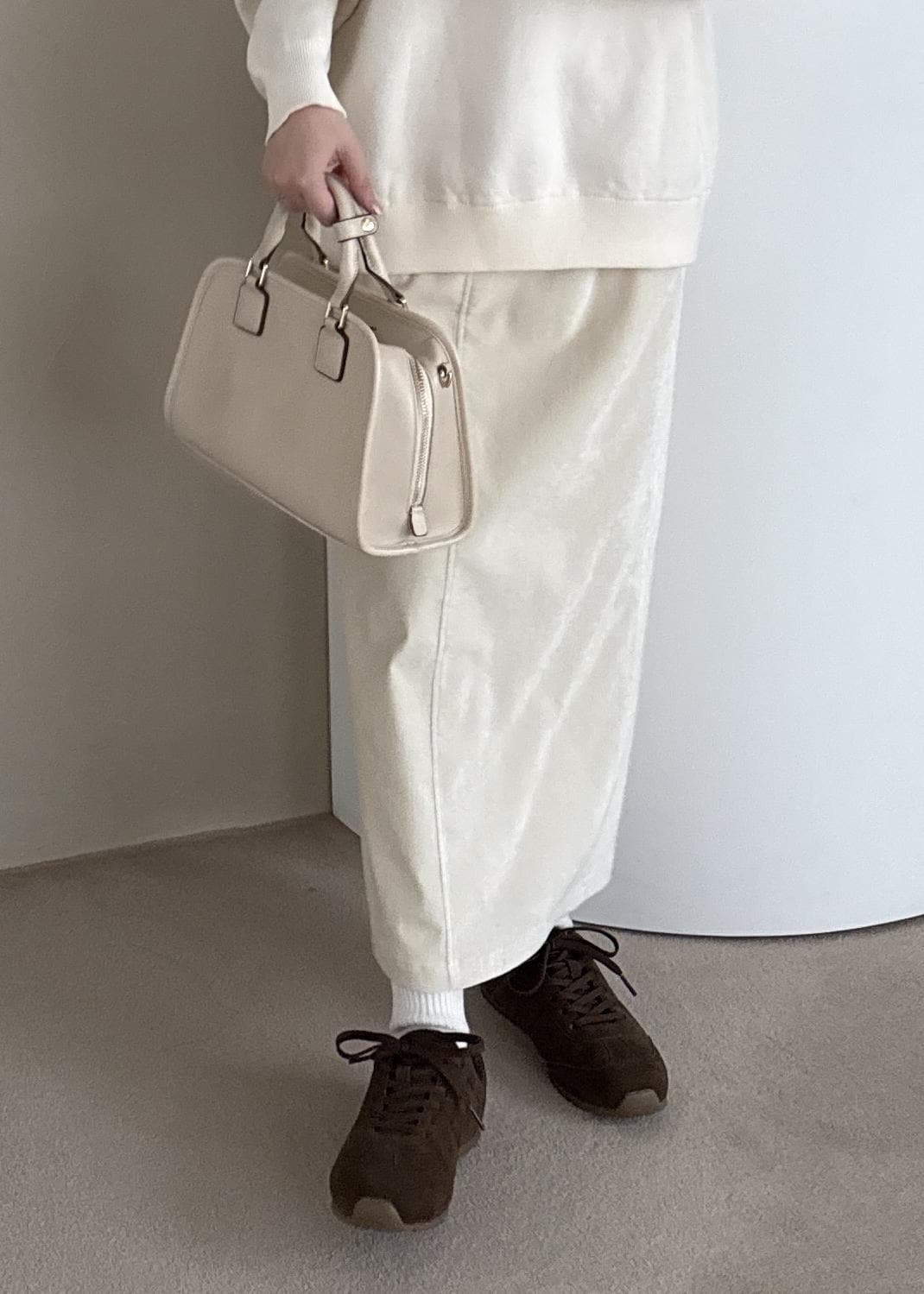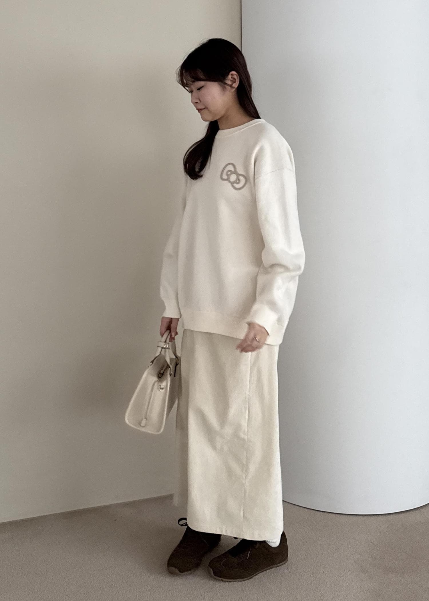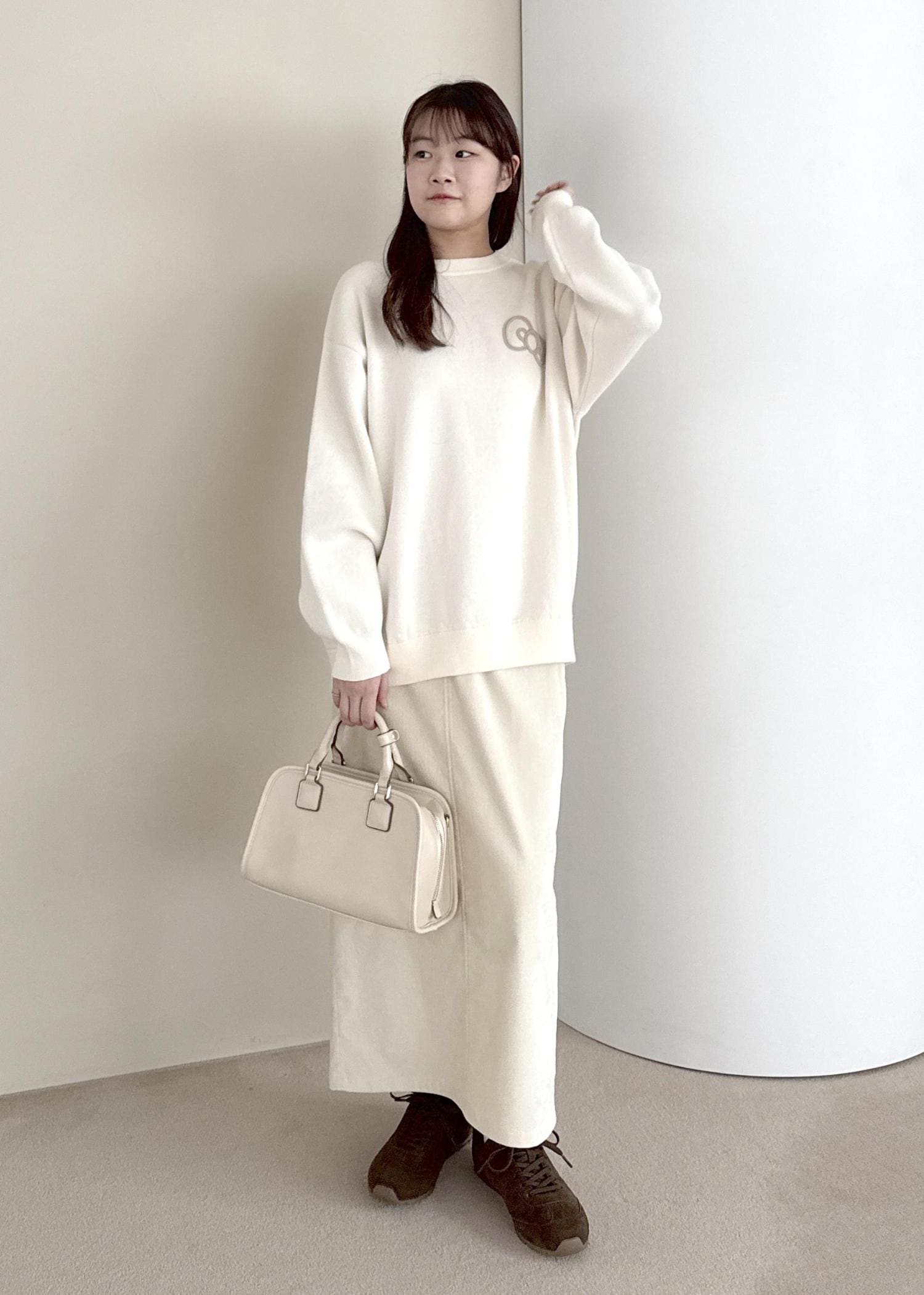 トップスとボトムを温かみのあるキナリ色で合わせたコーディネートです。