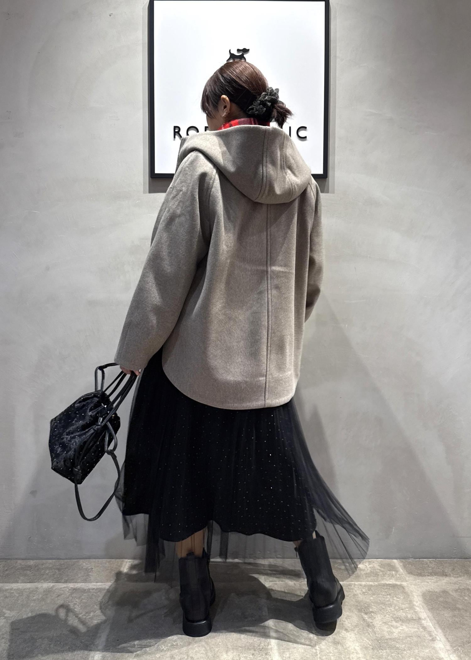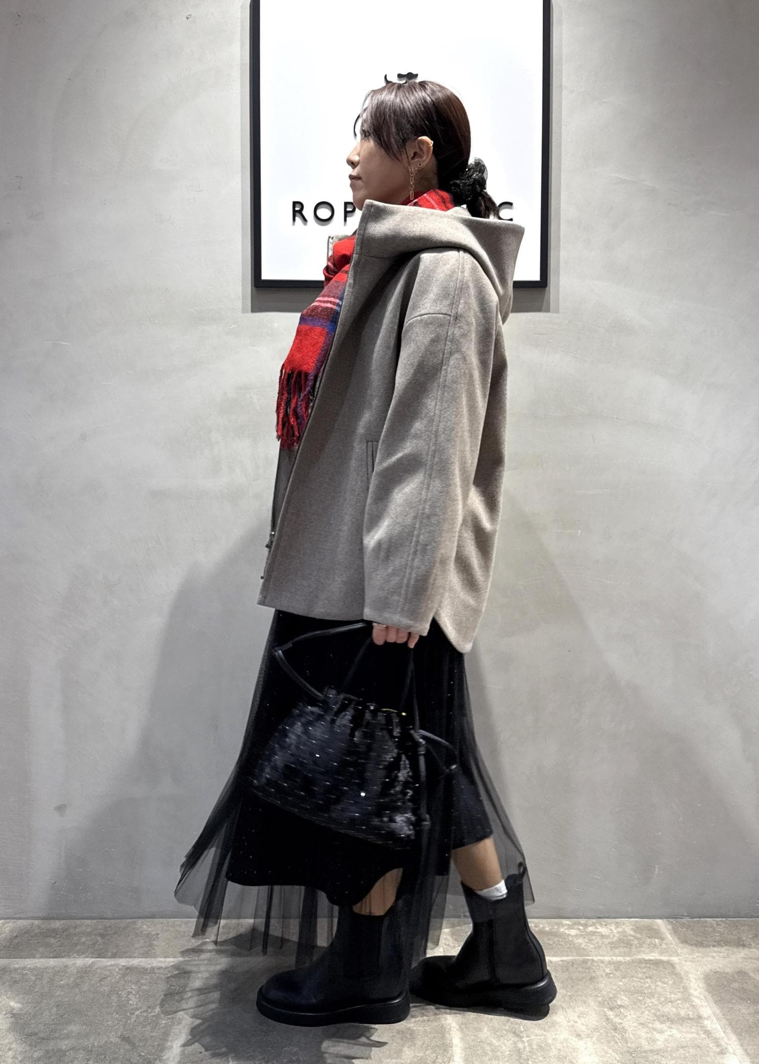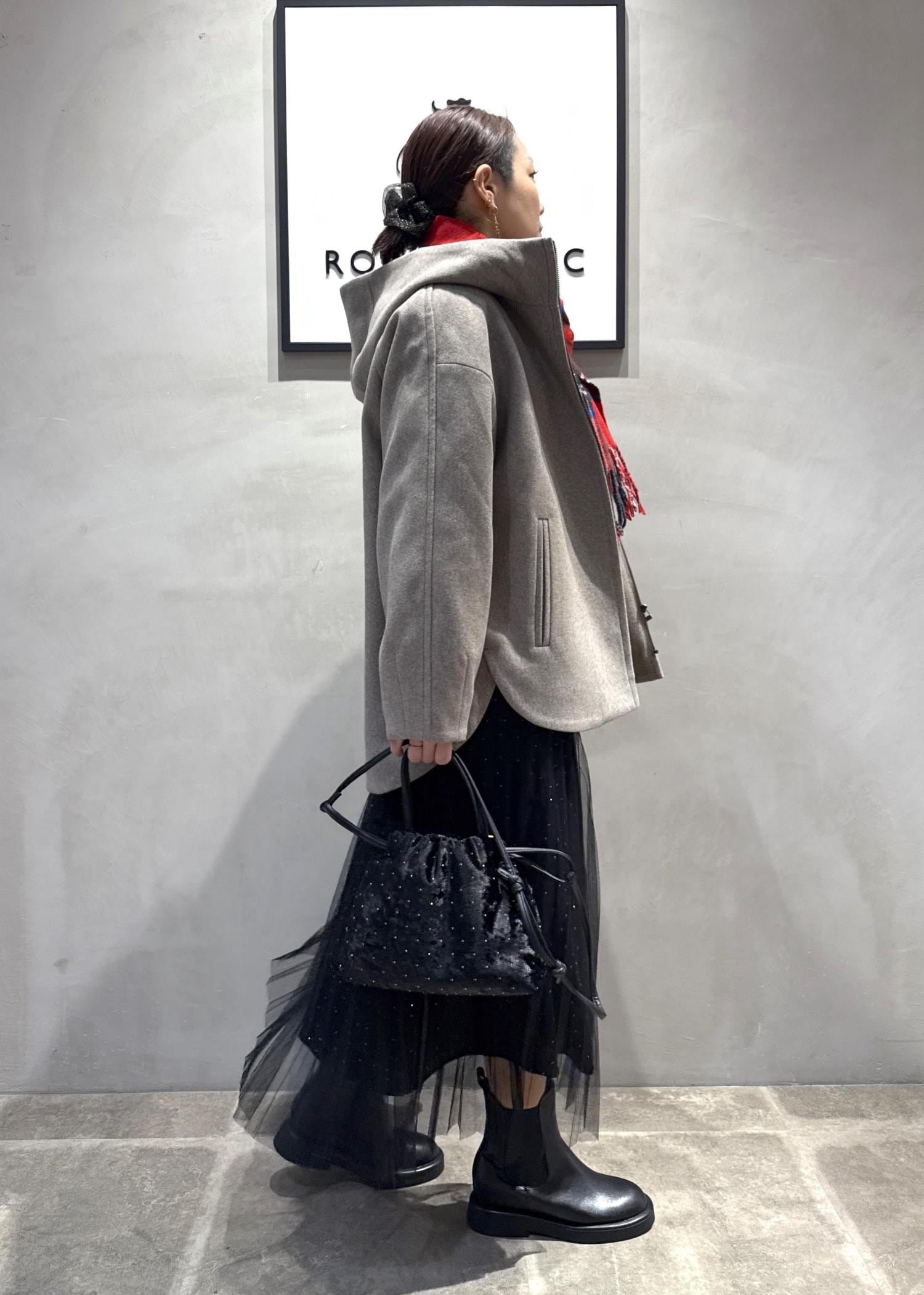 上品カラーのアウターに、さりげなく揺れるチュールスカート。
