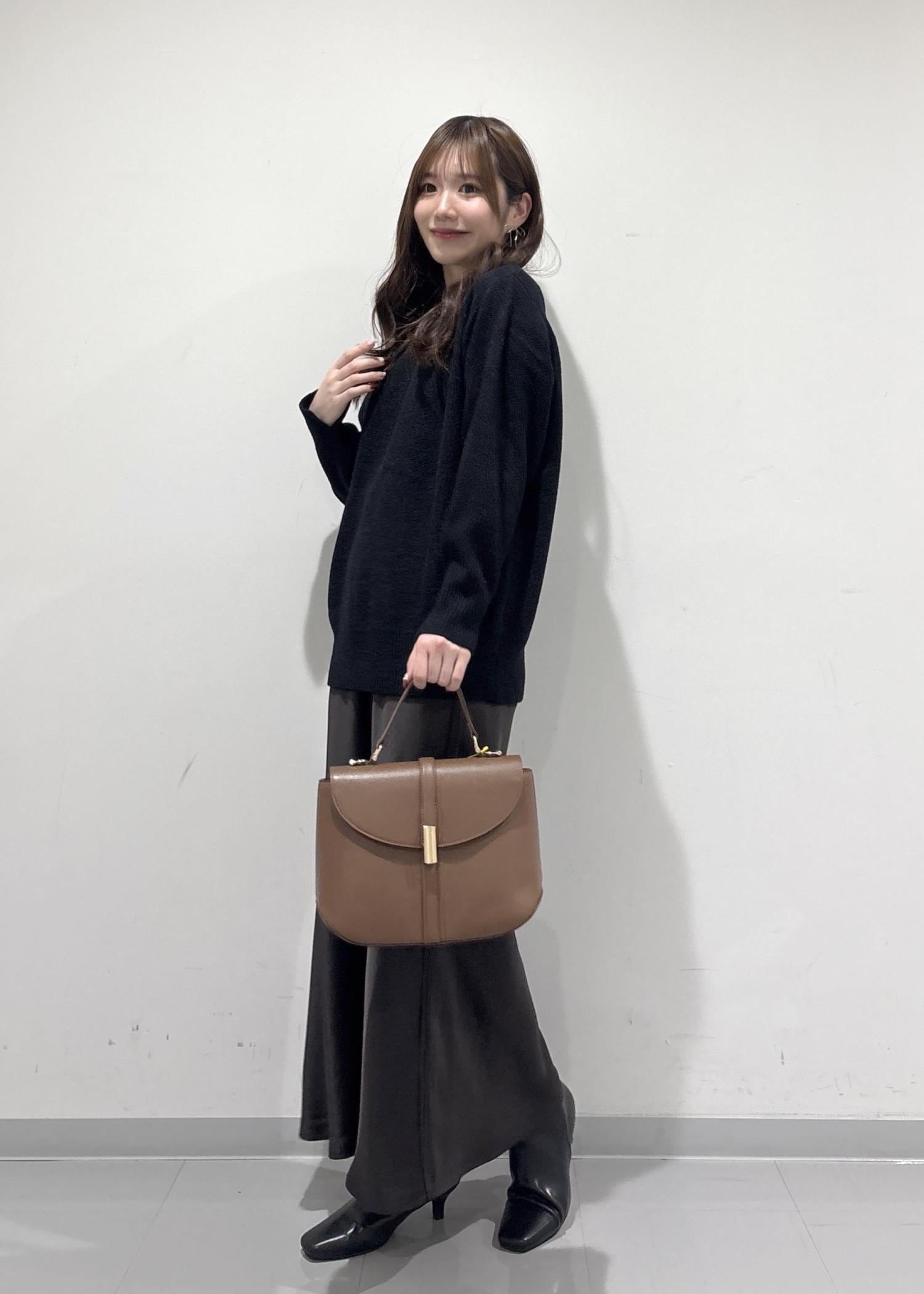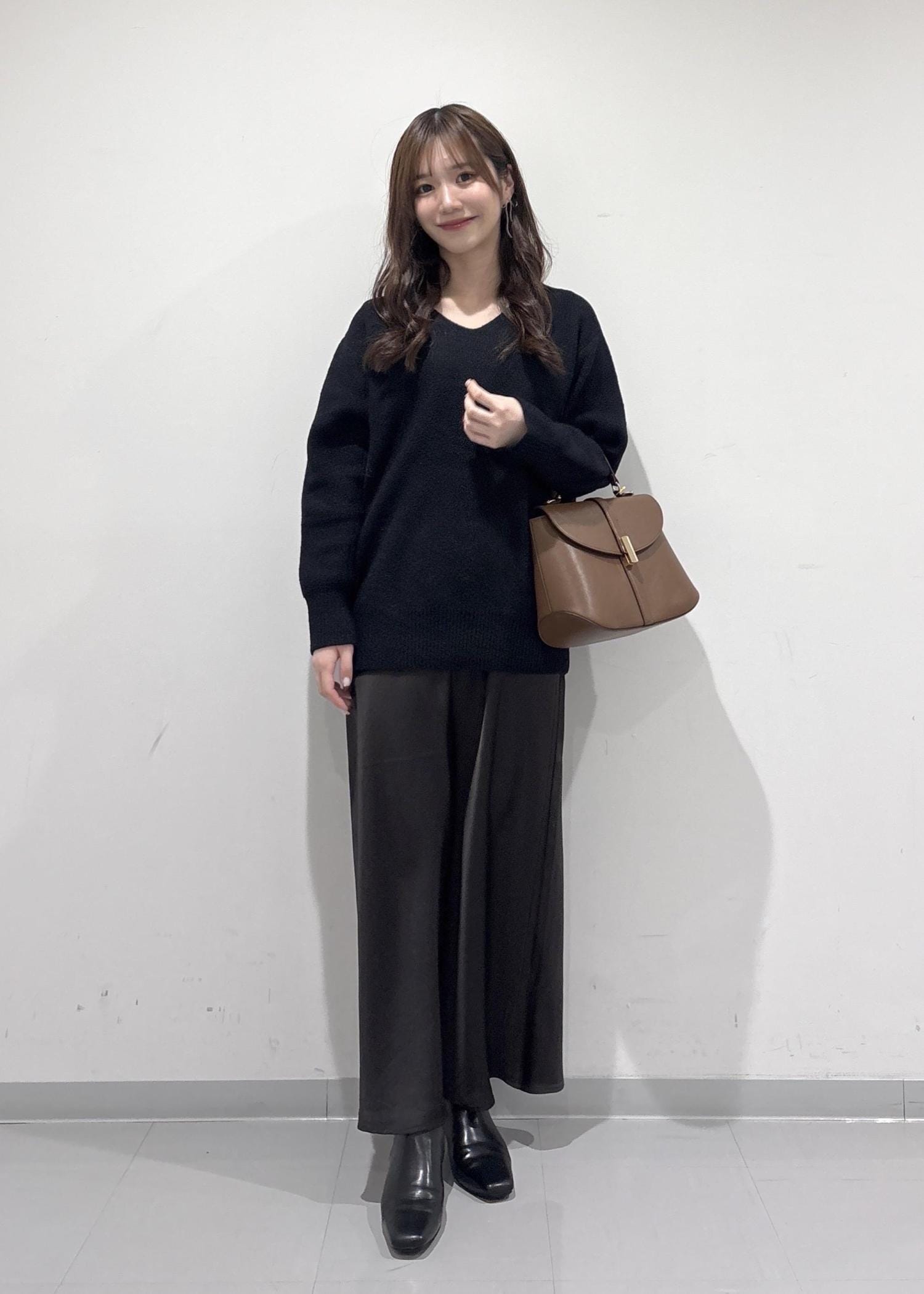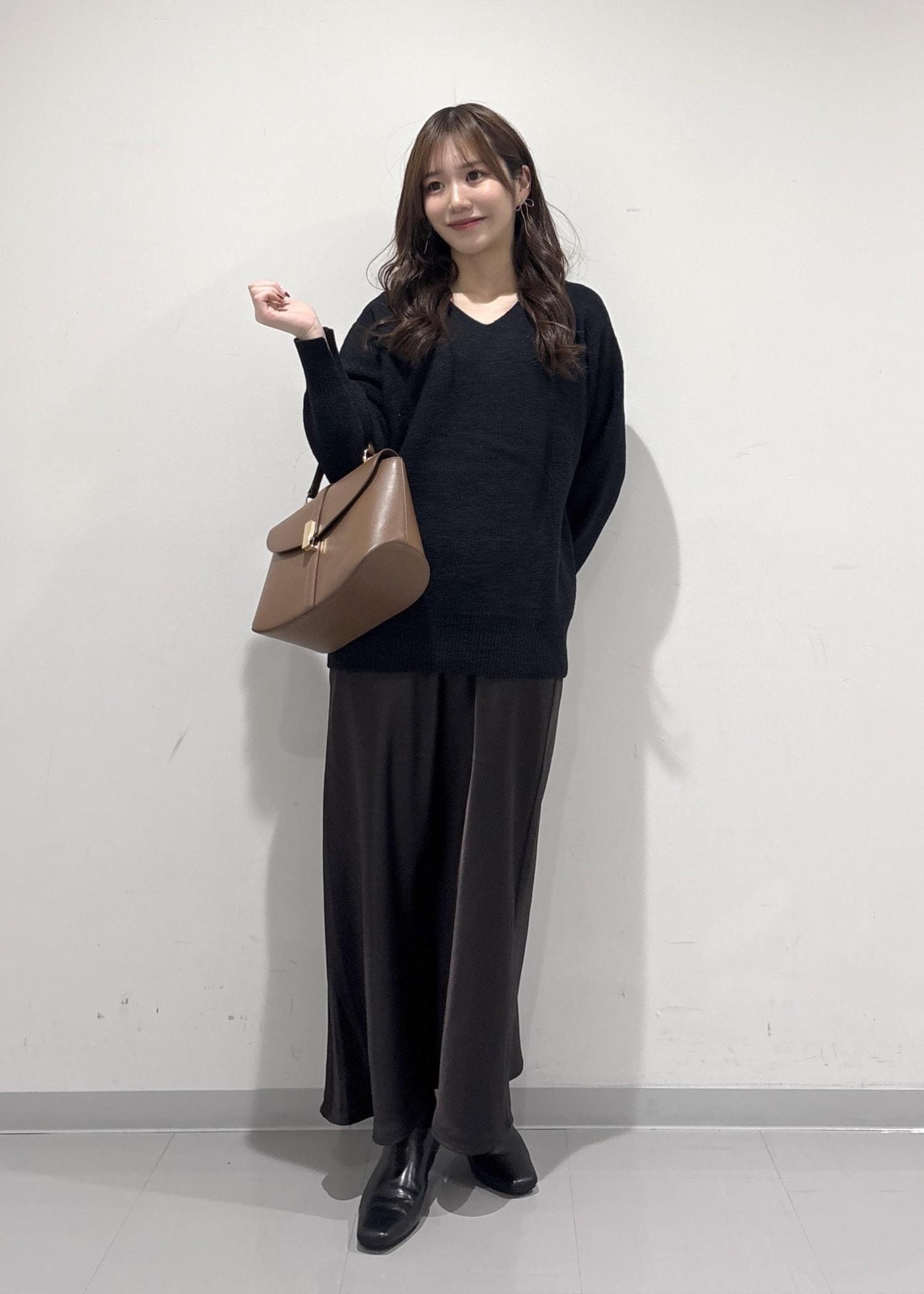 こちらのコーデは、黒色のワントーンで上品なお姉さん系をイメージしてみました!もちふわニットは、Vネックになっていてデコルテラインが綺麗に見えるのでお姉さん感がより増します!スカートは光沢感があるので上品な印象になってオススメです!短めのブーツでこなれ感を出して、ブラウンのバッグで全体を締めてみました!