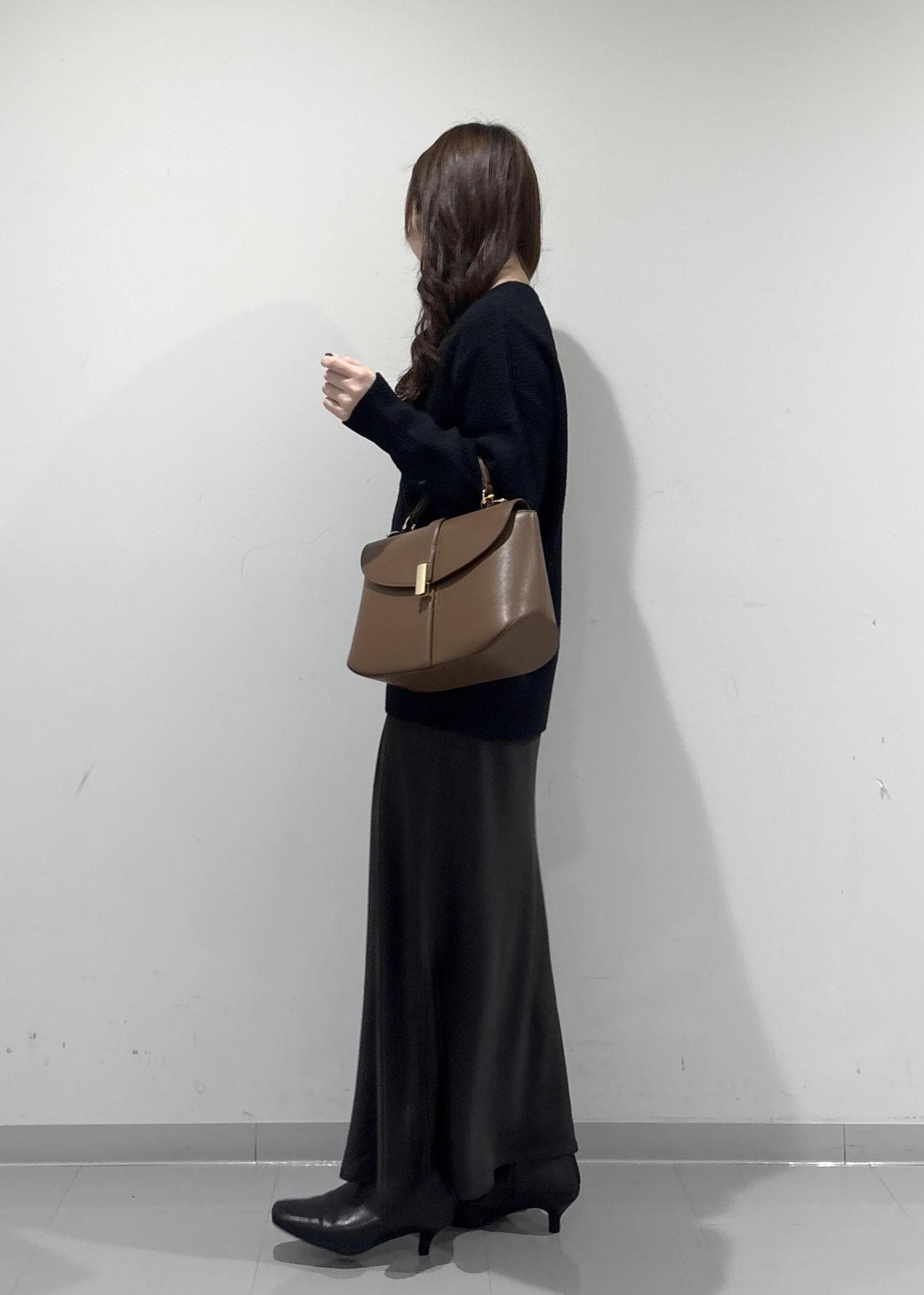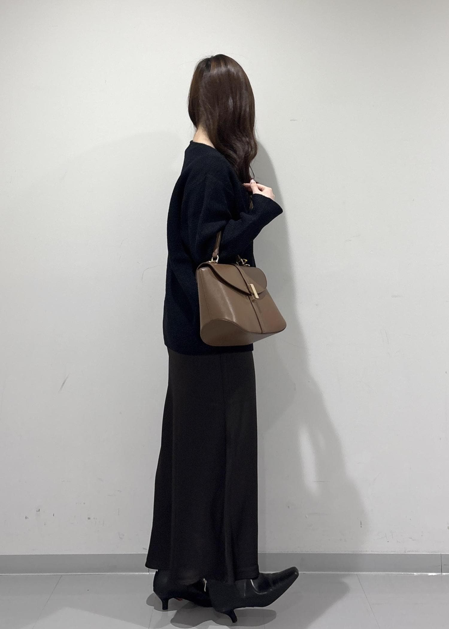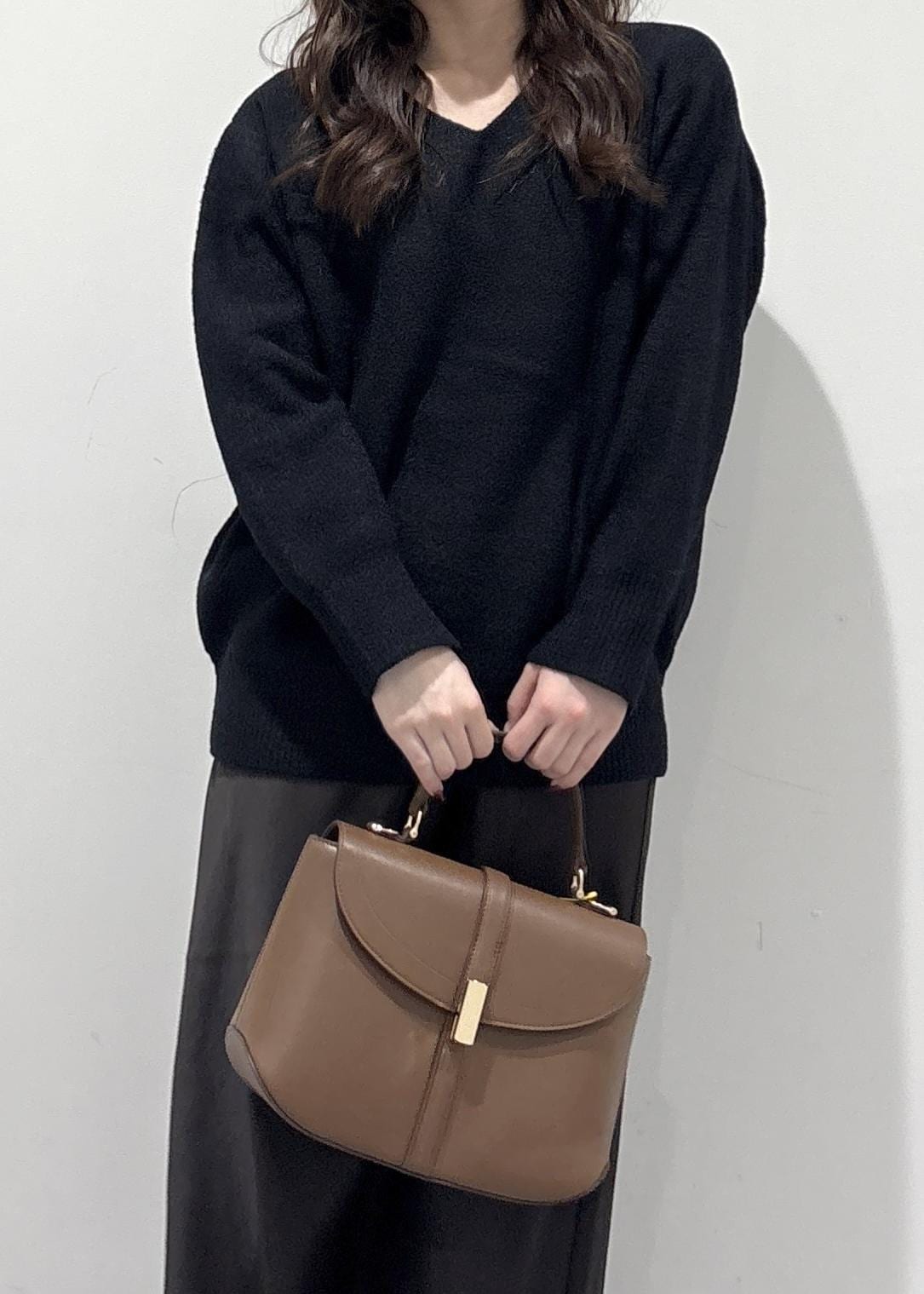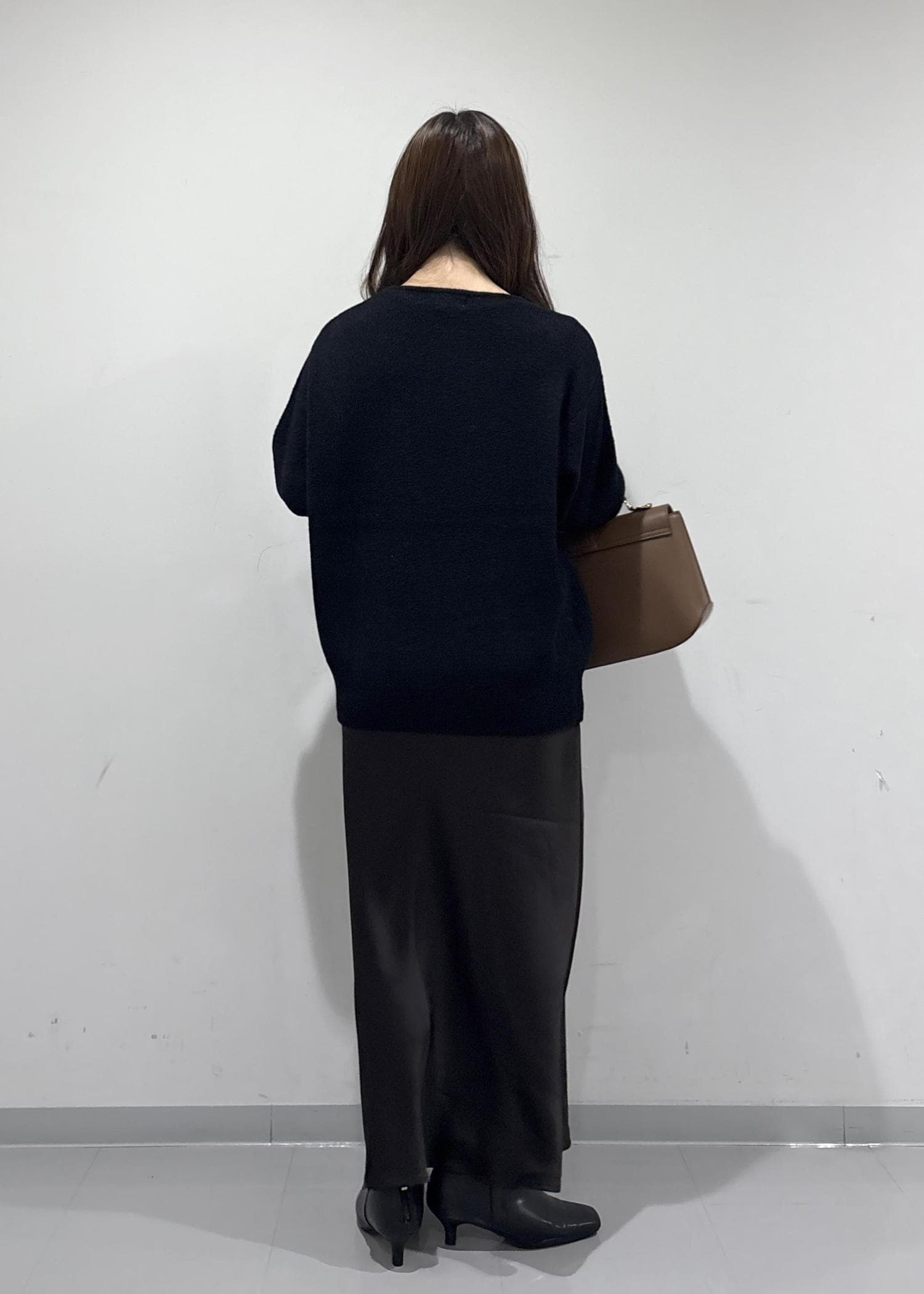 こちらのコーデは、黒色のワントーンで上品なお姉さん系をイメージしてみました!もちふわニットは、Vネックになっていてデコルテラインが綺麗に見えるのでお姉さん感がより増します!スカートは光沢感があるので上品な印象になってオススメです!短めのブーツでこなれ感を出して、ブラウンのバッグで全体を締めてみました!