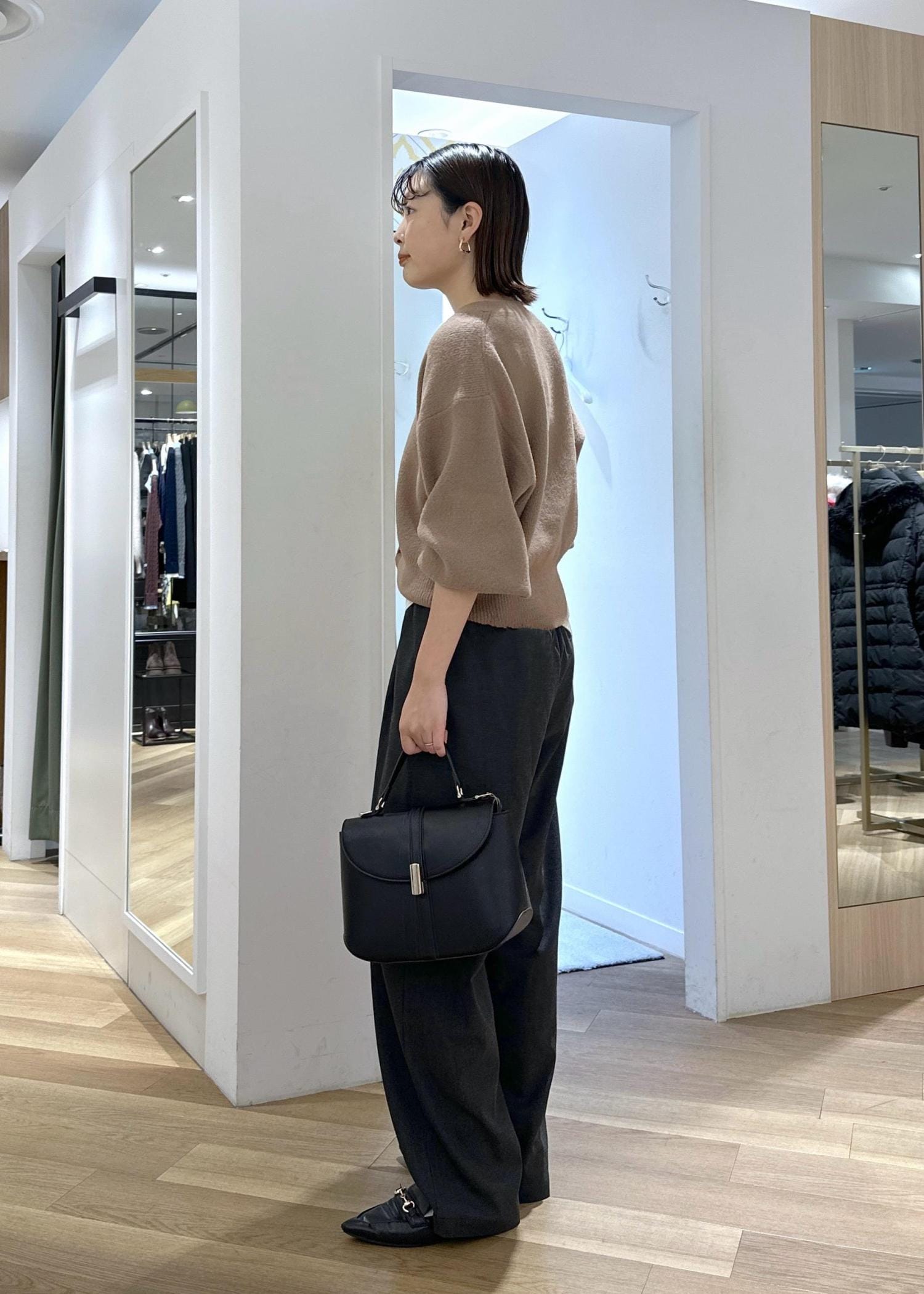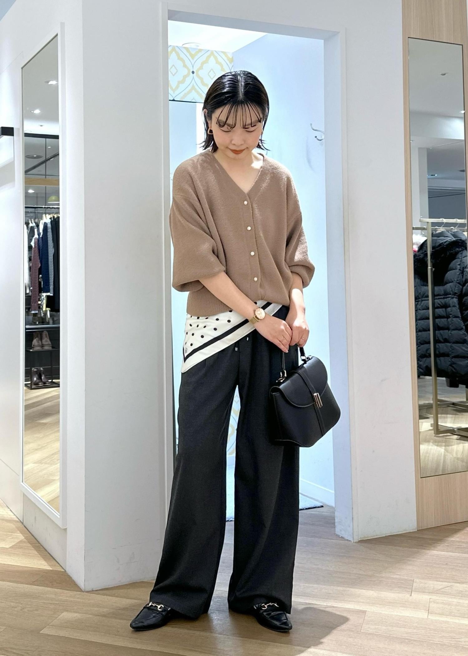 オレンジ味のあるブラウンに、グレーのパンツで優しい印象に。小物はブラックで締めて大人カジュアルなスタイリングにしてみました。