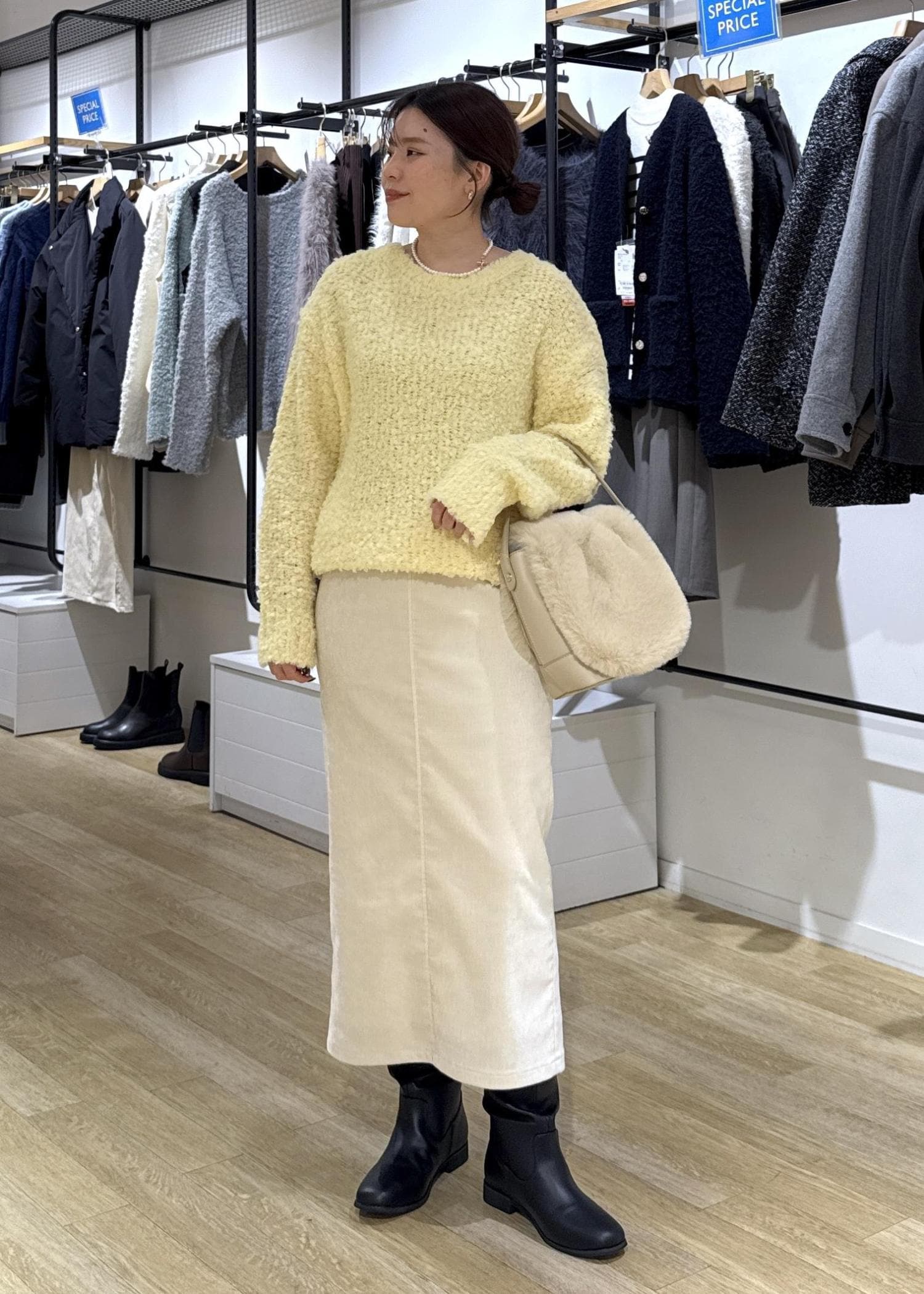 コートインには春に向けておすすめのイエローのカラーを合わせて、冬の寒い時期でも気持ちも明るく、おでかけしたくなるコーデにしてみました!