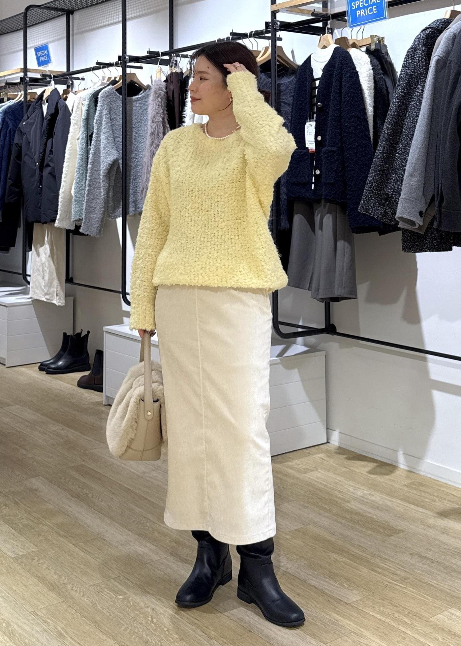 春に向けておすすめのイエローのカラーを合わせて、冬の寒い時期でも気持ちも明るく、おでかけしたくなるコーデにしてみました!