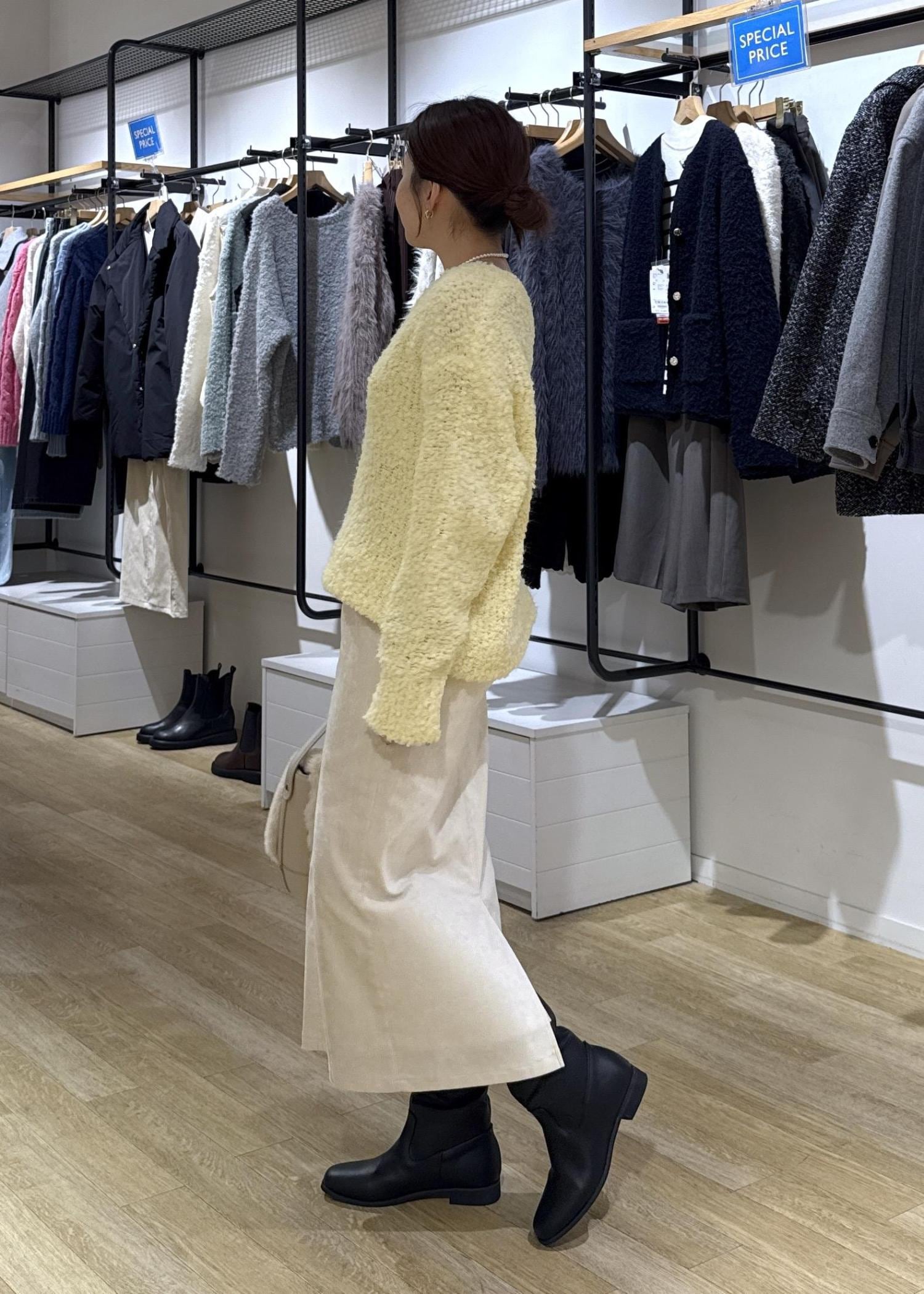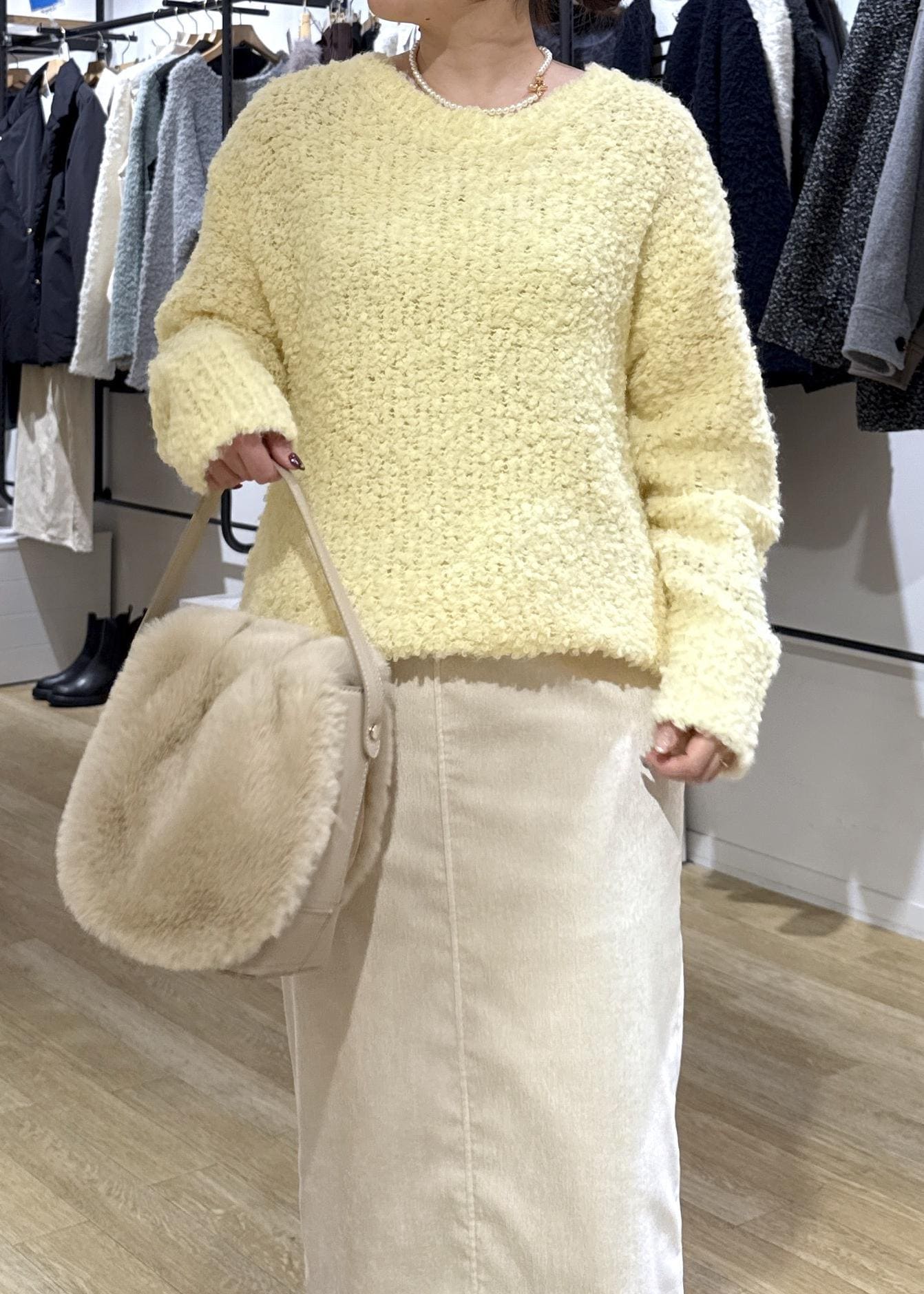とても着心地軽く、柔らかいブークレニットでチクチク感は感じにくいです。少し透かし編みになっているのでロンTや薄手のトップスを重ね着するのもおすすめです。 -