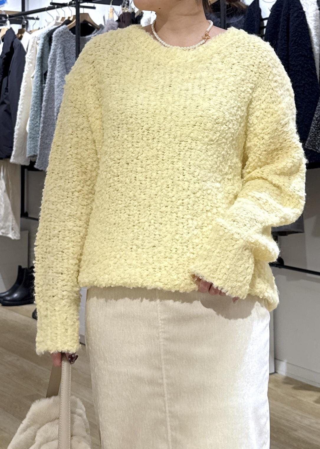 ROPÉ PICNICブークレカラーニットイエロー / F¥5,489レビュー着丈がヒップが隠れる長さで、袖丈も少し長めです。