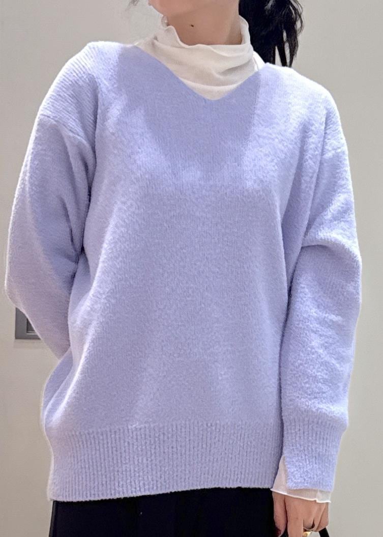 袖も身頃もゆったりとした着心地で、さらにVネックなのでシャツやシアートップスと重ねても合わせやすいです◎